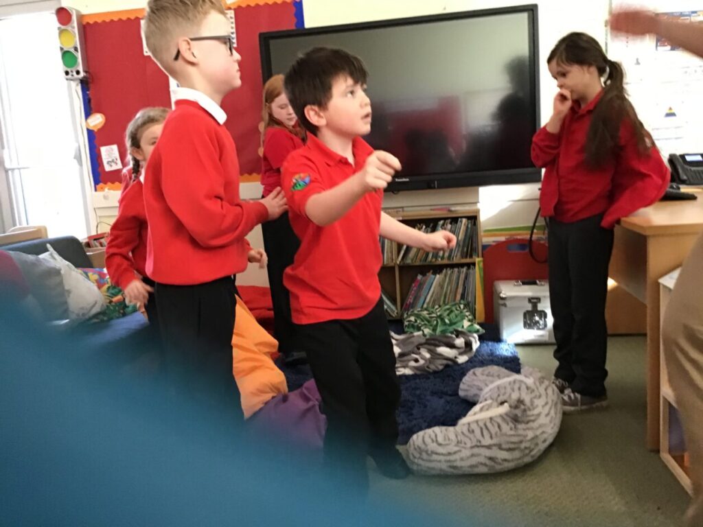 We were making up some dramas pretending to be astronauts in rockets and blasting off! We were also making similar sounds to the sounds we could hear outside using the musical instruments. – Ollie