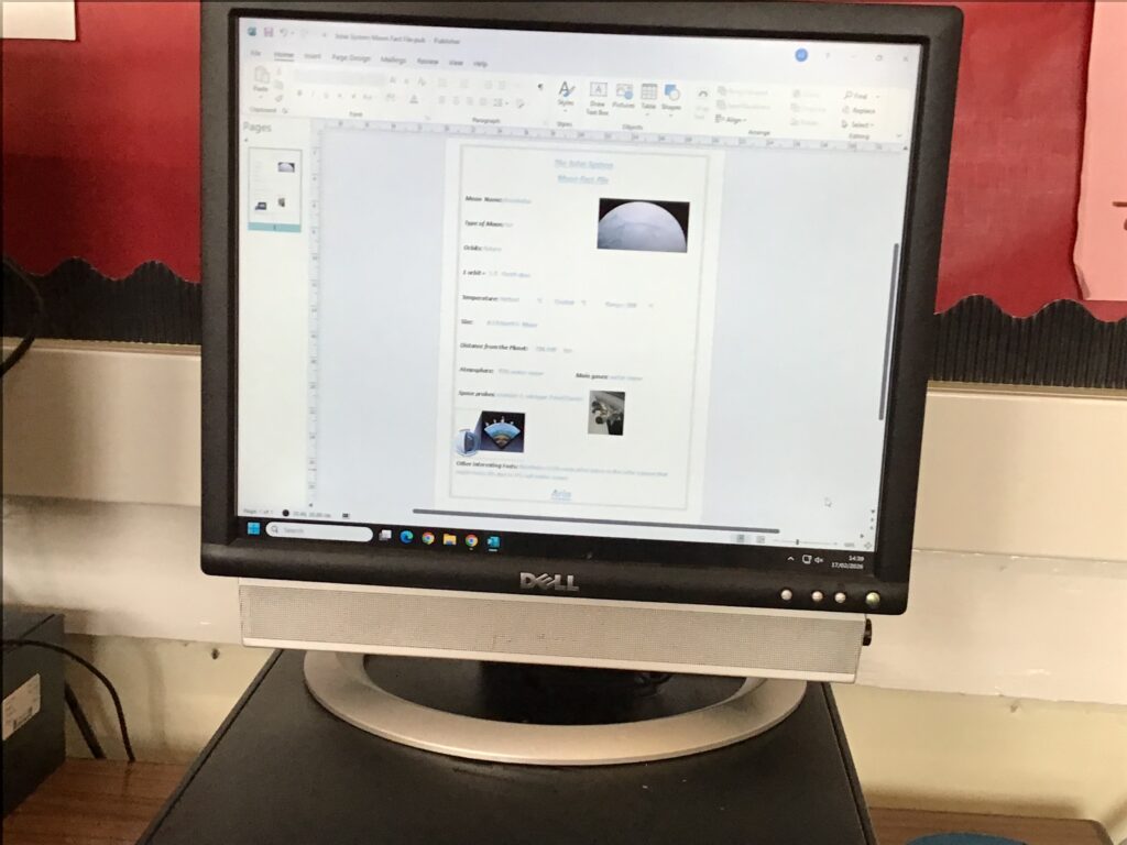 We were making fact files about moons and planets for our space topic. I made one for Uranus and one of it’s 28 moons called Miranda. – Aurelia