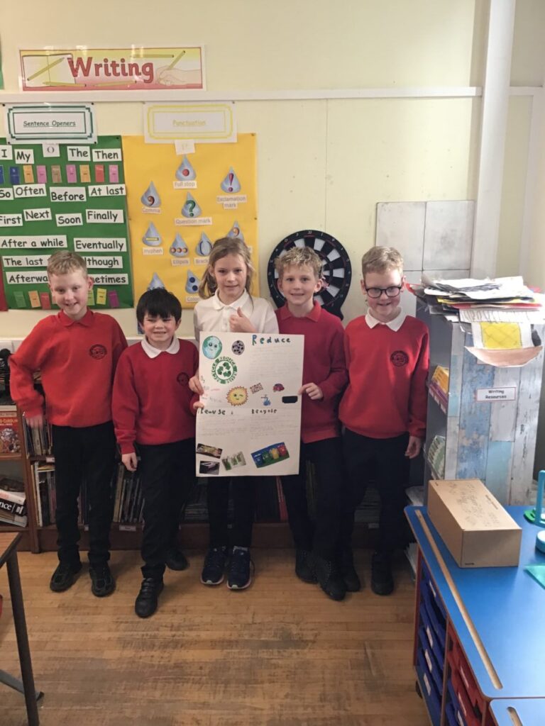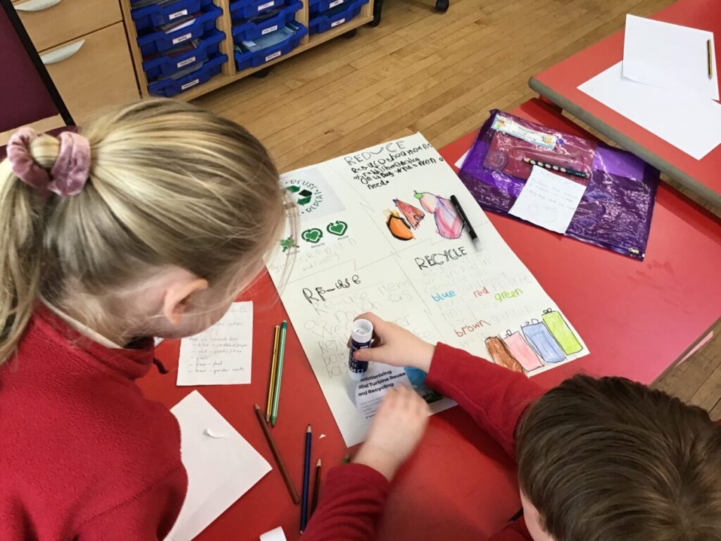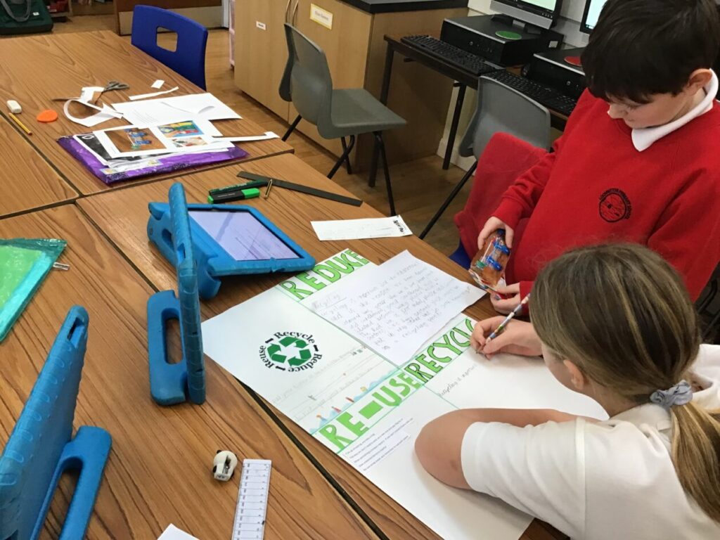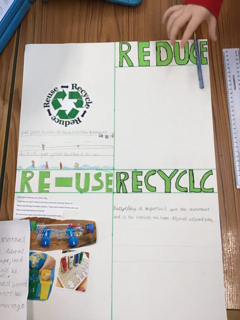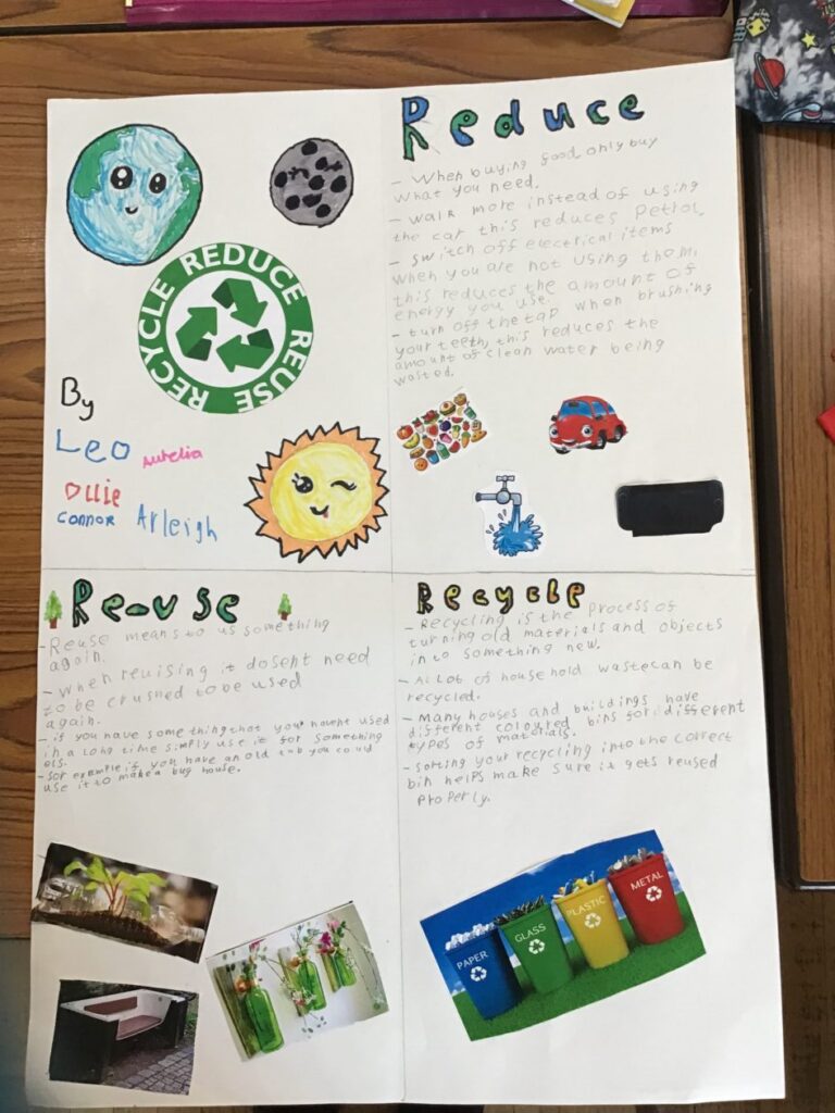 We were making posters of our new topic Reduce, Re-use and Recycle. We made these in groups, one group is still yet to finish. I enjoyed making these and drawing the pictures! – Aurelia