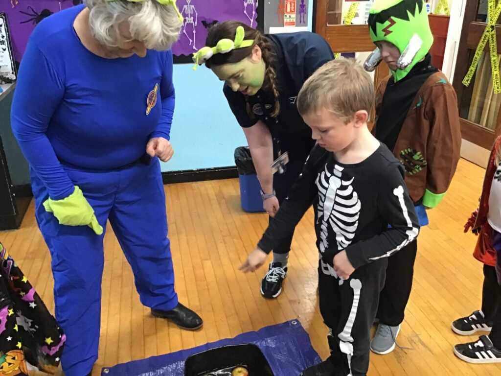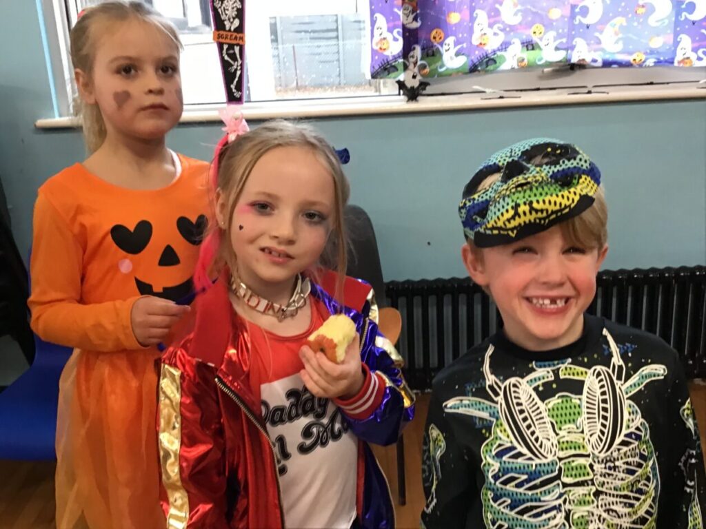 On Wednesday it was our Halloween party at Lochrutton! First thing we did was a parade around the room where we showed everyone our costumes. We played ‘scary statues’, ‘spooky corners’, ‘chilly musical chairs’ and then we had a snack! We then played pass the pumpkin. The party was a lot of fun! – Asa