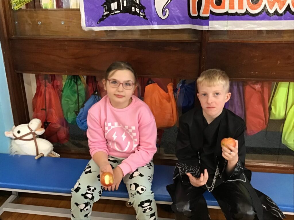 We had a Halloween party at Lochrutton. We first had a parade to show off our costumes, we played musical statues and musical chairs. We then enjoyed a snack. We then played dookin’ for apples, pass the pumpkin and put the wart on the witch. Devyn’s favourite part was seeing everyone’s costumes and Angus’ was pass the pumpkin. It was a fun party!! – Devyn & Angus
