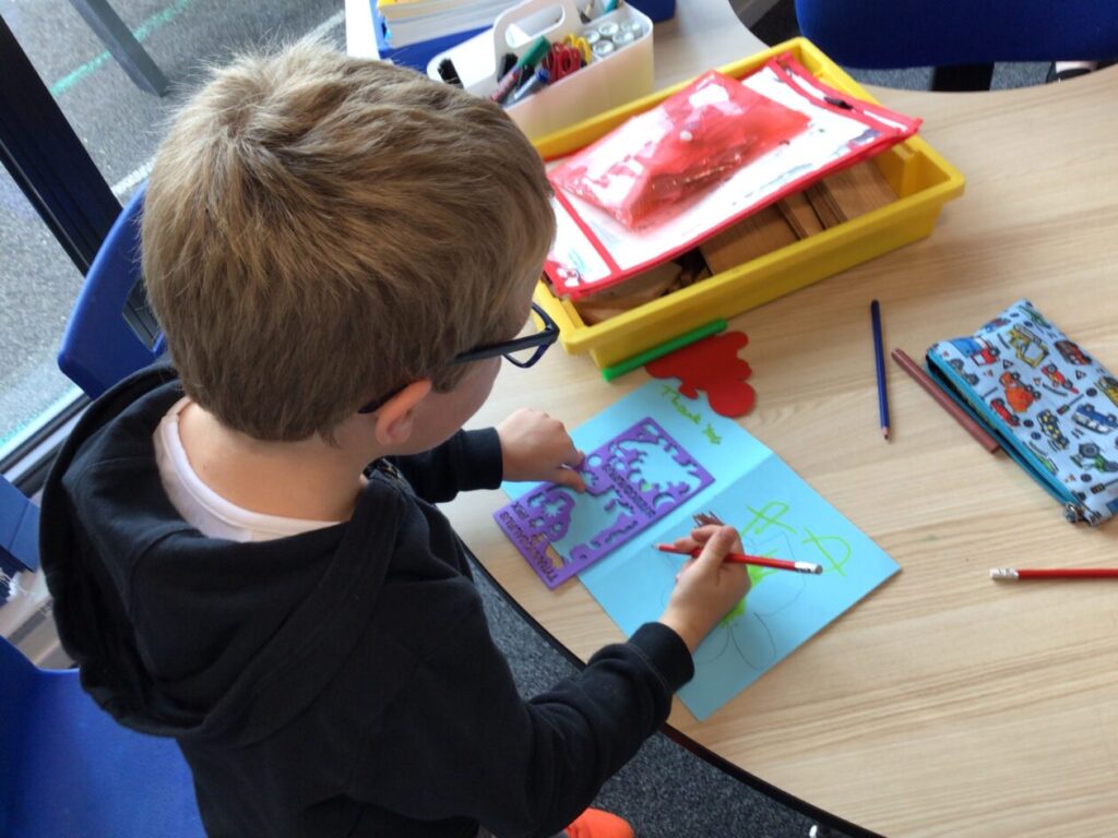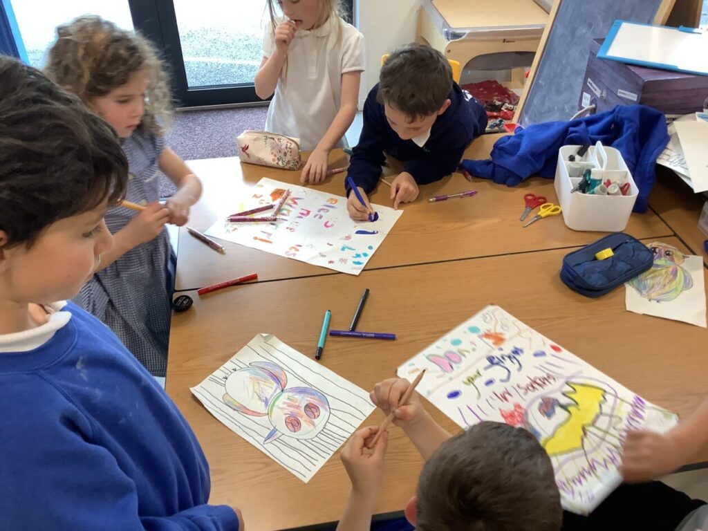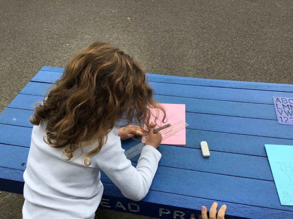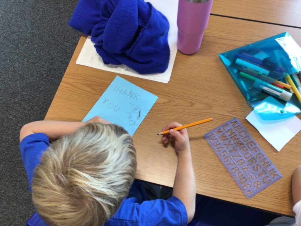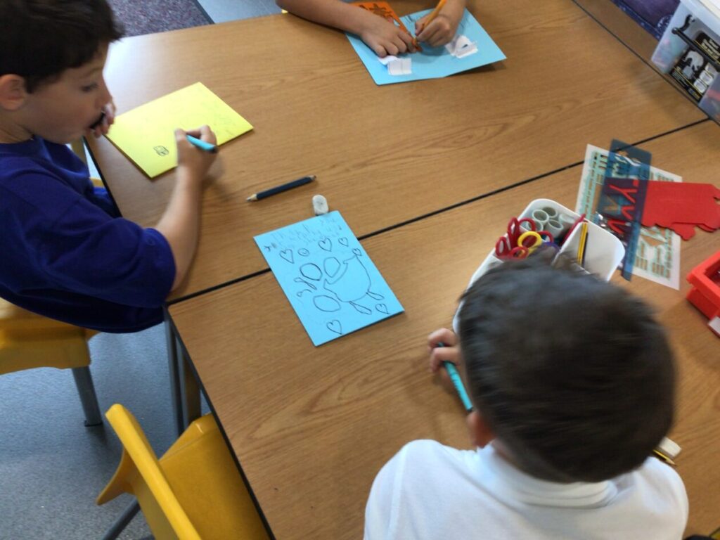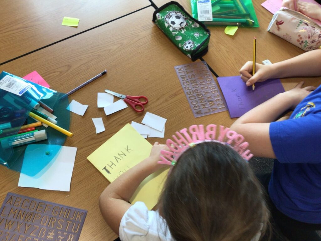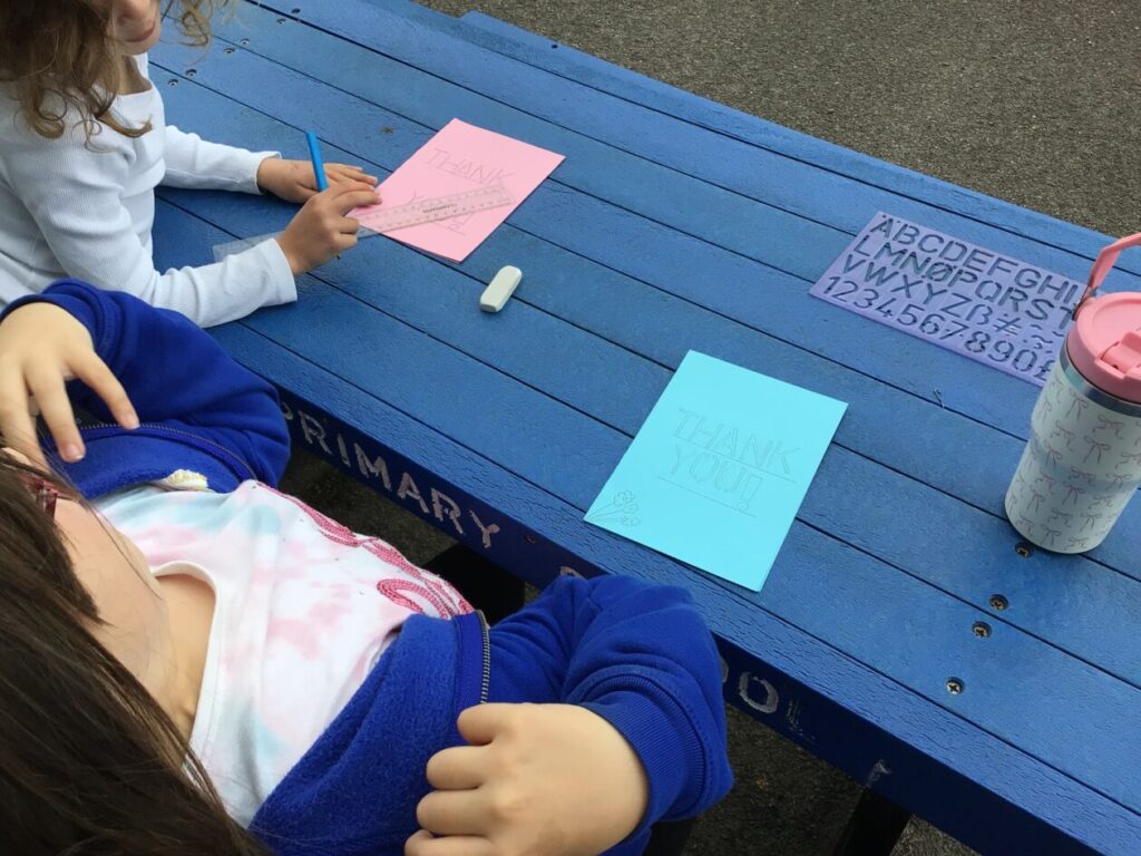 We were making thank you cards for people who come in and help out around the school. – Asa & Bessie