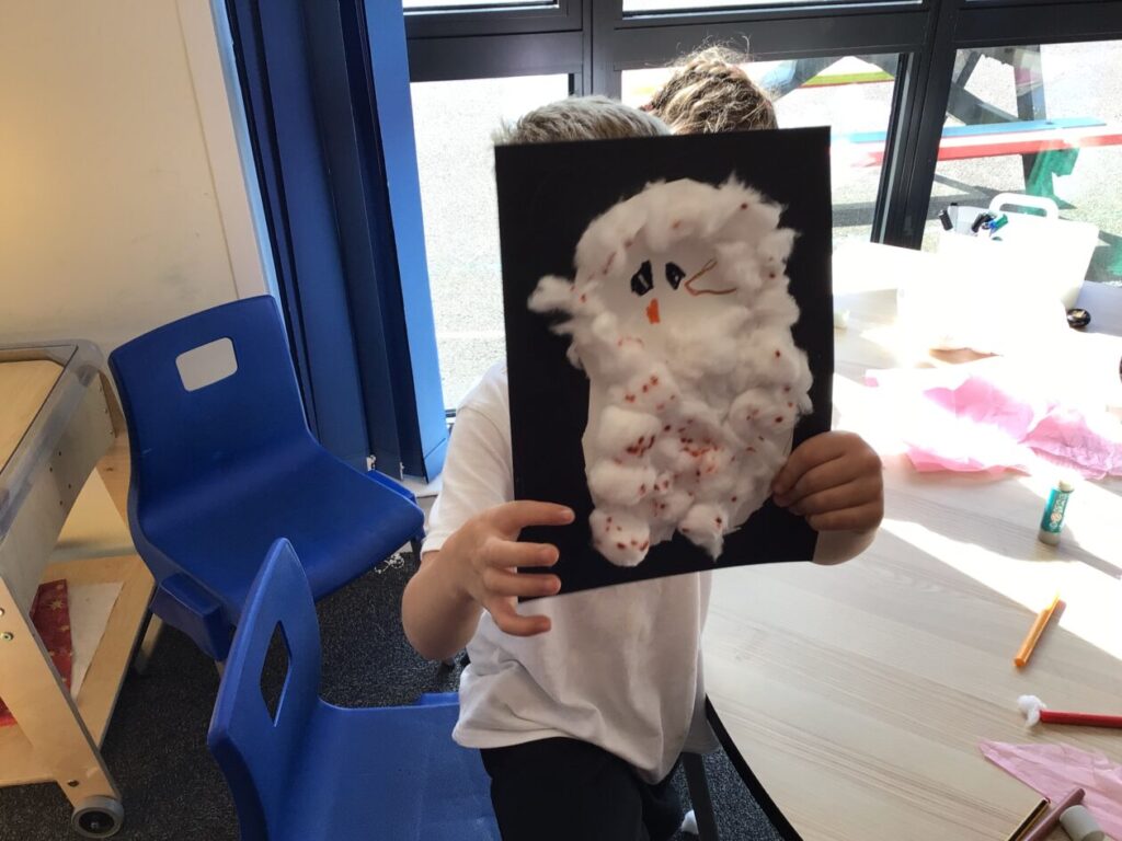 We listened to the story ‘The Lighthouse Keepers Lunch’ then we made lighthouses using oil pastels and paint. – Zamari