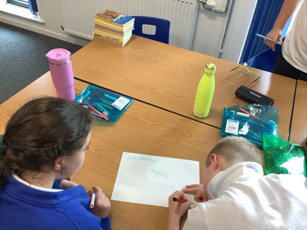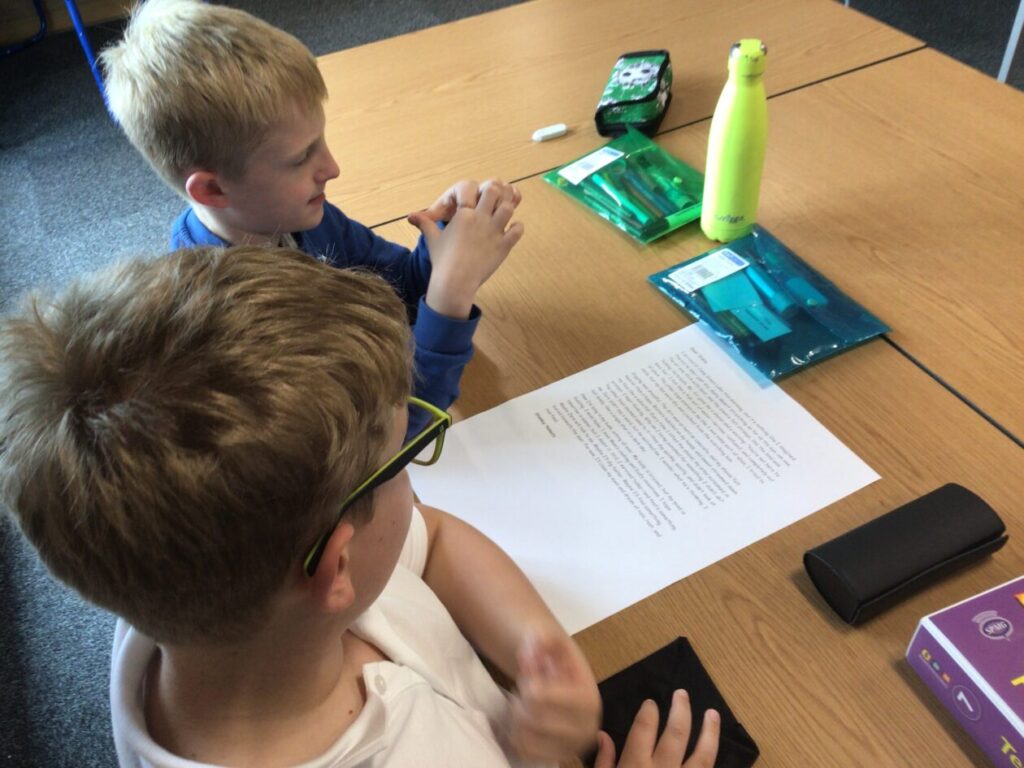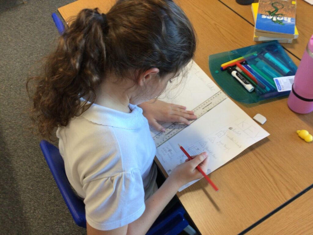 We were reading a description for Holes on Stanley’s first day then highlighting in different colours things like similes, alliterations, interesting punctuation, Stanley’s thoughts and feelings and sentence starters. – Asa