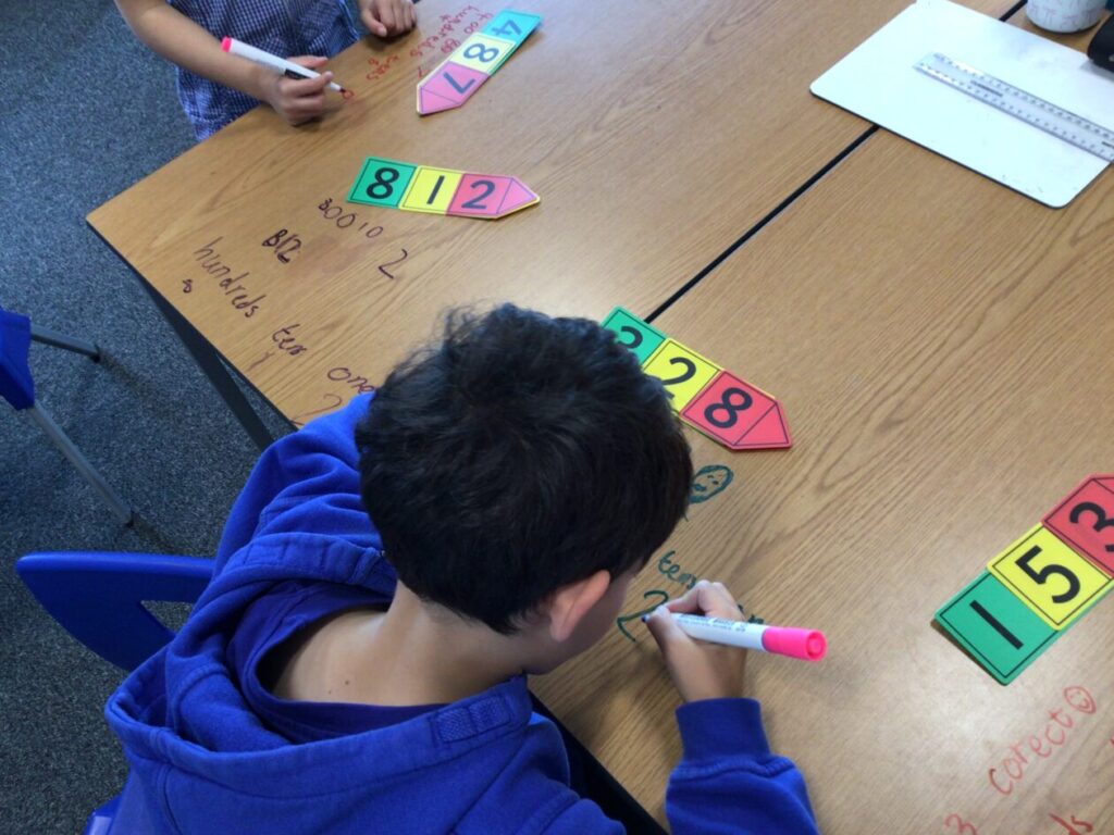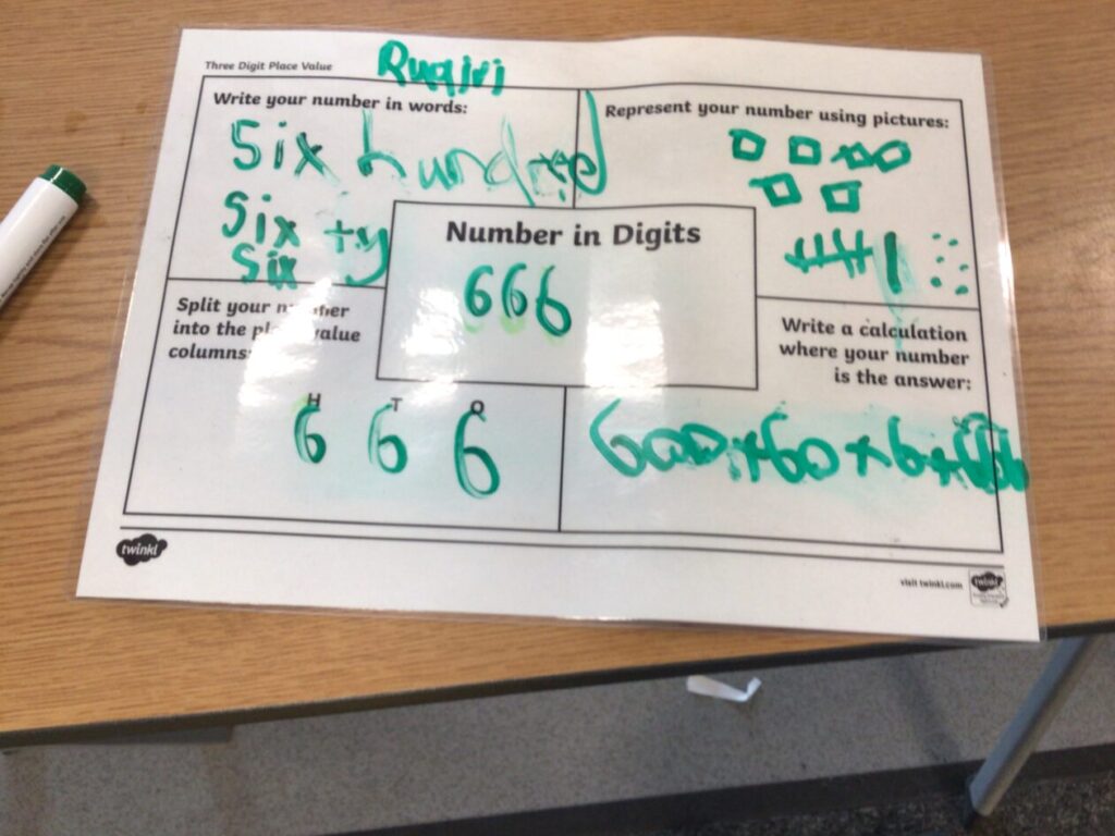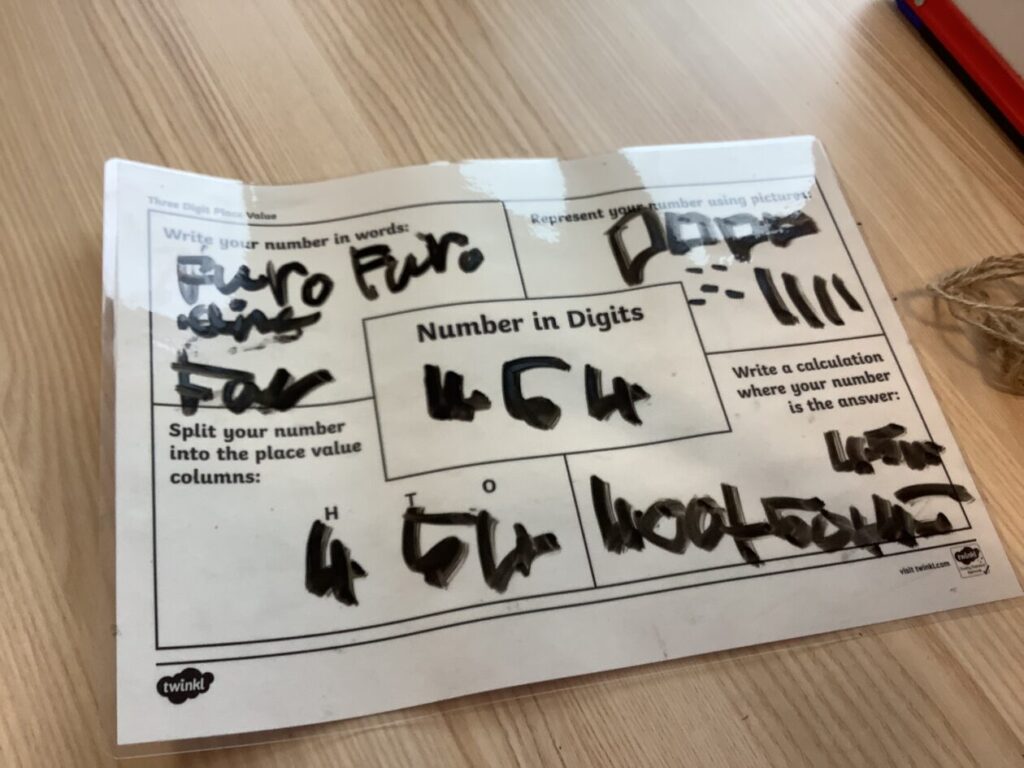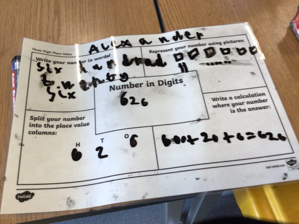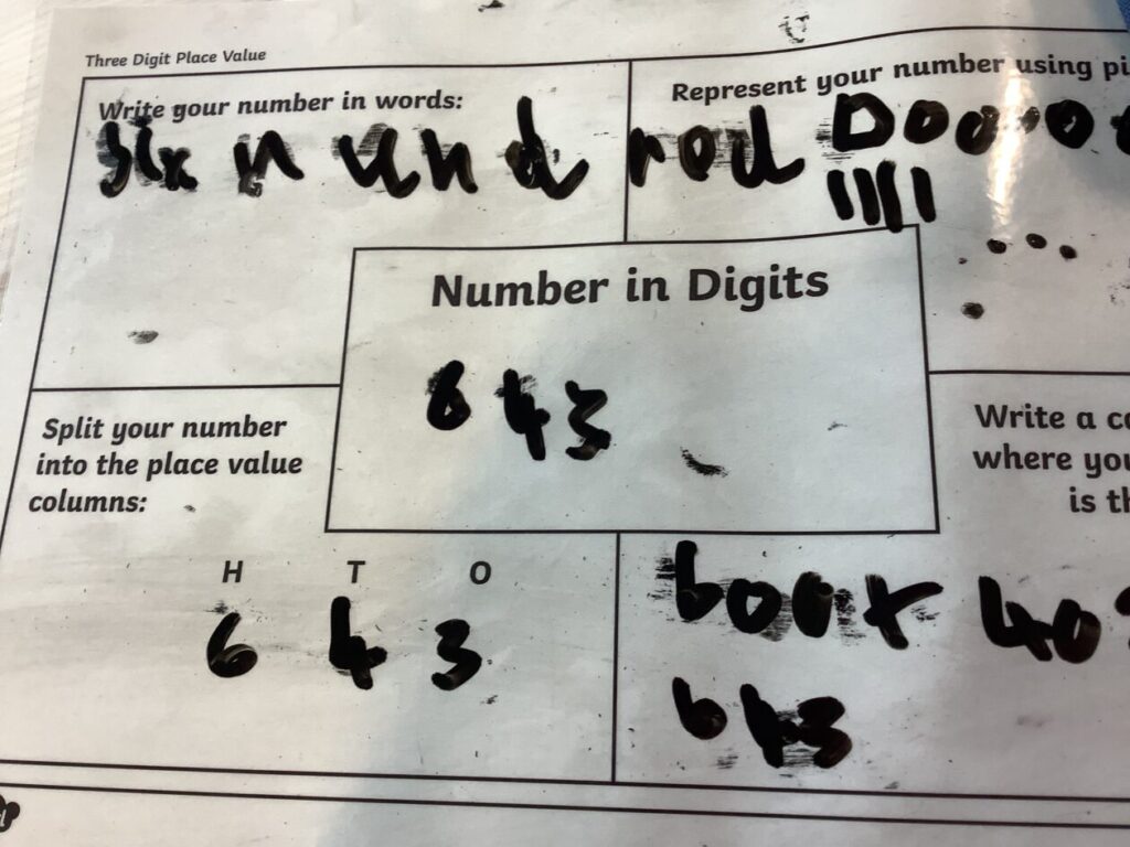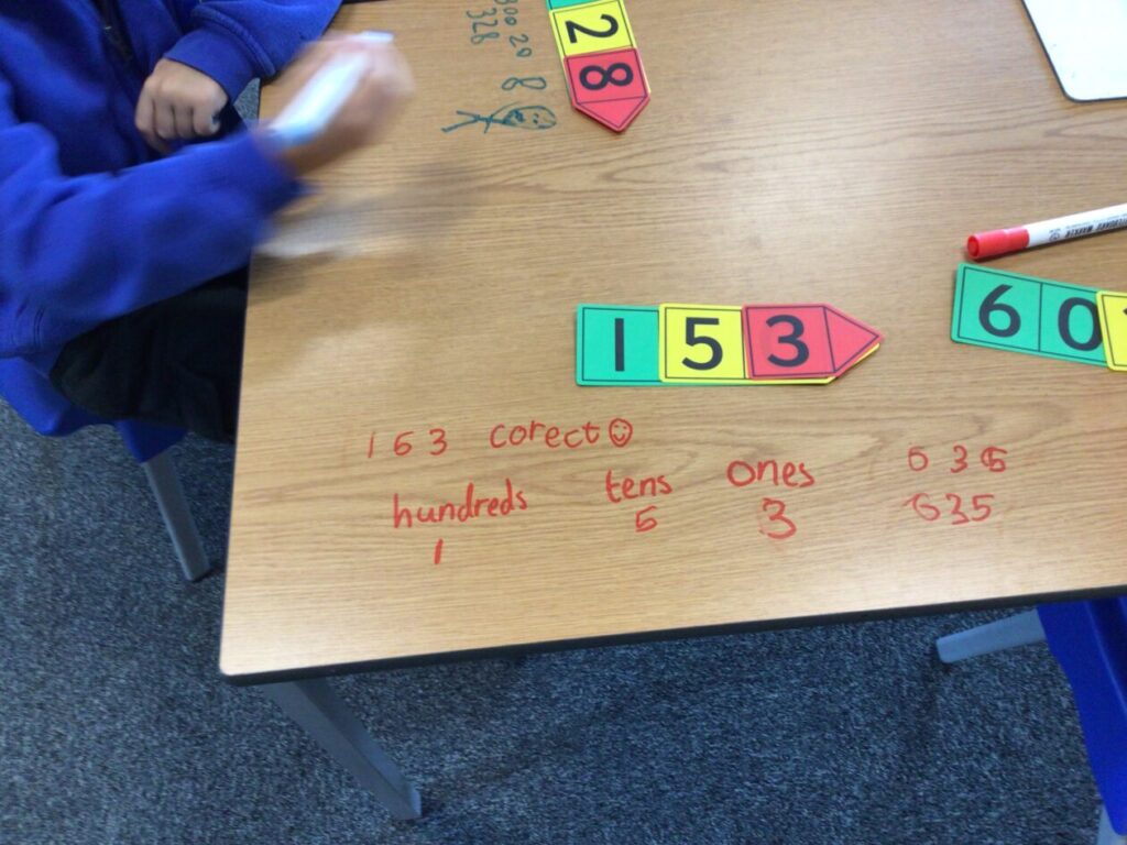 This maths group were doing some place value. They had to split up the number into hundreds, tens and ones. They got to write on the table with special pens. – Asa