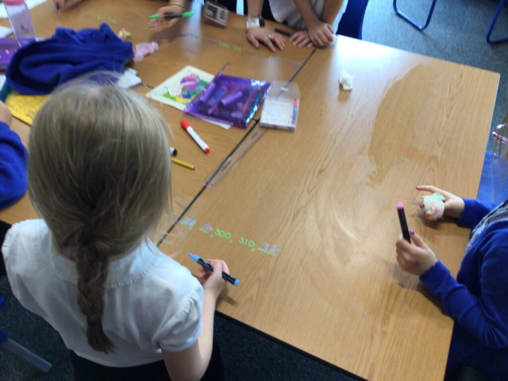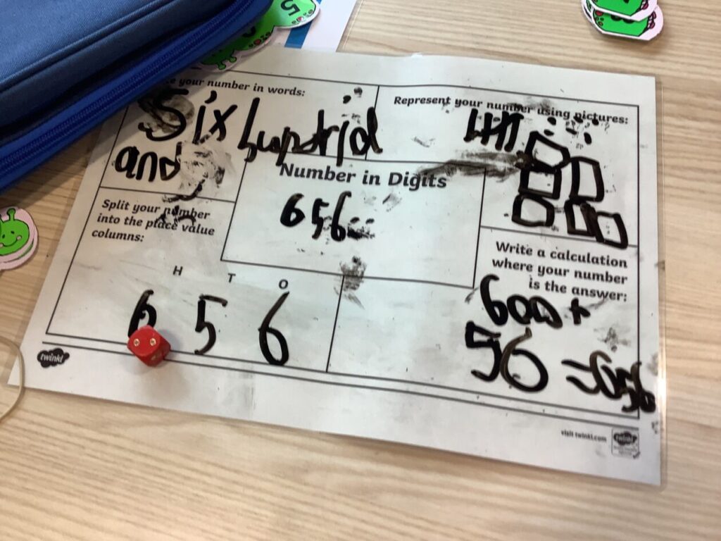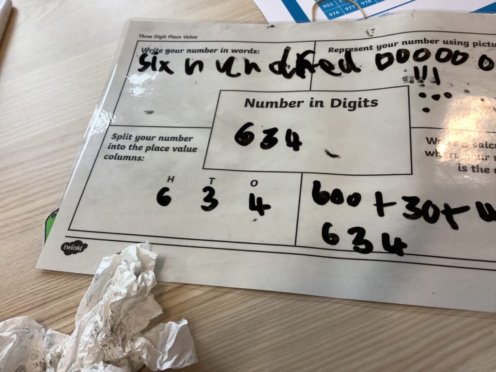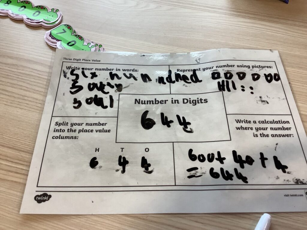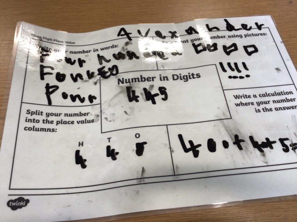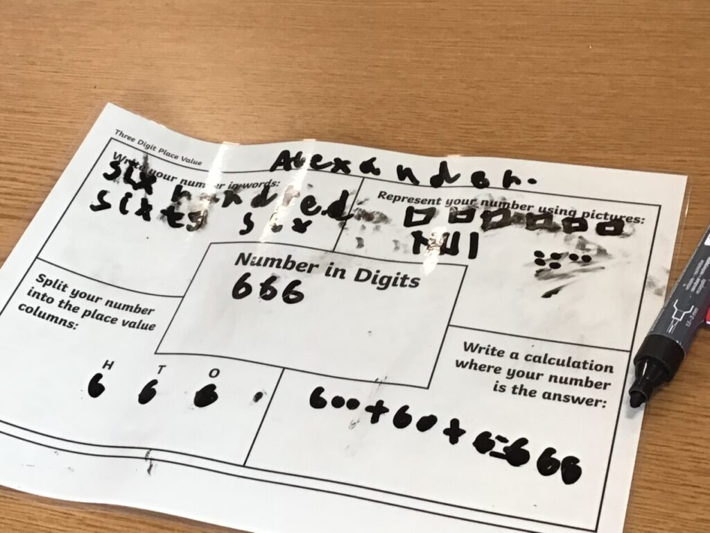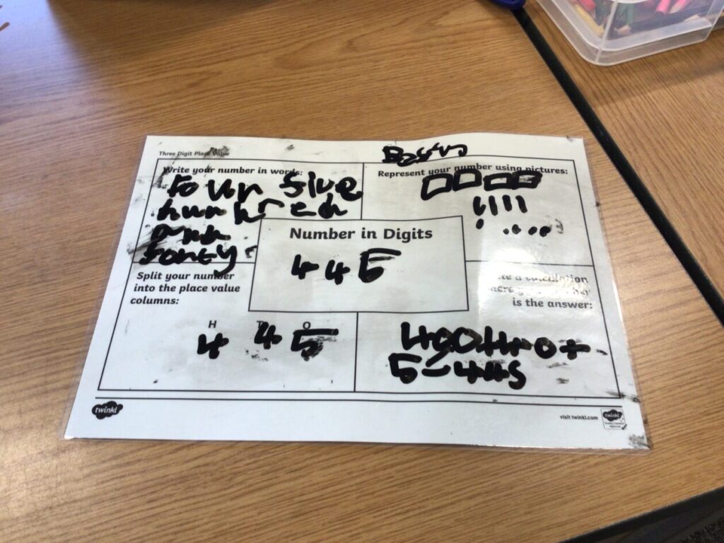 This maths group were doing some place value. They had to split up the number into hundreds, tens and ones. They got to write on the table with special pens. – Asa