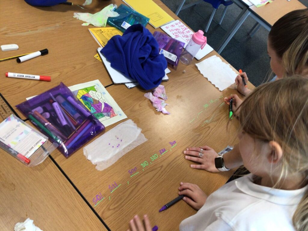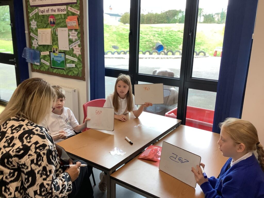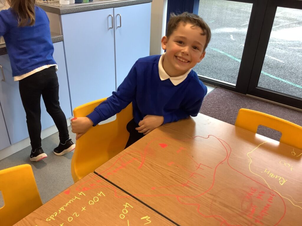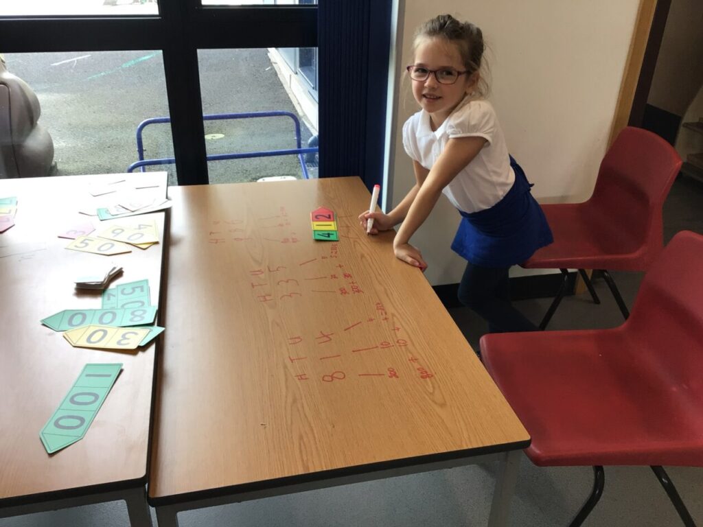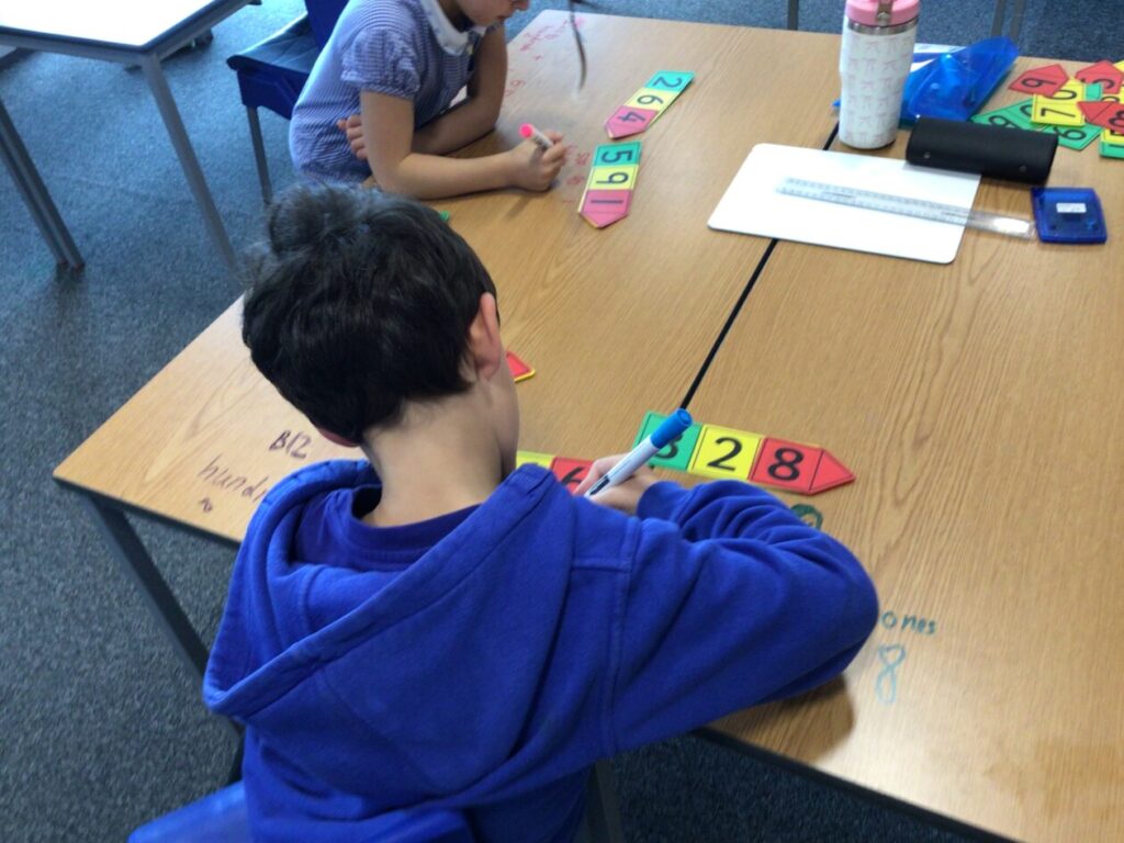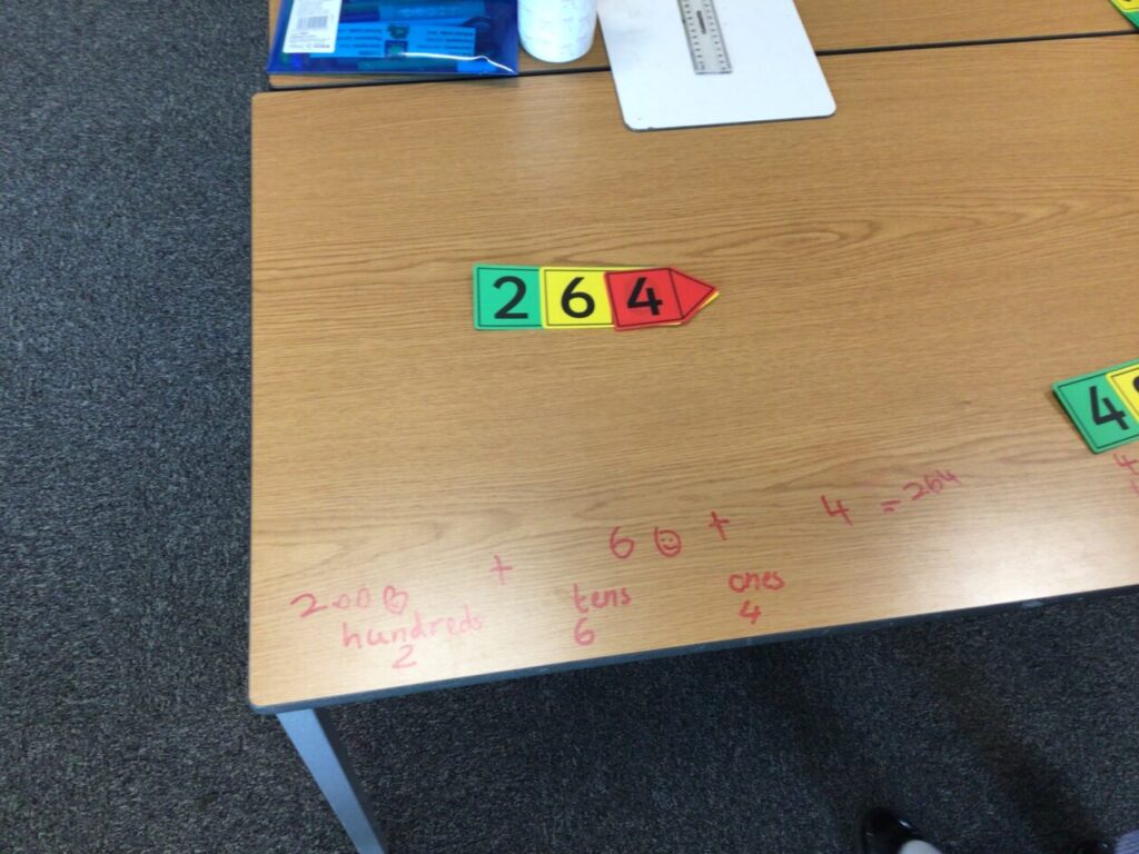 This maths group were doing some place value. They had to split up the number into hundreds, tens and ones. They got to write on the table with special pens. – Asa
