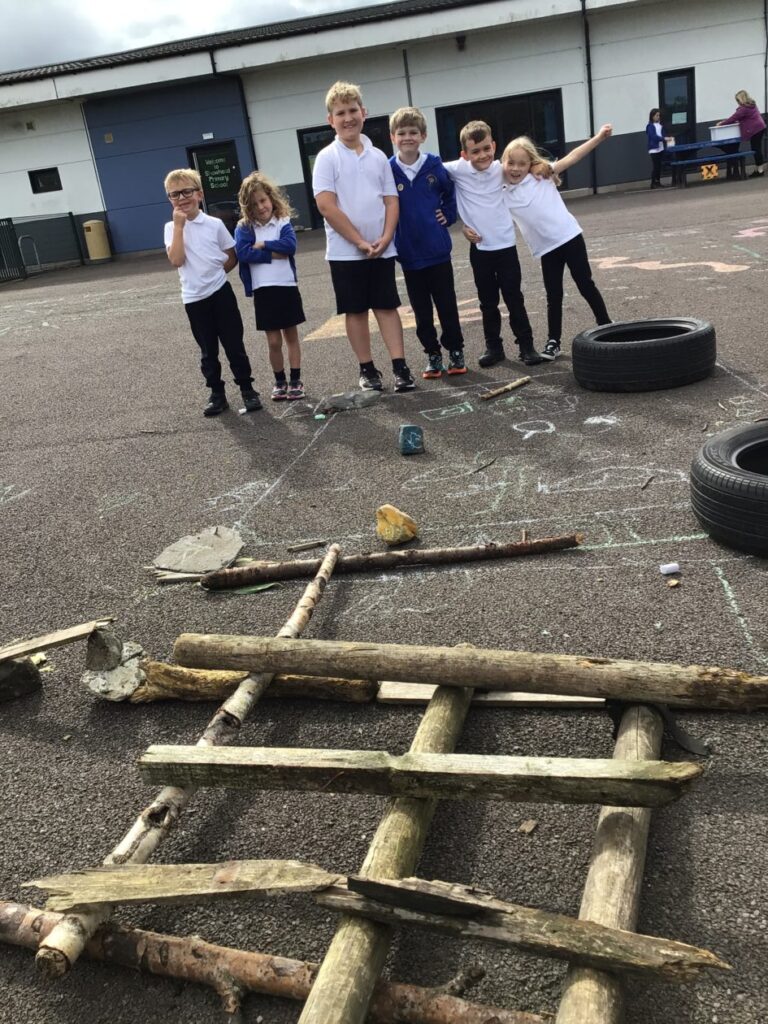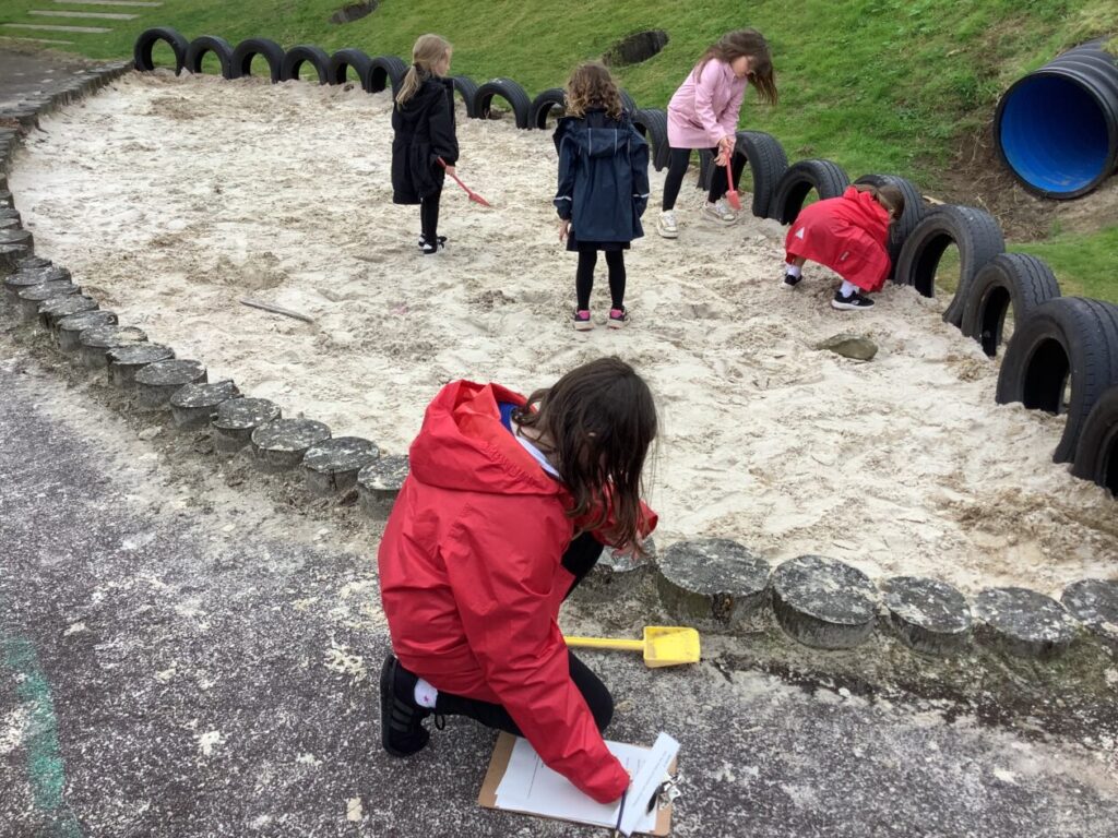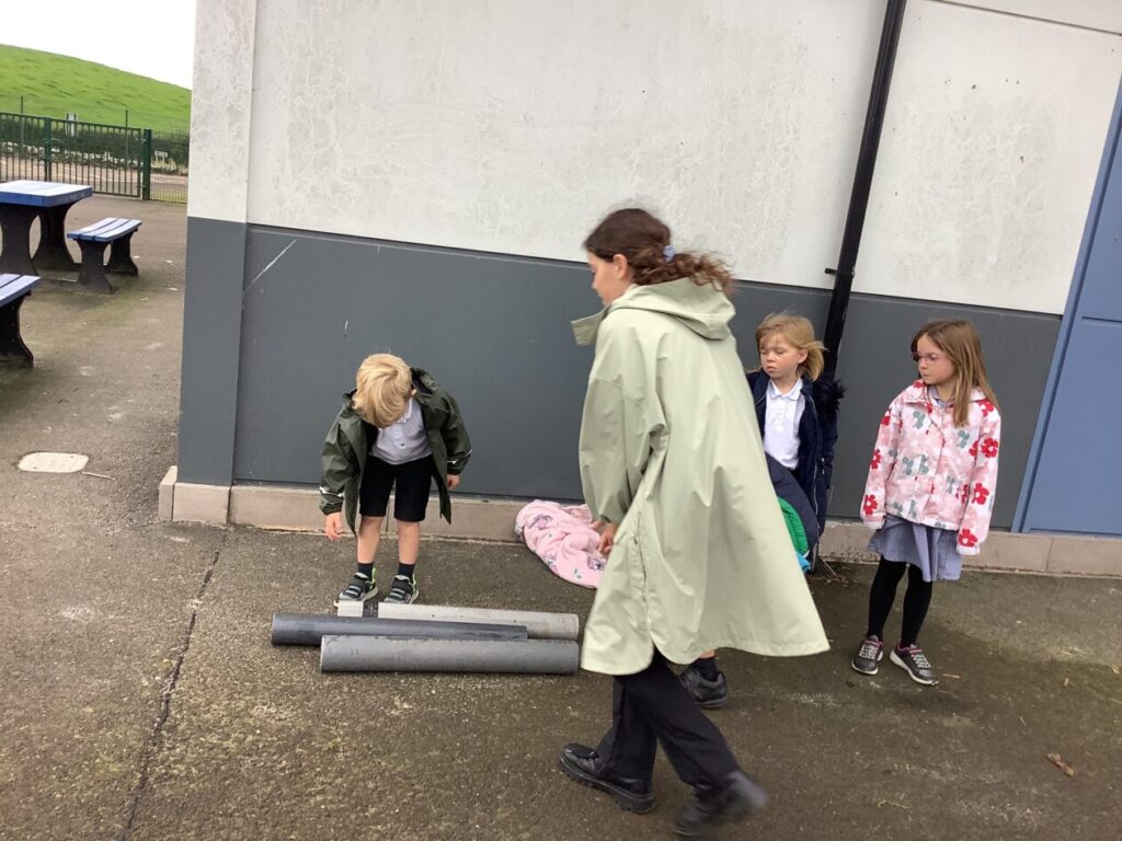 We done a carousel of activities outside for Holes. We had a scavenger hunt in the sandpit and on the field. We transferred the water from one bowl to another. We played an unlucky and lucky game. We also built some dens. – Ella & Ruairi