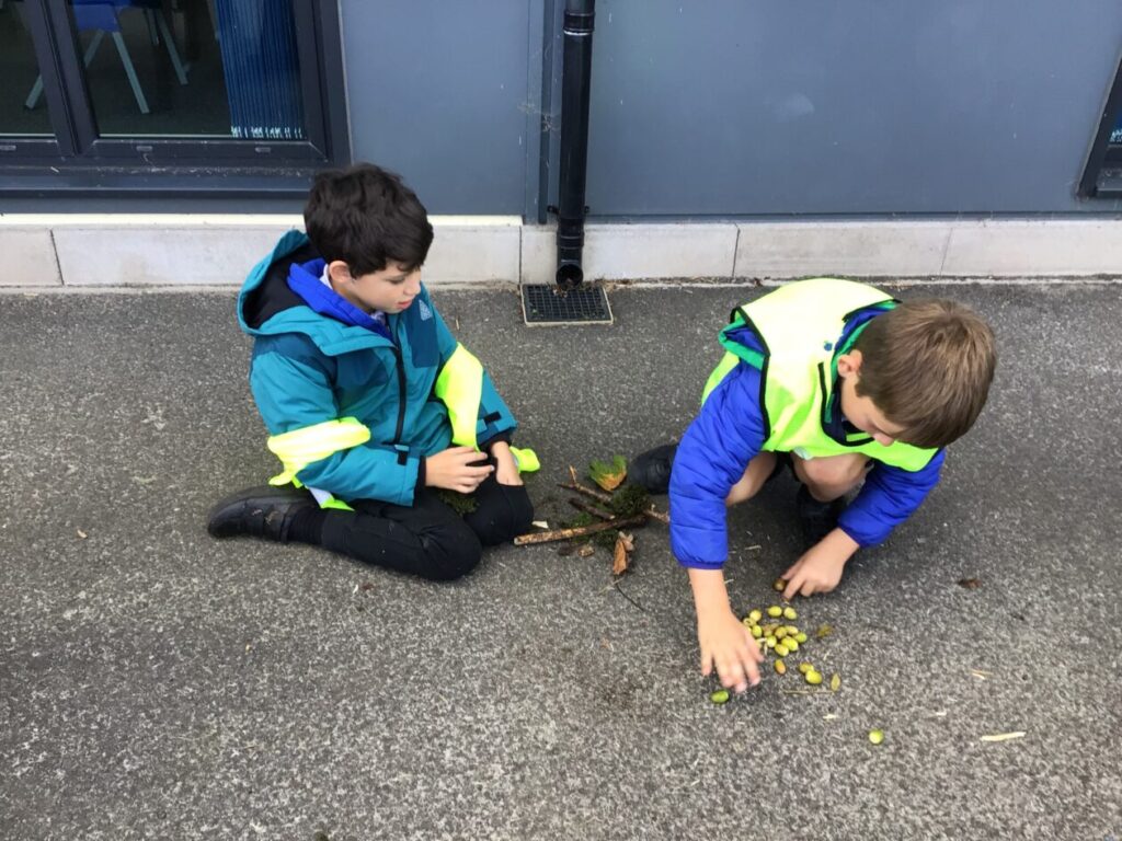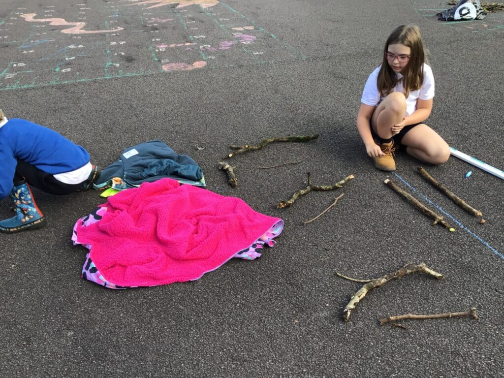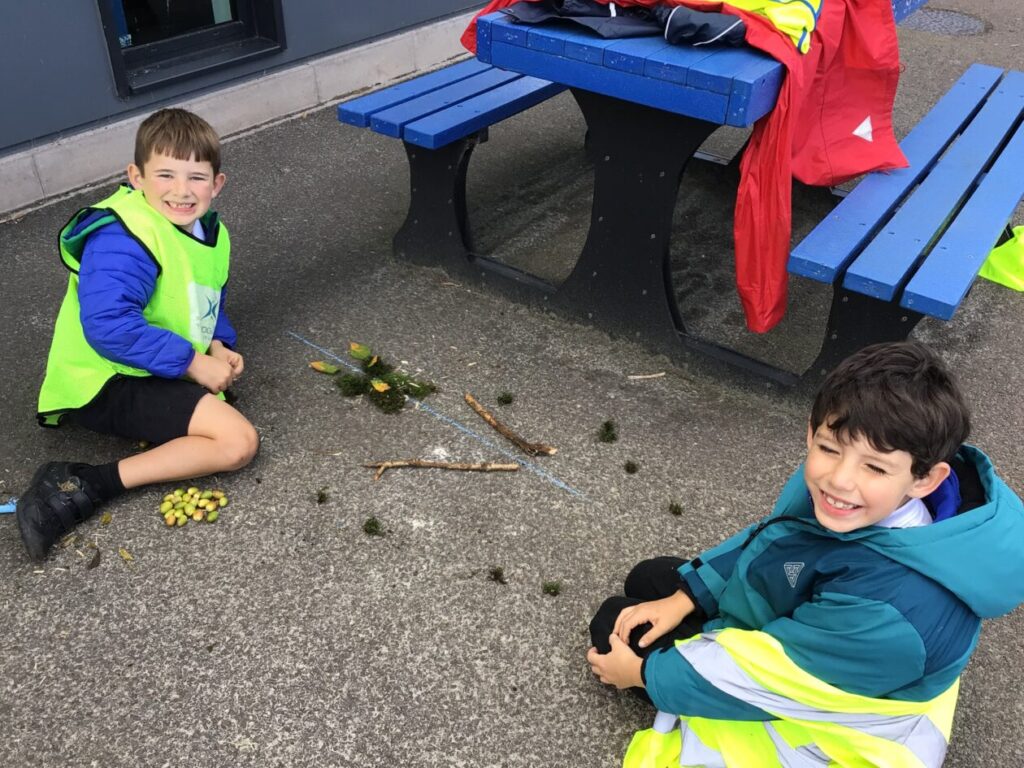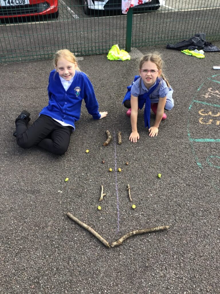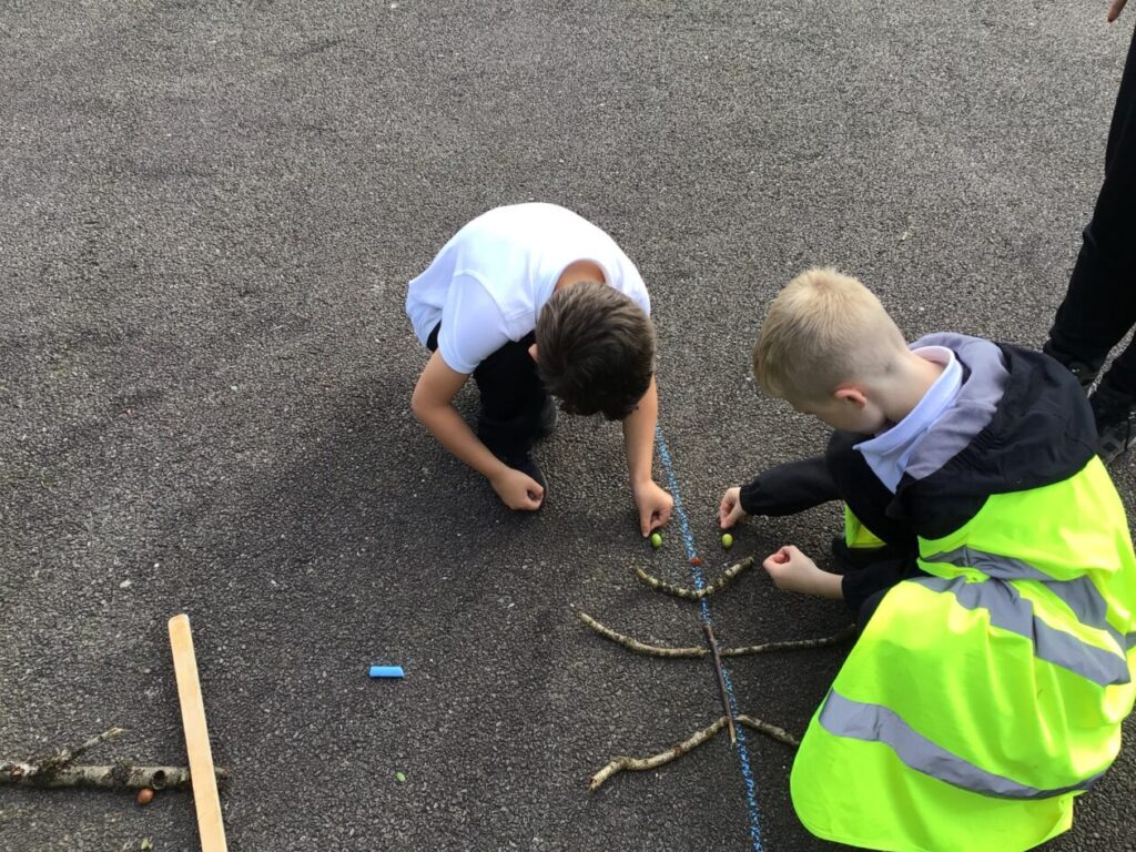 For maths week we went to the woods to collect sticks, acorns and leaves. We took them back to the playground and made pictures with symmetry! – Jenny & Alexander