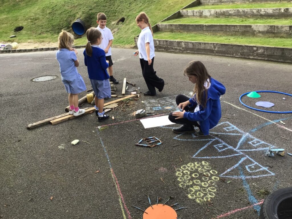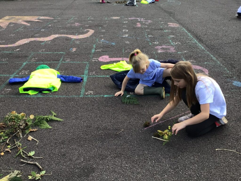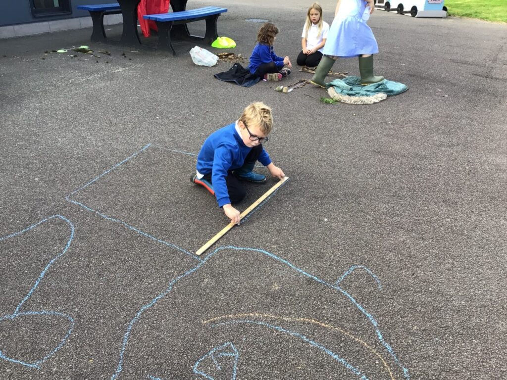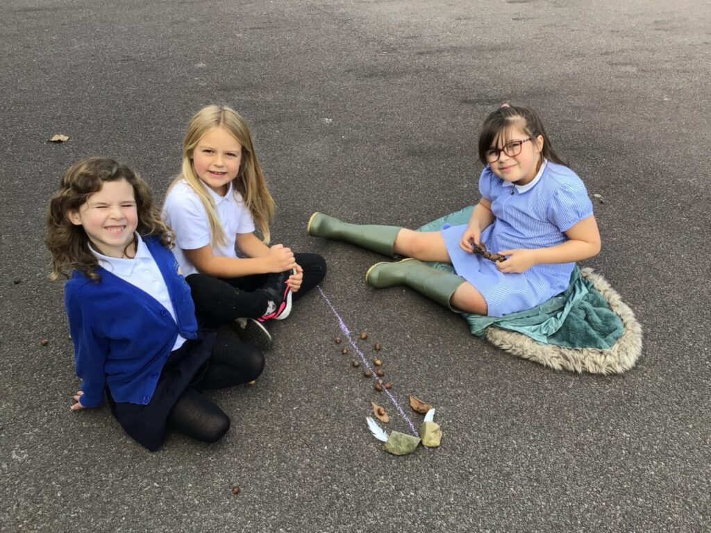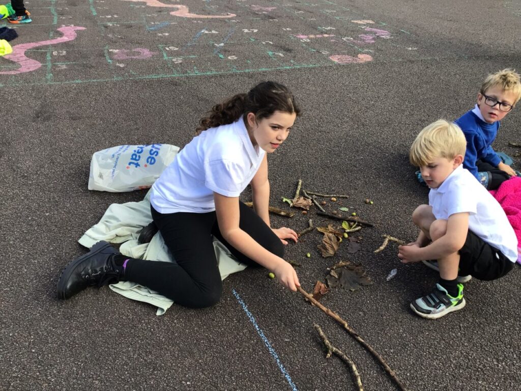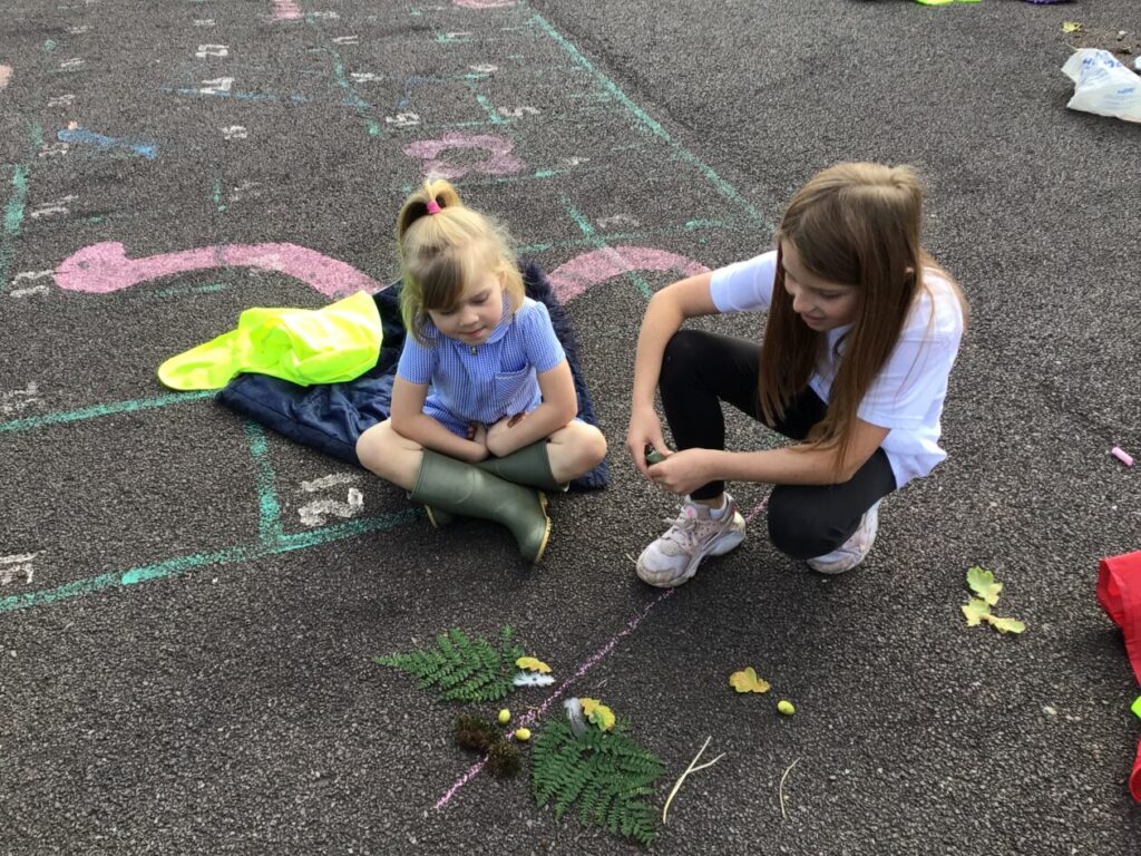 For maths week we went to the woods to collect sticks, acorns and leaves. We took them back to the playground and made pictures with symmetry! – Jenny & Alexander