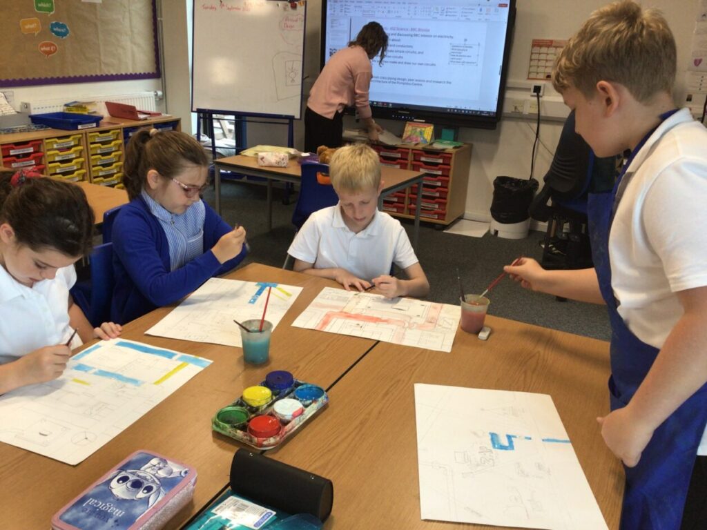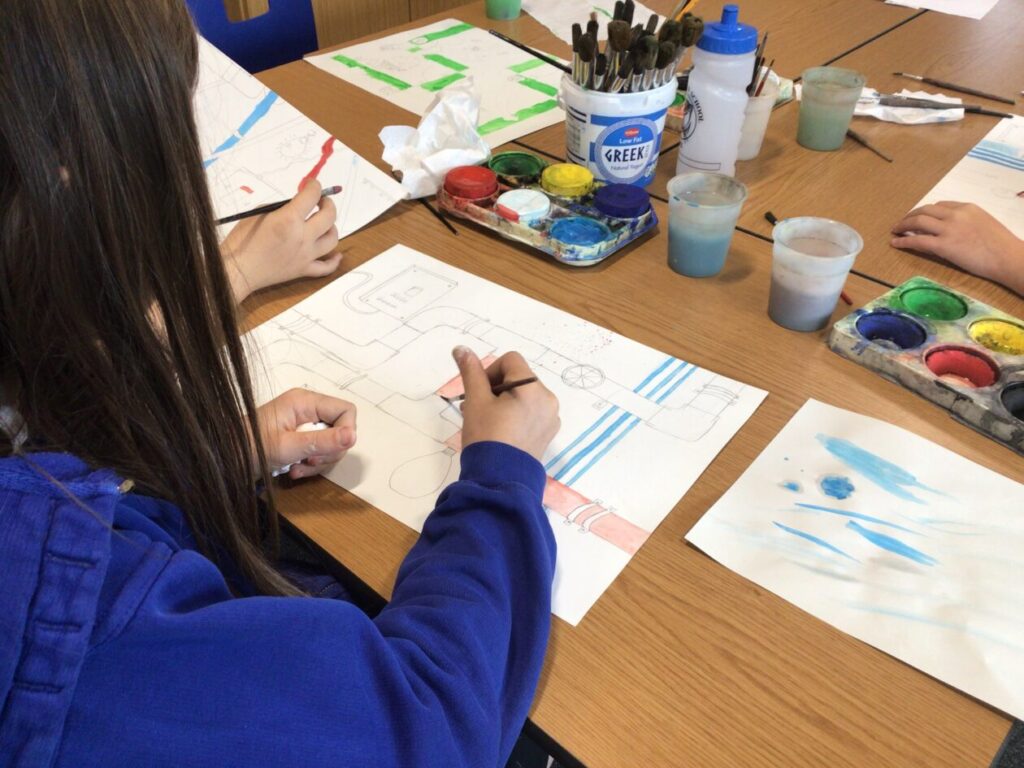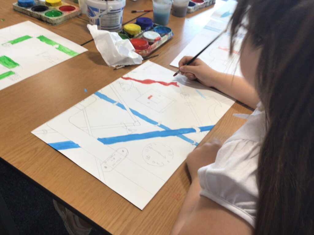 For our electricity topic we made some circuits that powered lights, motors and a loud speaker. We also started painting our crazy pipe designs with water colours. – Asa