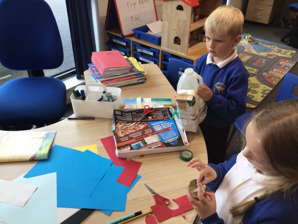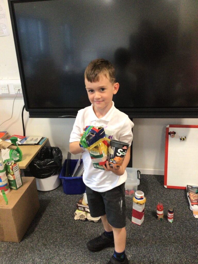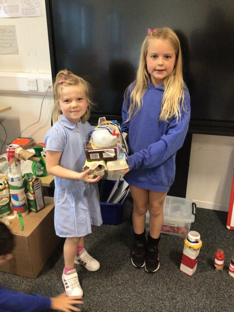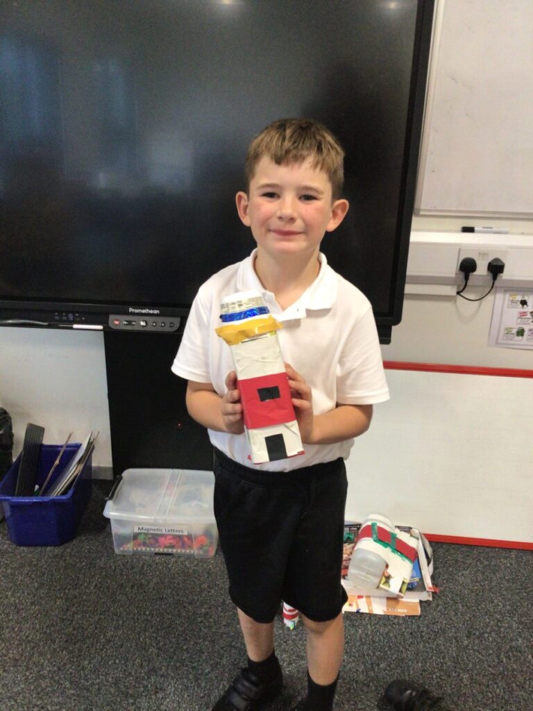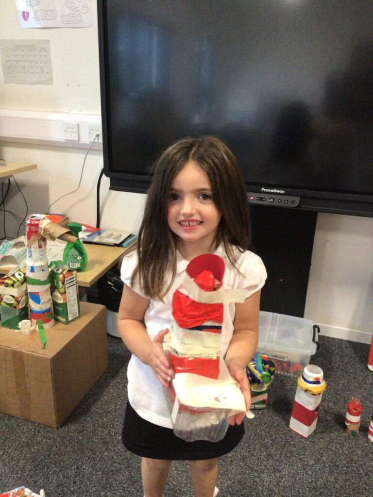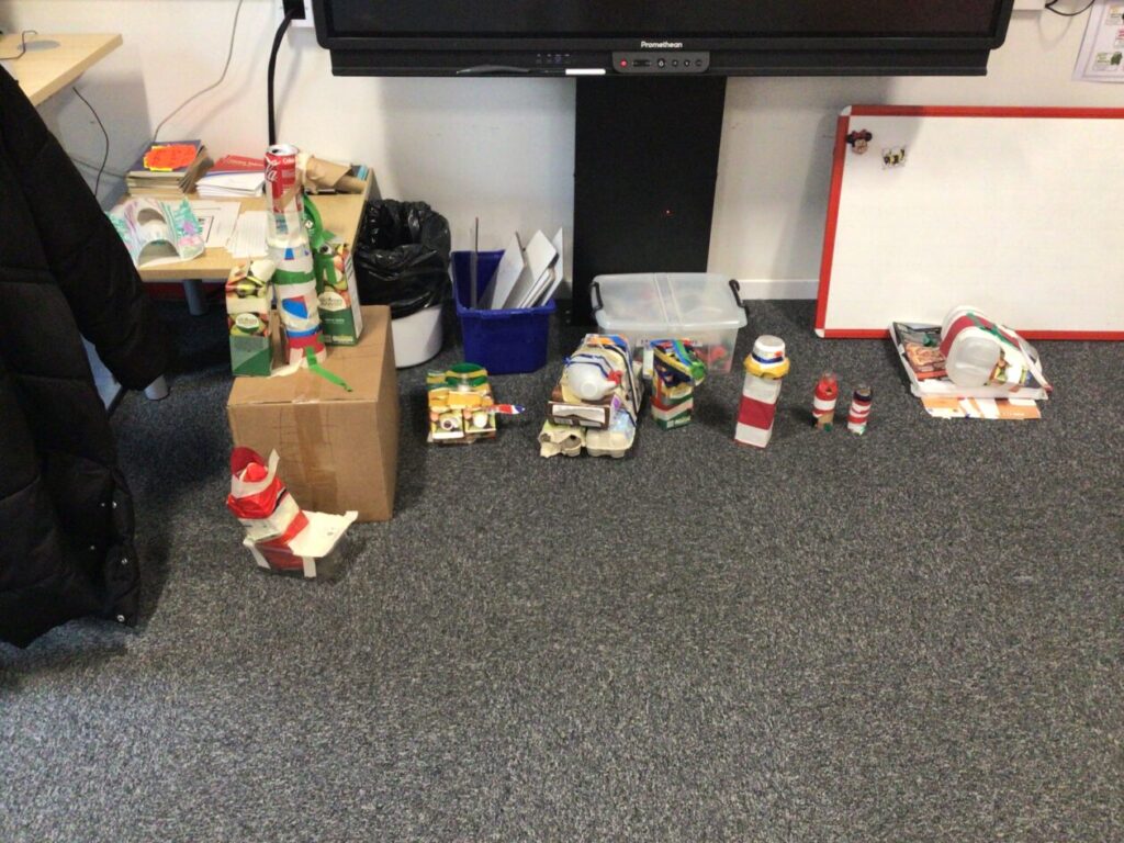 We made lighthouses and cottages using recycled rubbish. We also used tape and coloured paper to put it together. I used a milk carton, ice cream boxes and egg cartons for my one. – Bessie