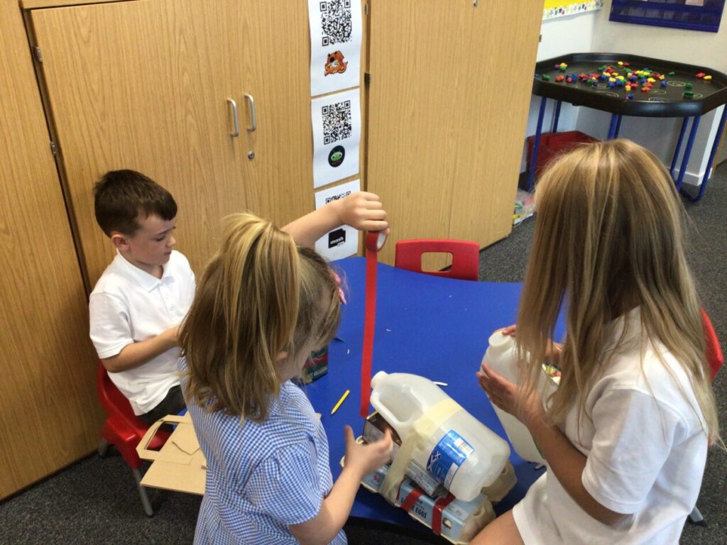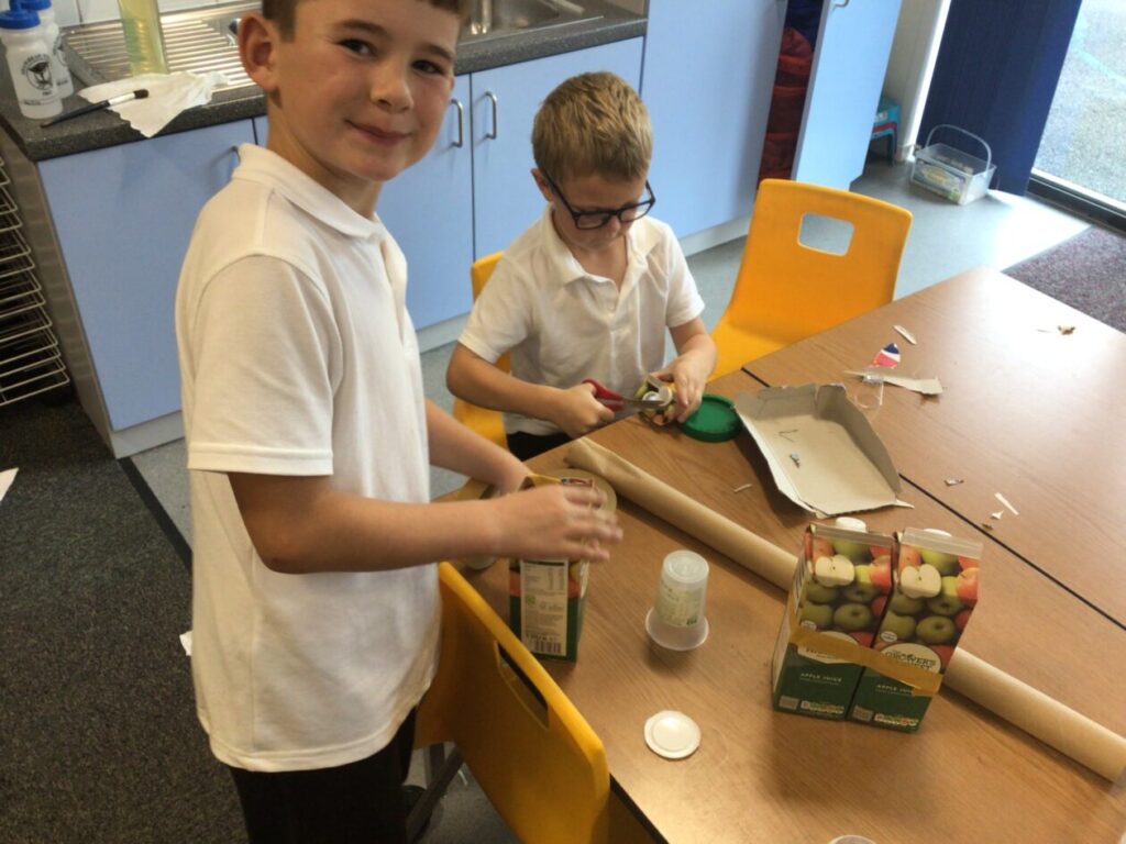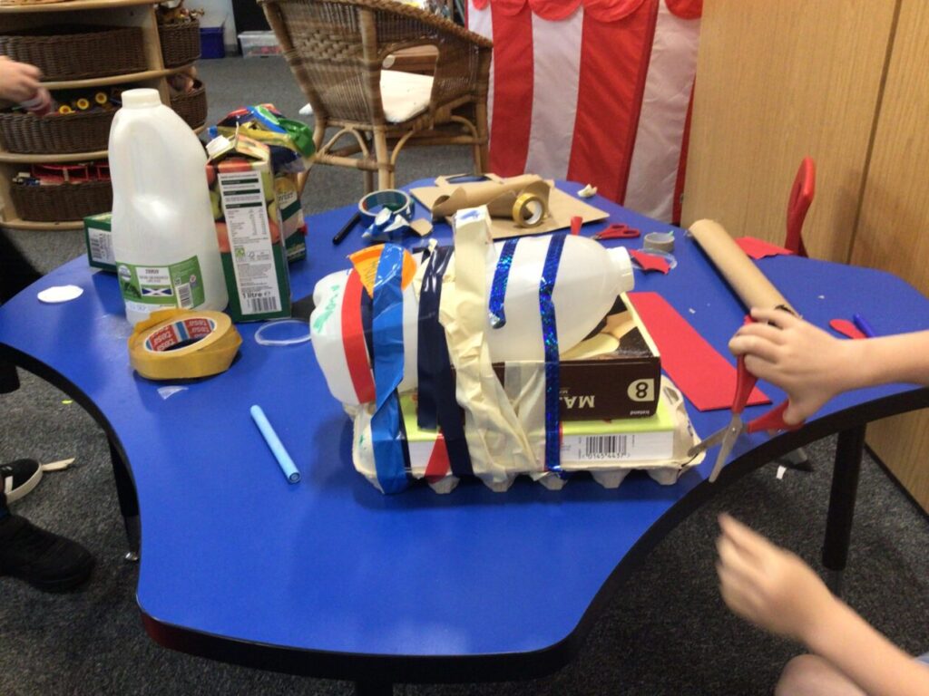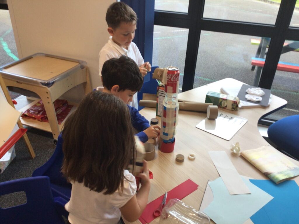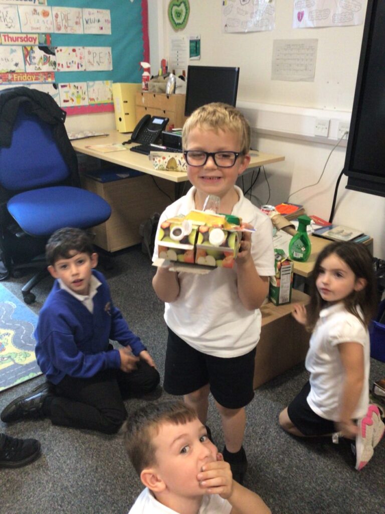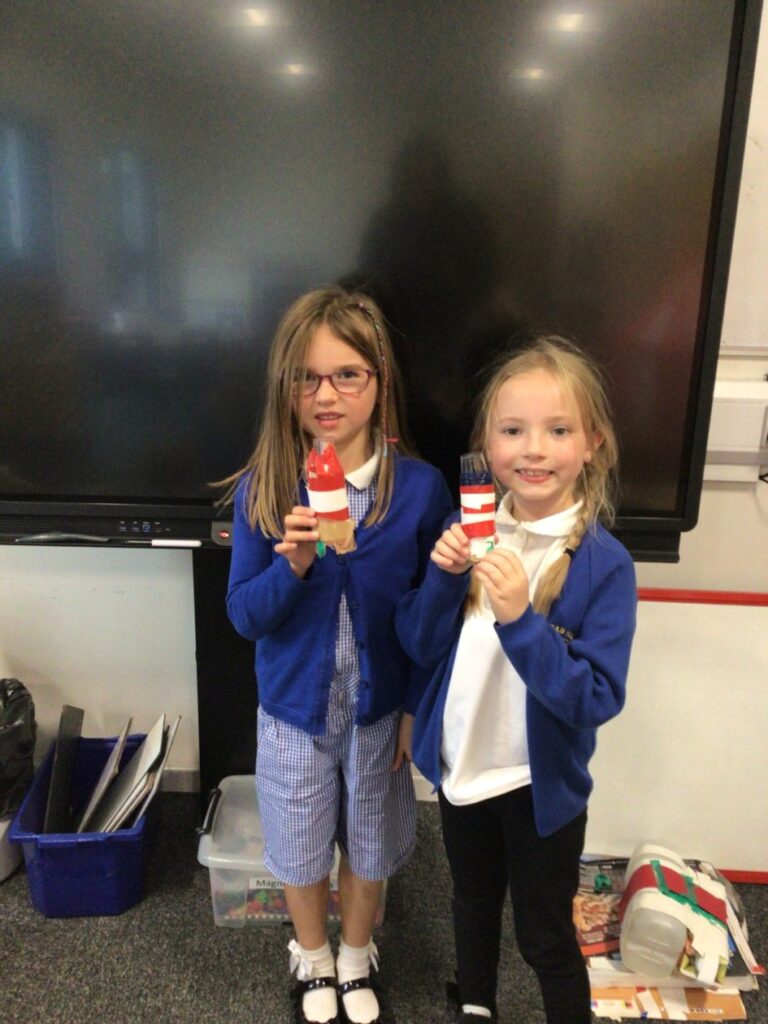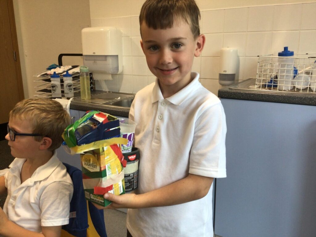 We made lighthouses and cottages using recycled rubbish. We also used tape and coloured paper to put it together. I used a milk carton, ice cream boxes and egg cartons for my one. – Bessie