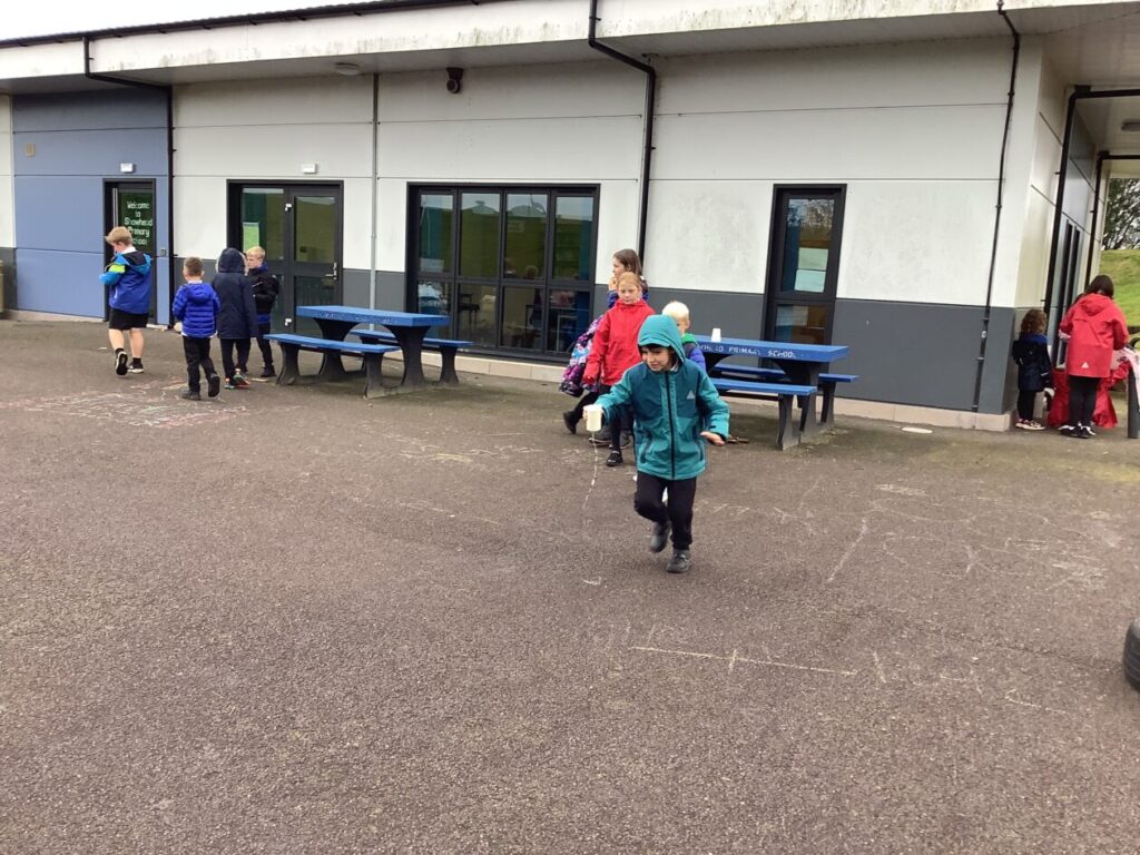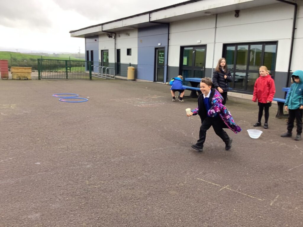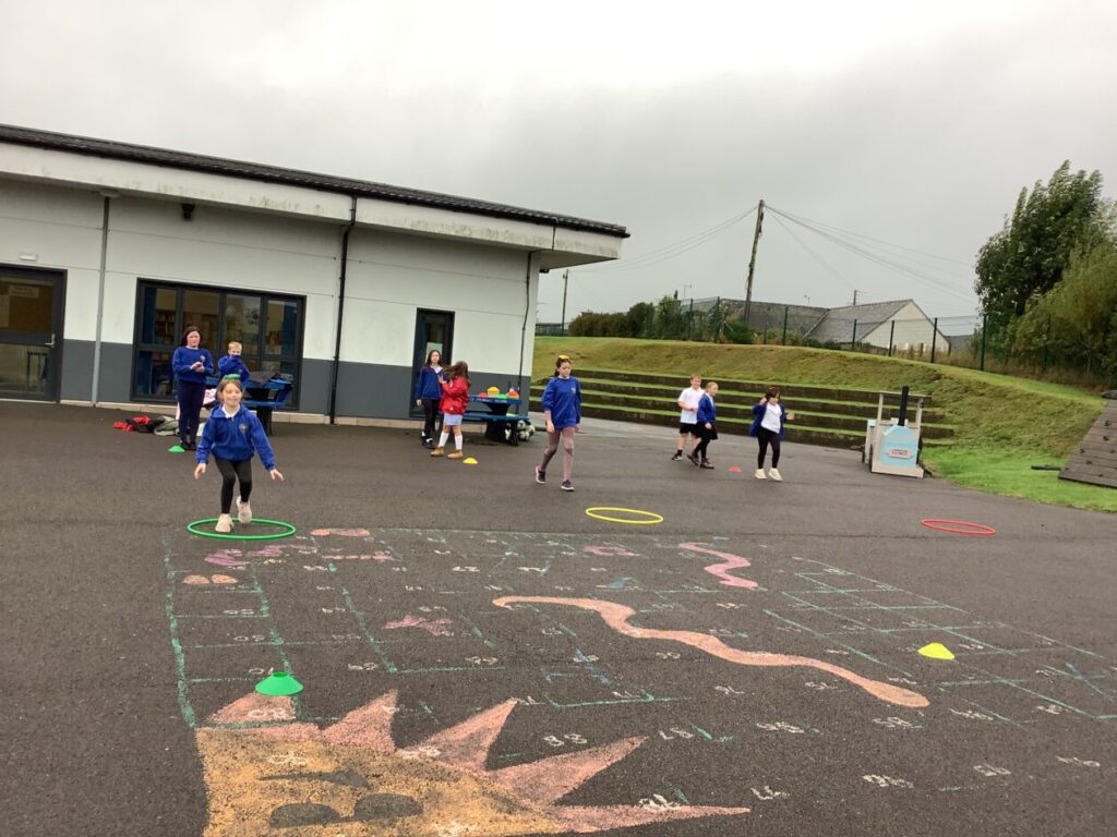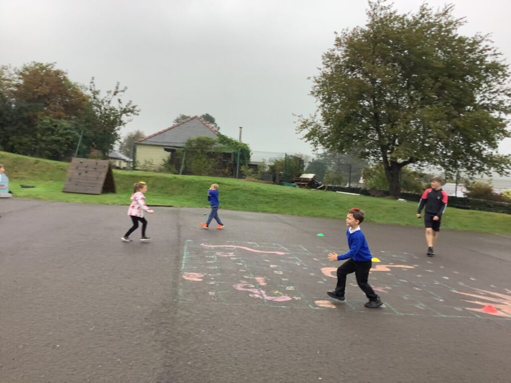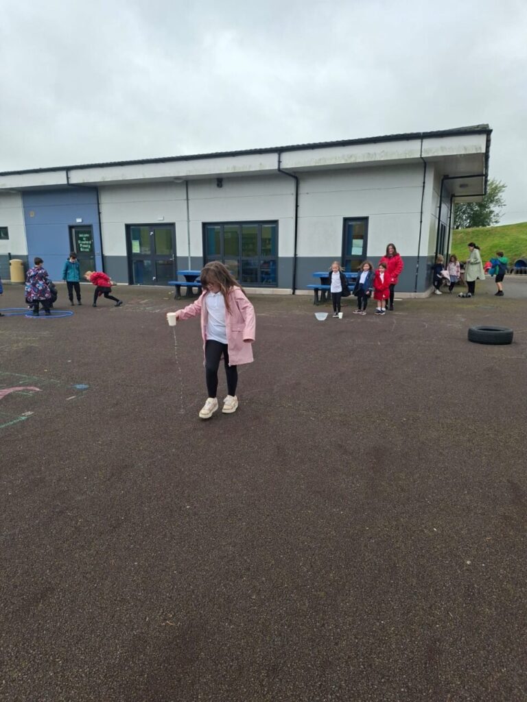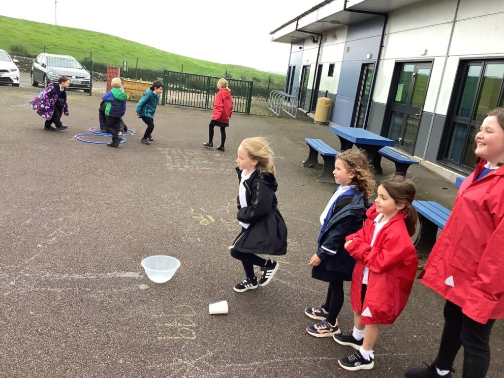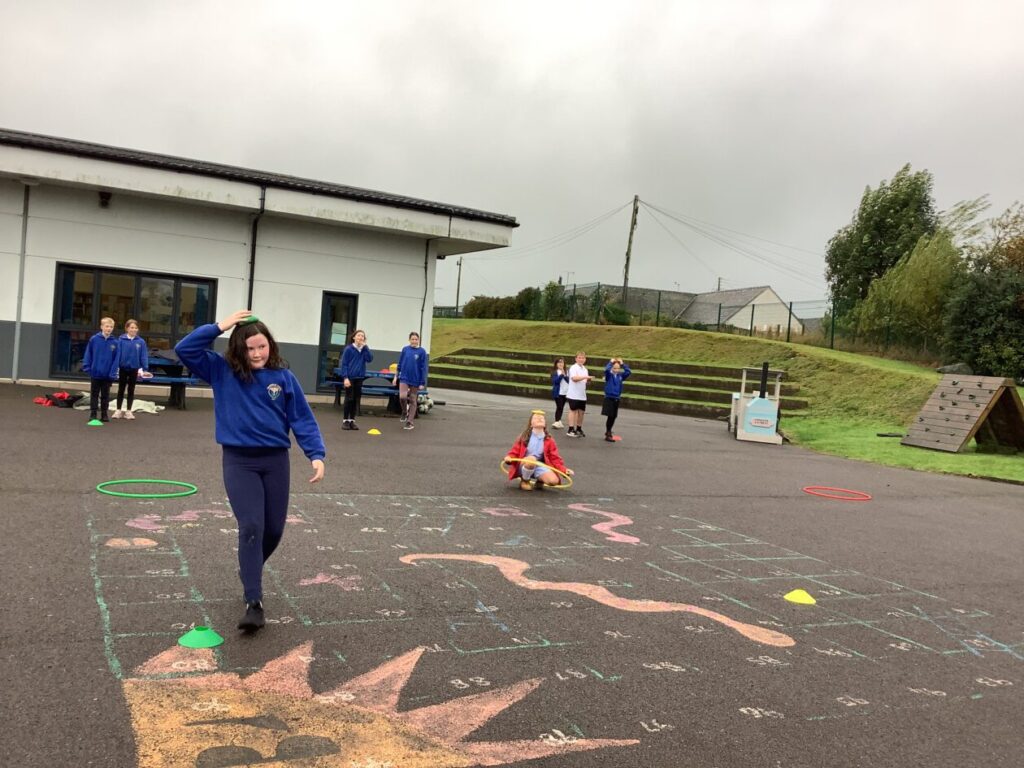 For active schools we were balancing bean bags on our head. We were having different races and Ella forgot how to skip! We also played different games. – Ella & Ruairi