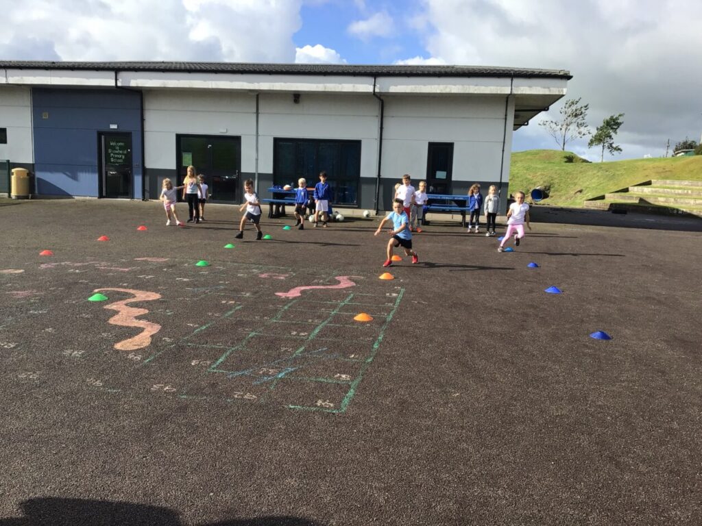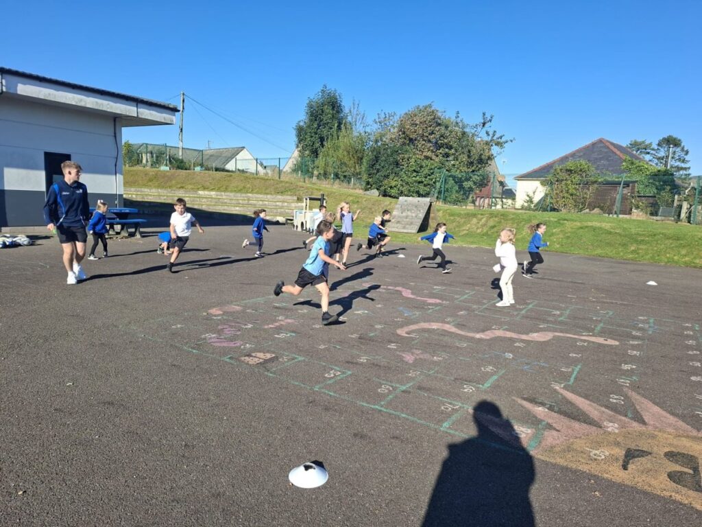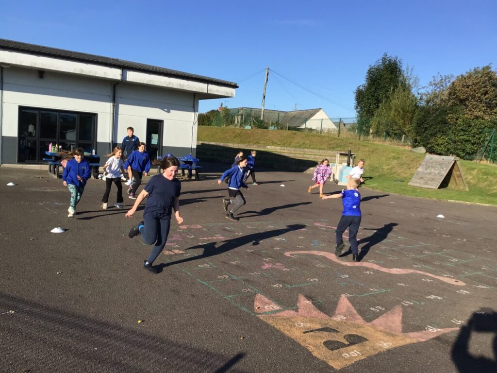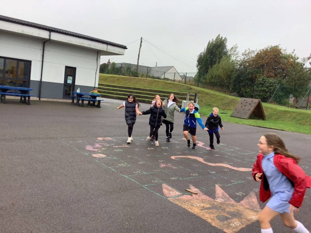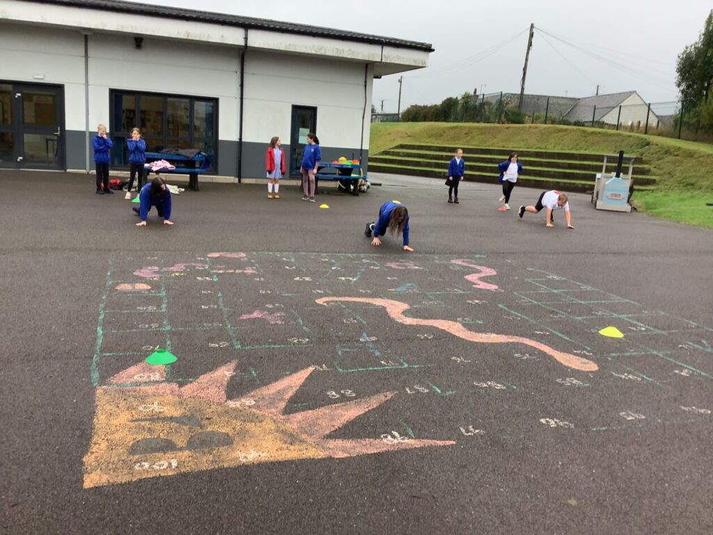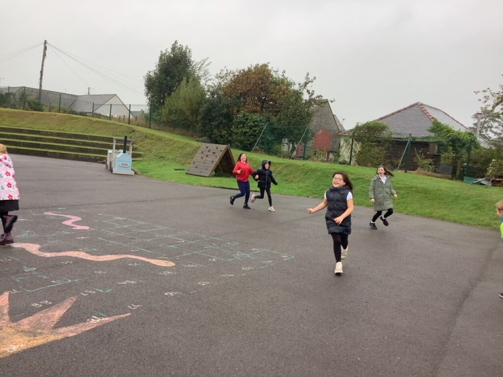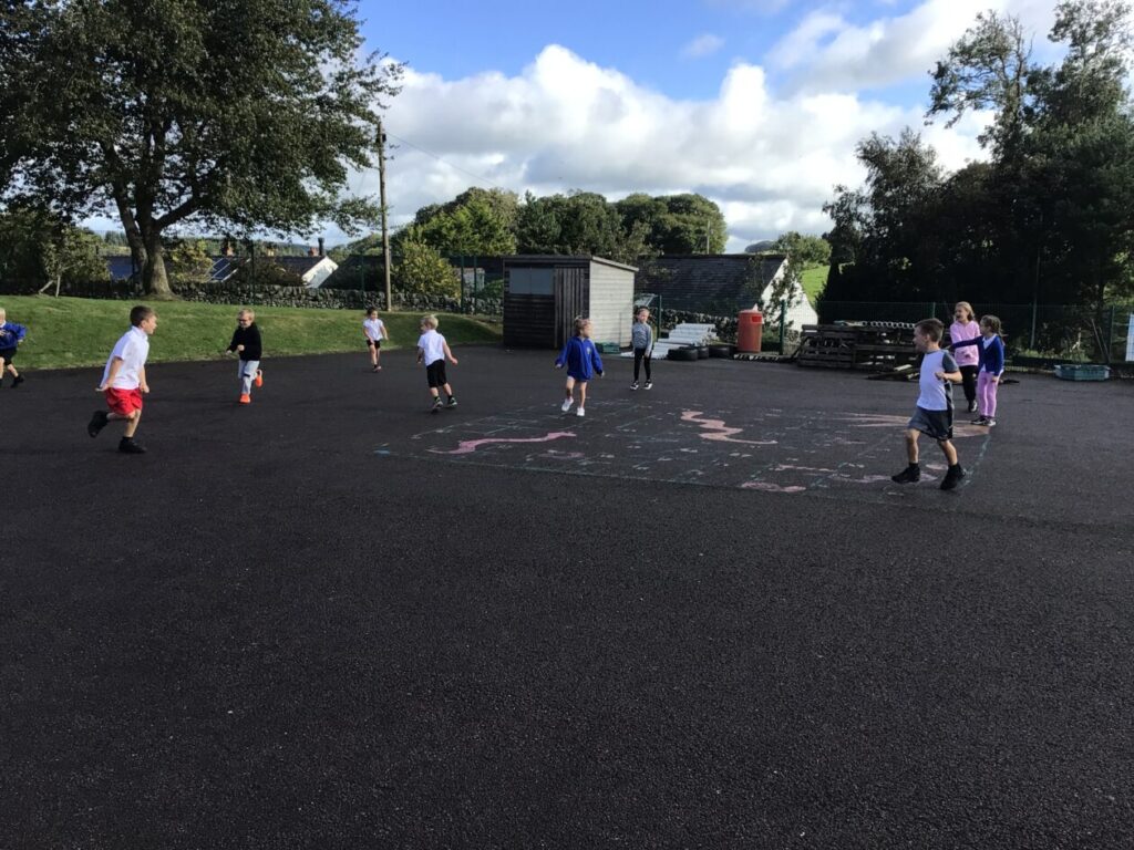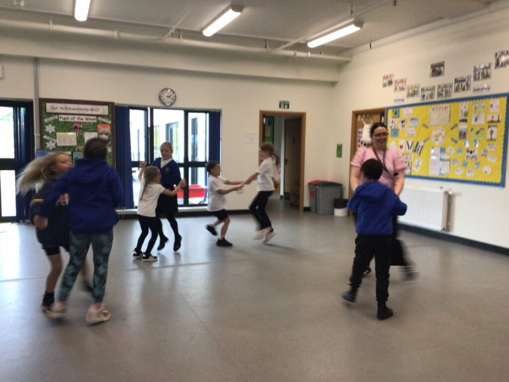 For active schools we were balancing bean bags on our head. We were having different races and Ella forgot how to skip! We also played different games. – Ella & Ruairi