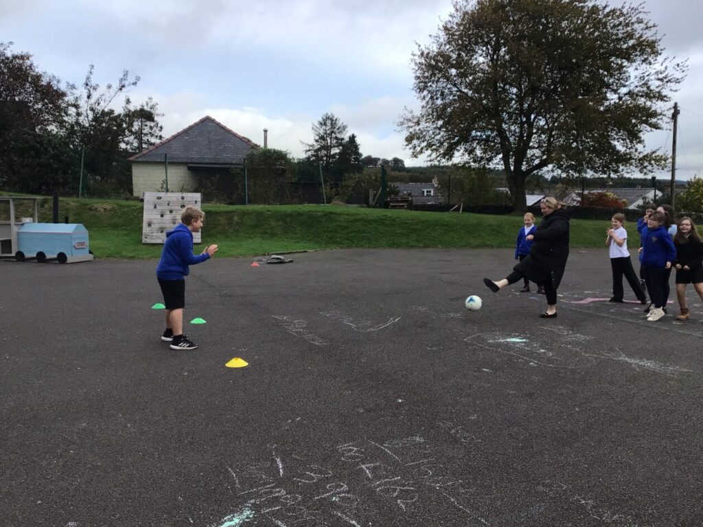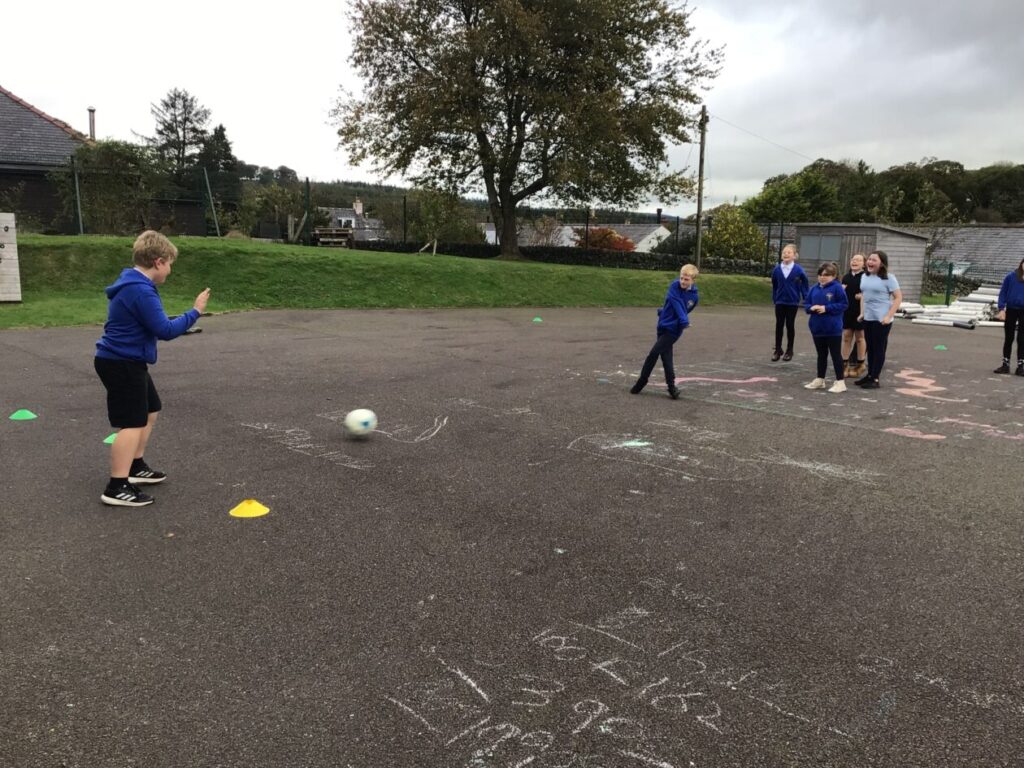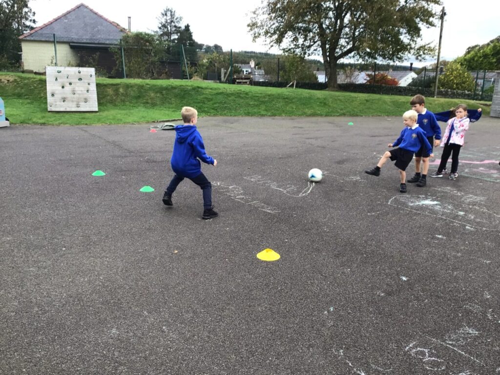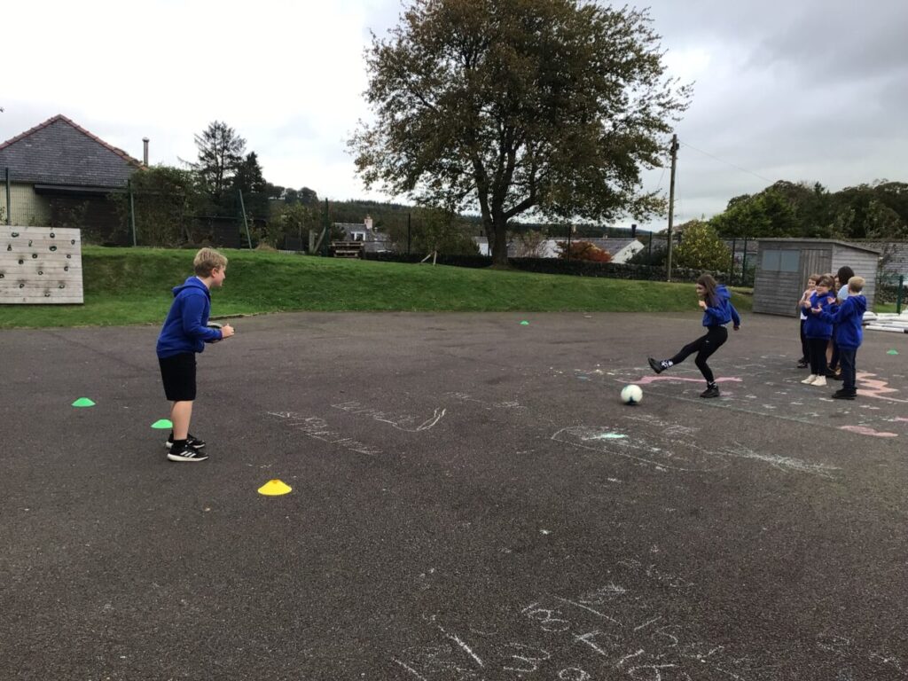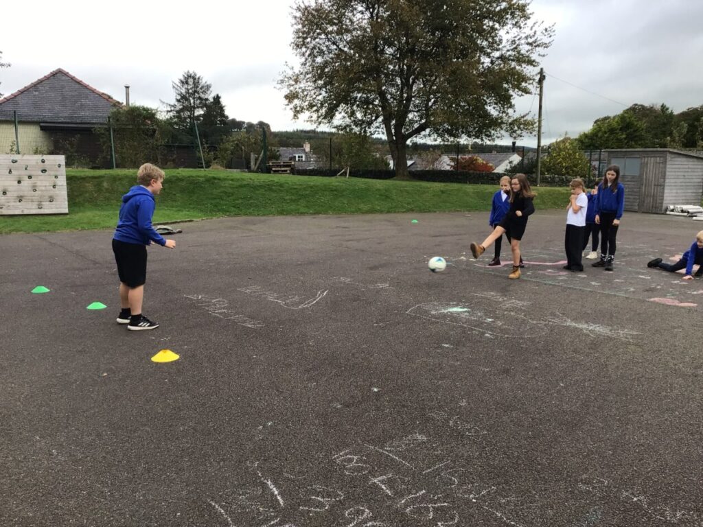 We were playing some football for PE. We played a game yellow class against blue class and blue class won! We were also taking shots into a goalie. – Mirren