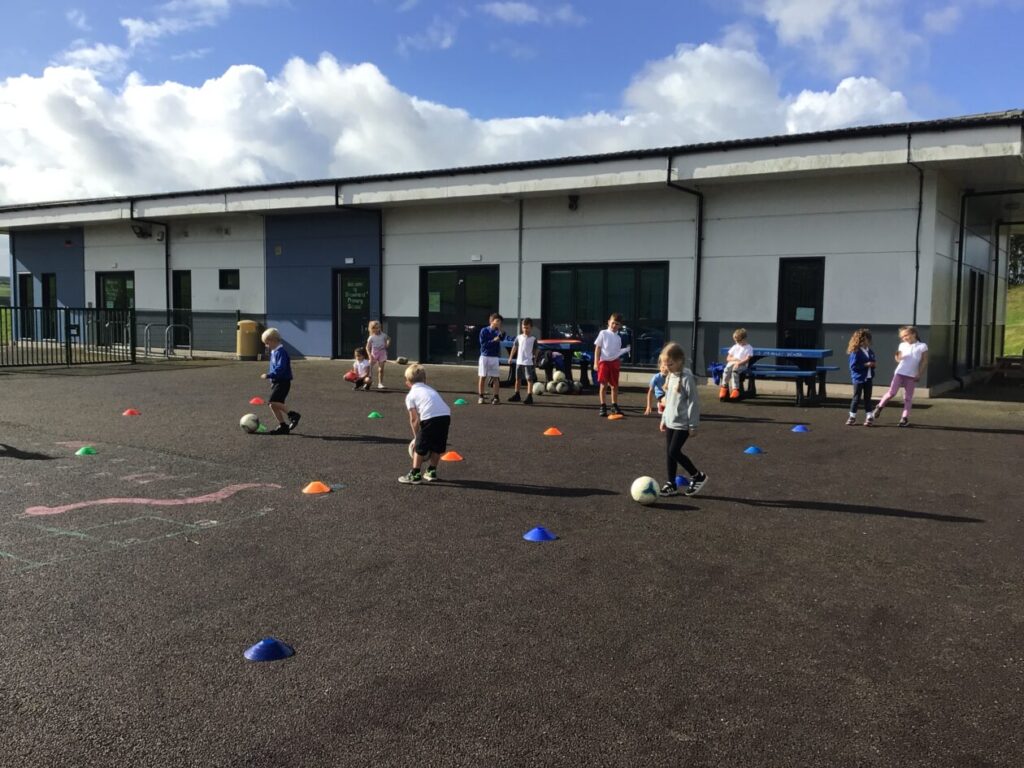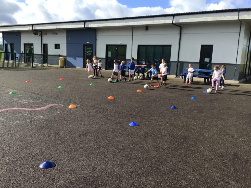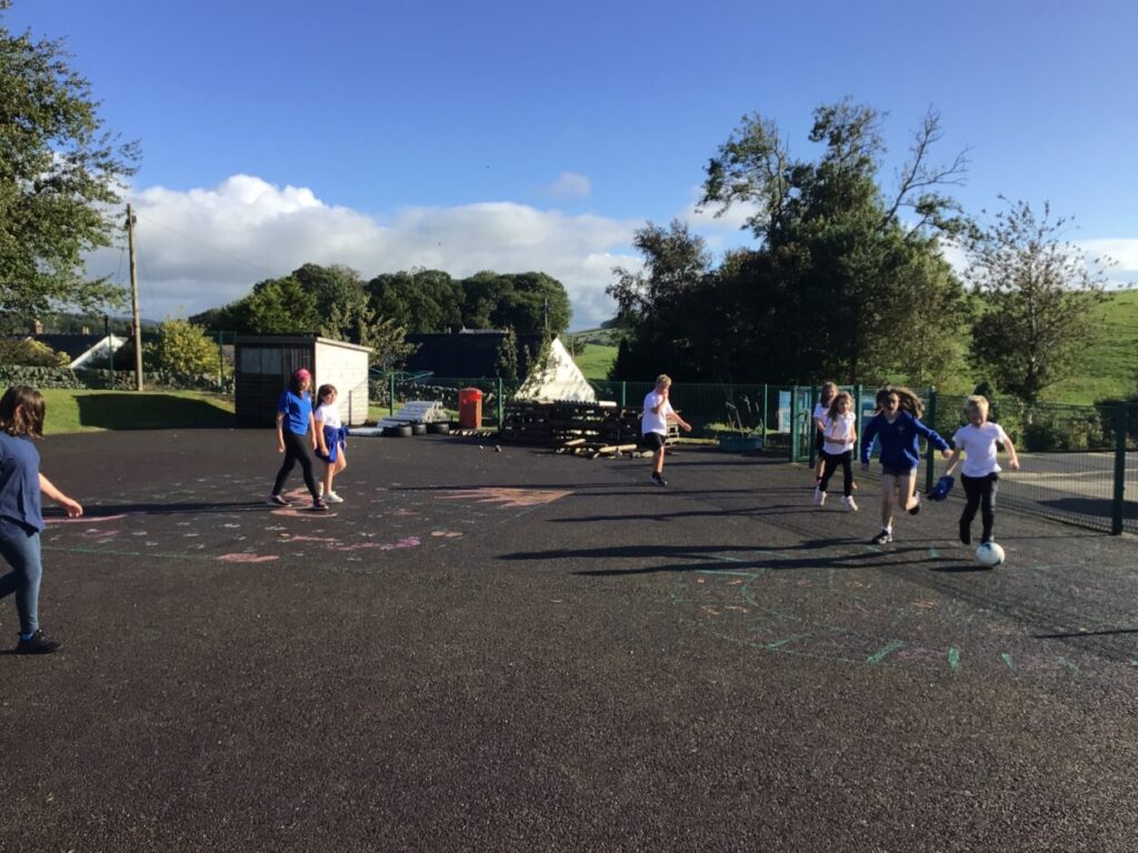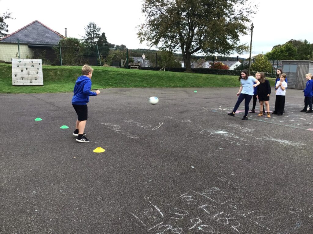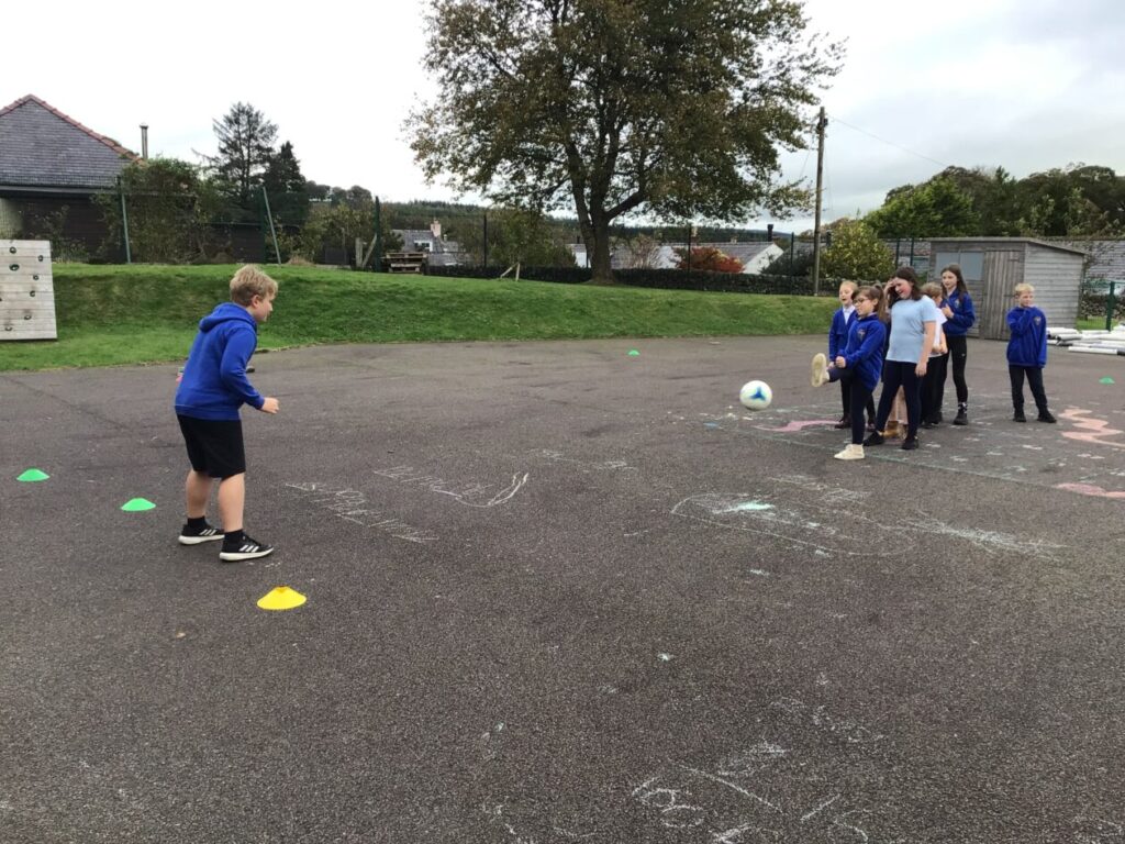 We were playing some football for PE. We played a game yellow class against blue class and blue class won! We were also taking shots into a goalie. – Mirren