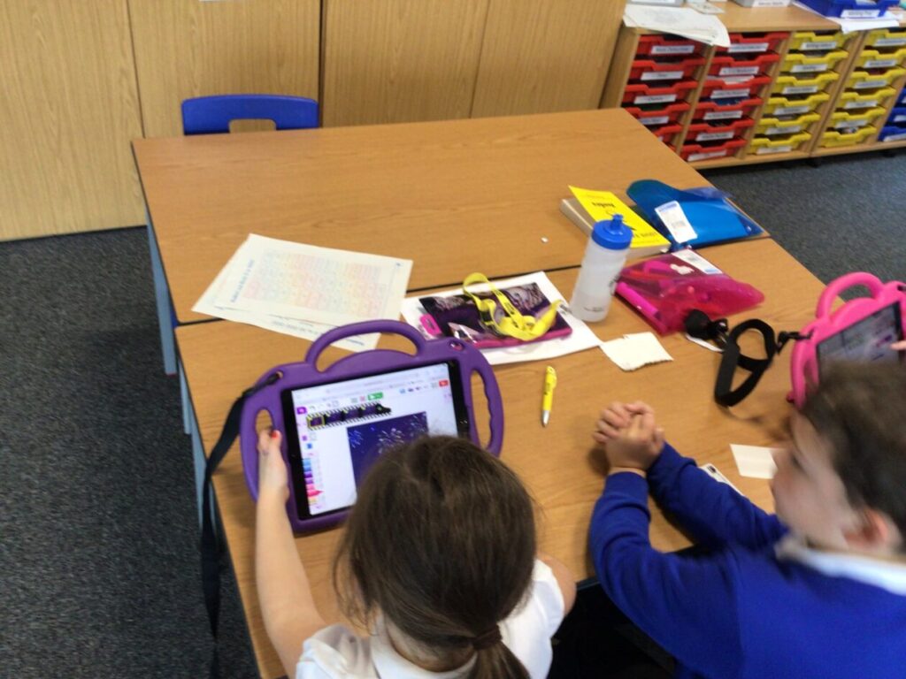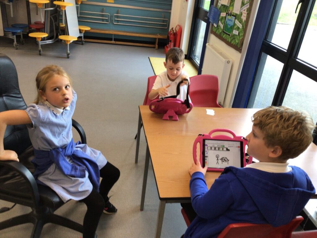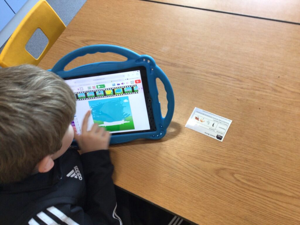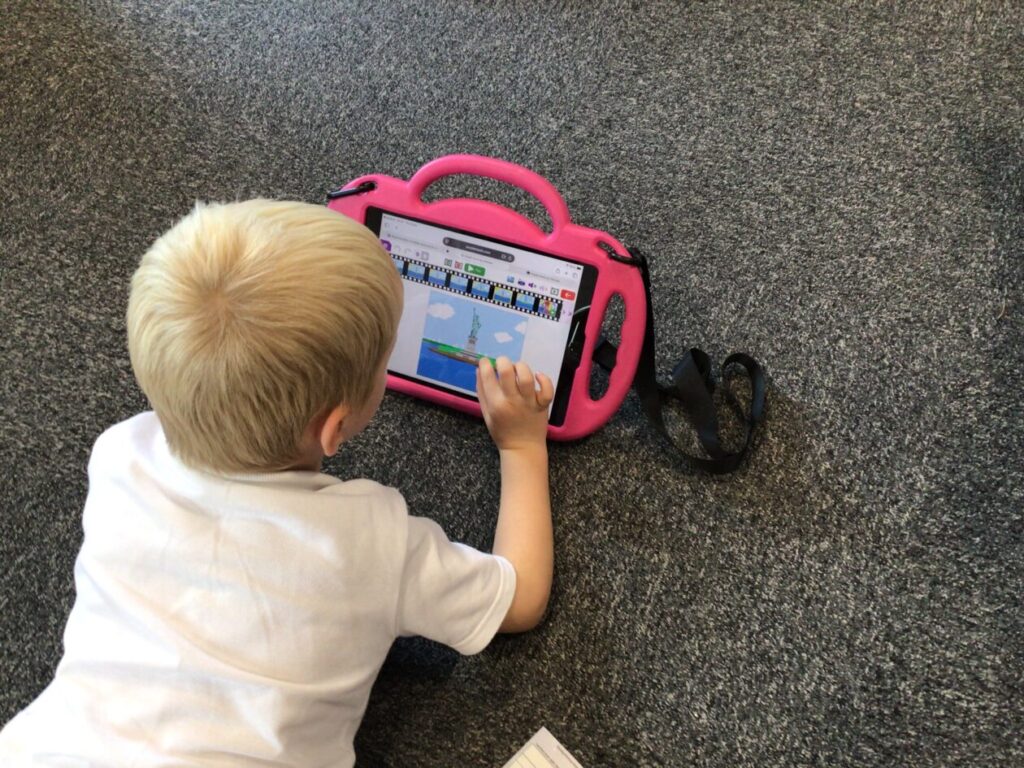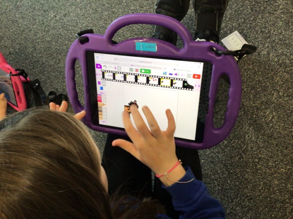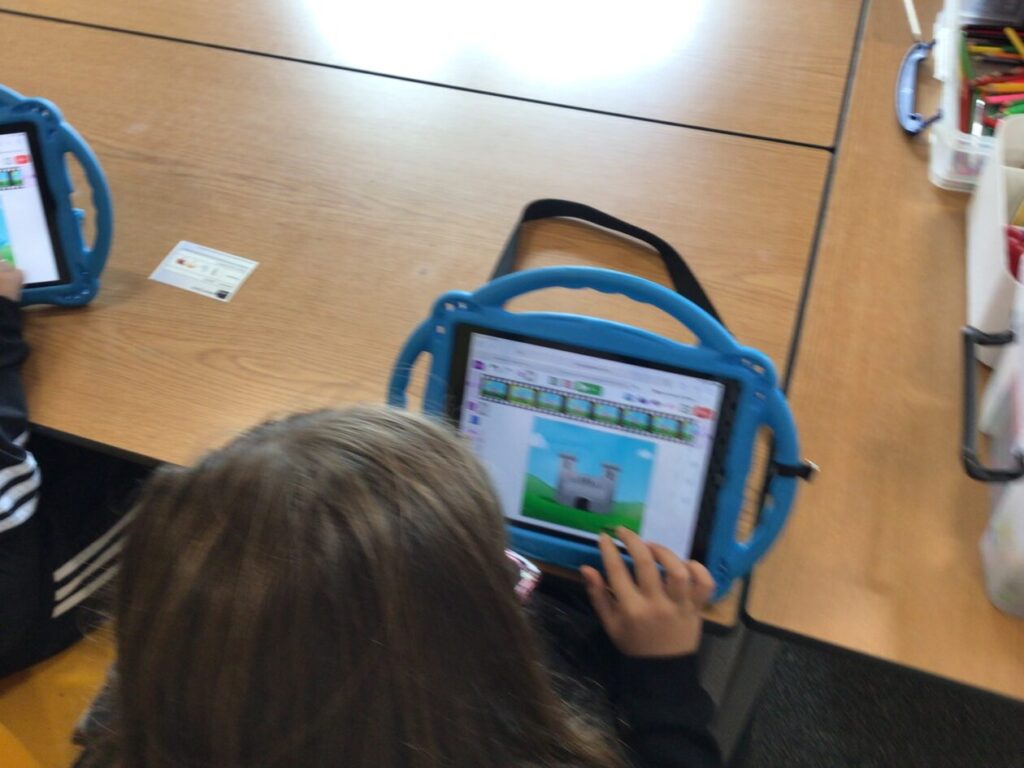 The yellow class taught us animation on the iPads. We made little videos and got to draw on the iPads. We also added backgrounds and sounds. My one was when a square was going in or out and getting smaller. – Mirren