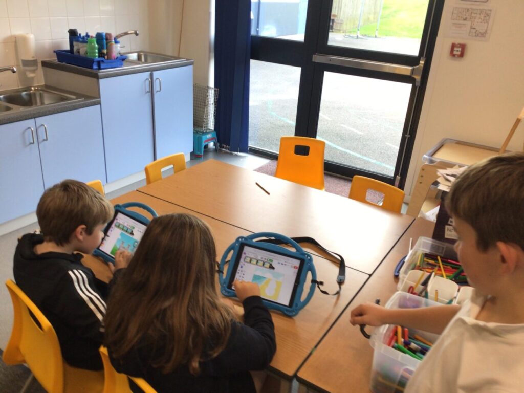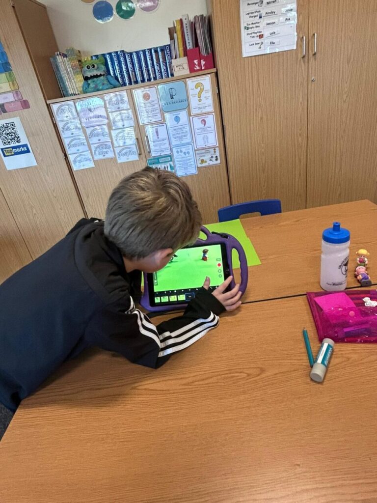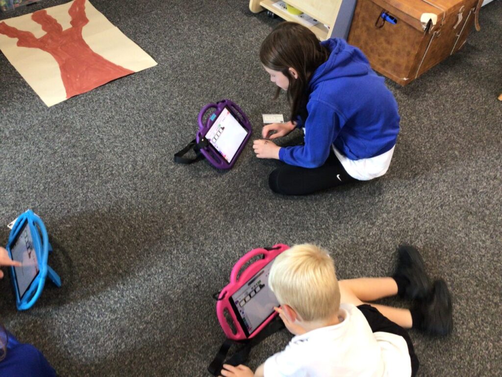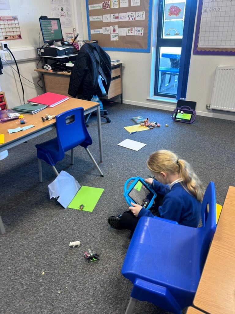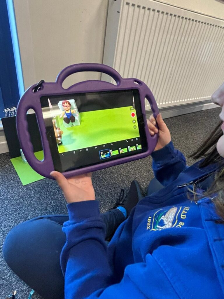 The yellow class taught us animation on the iPads. We made little videos and got to draw on the iPads. We also added backgrounds and sounds. My one was when a square was going in or out and getting smaller. – Mirren