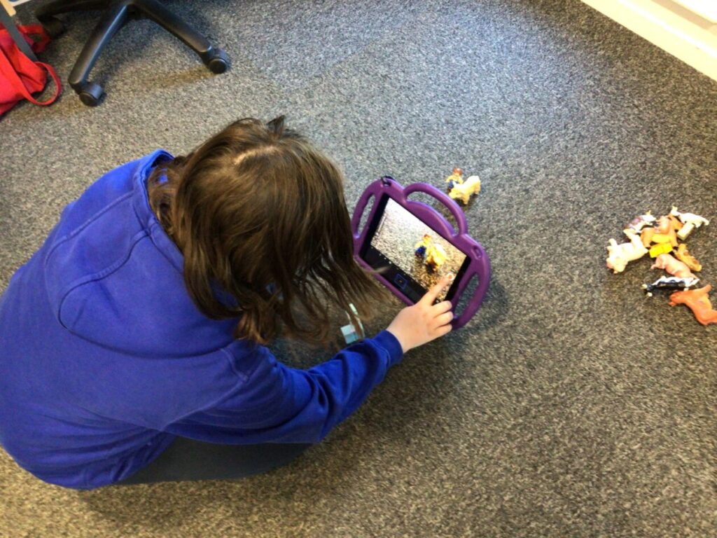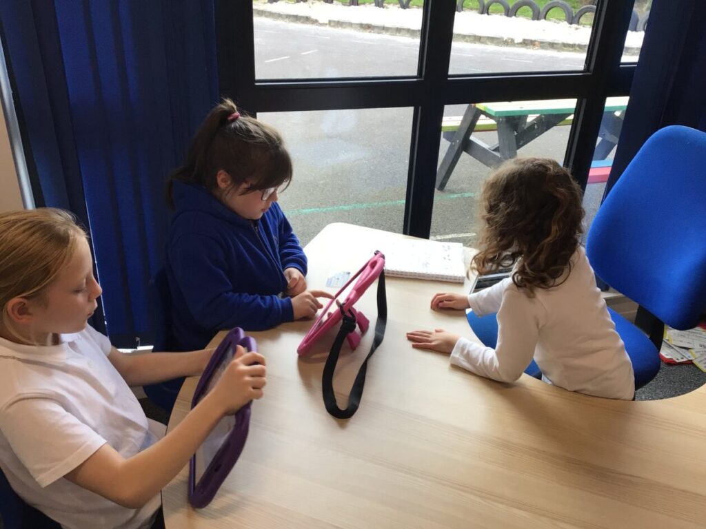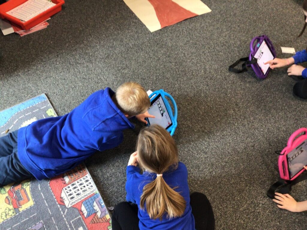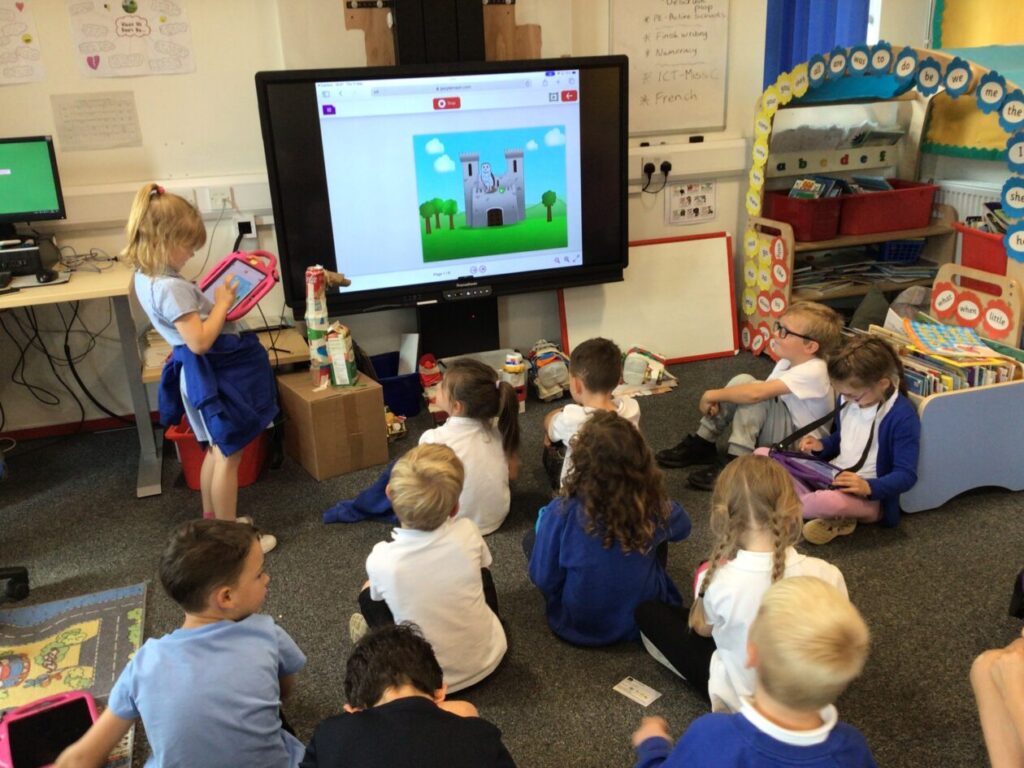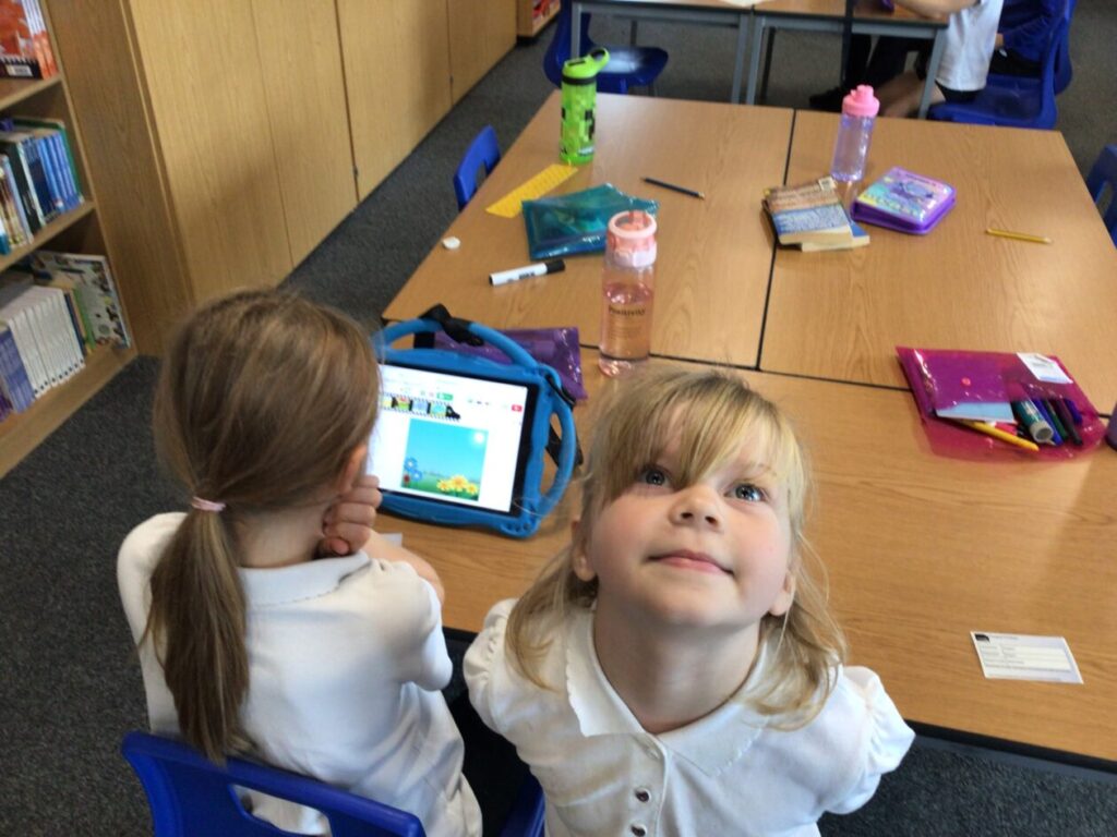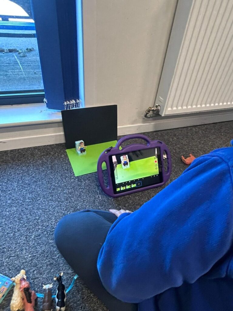 The yellow class taught us animation on the iPads. We made little videos and got to draw on the iPads. We also added backgrounds and sounds. My one was when a square was going in or out and getting smaller. – Mirren