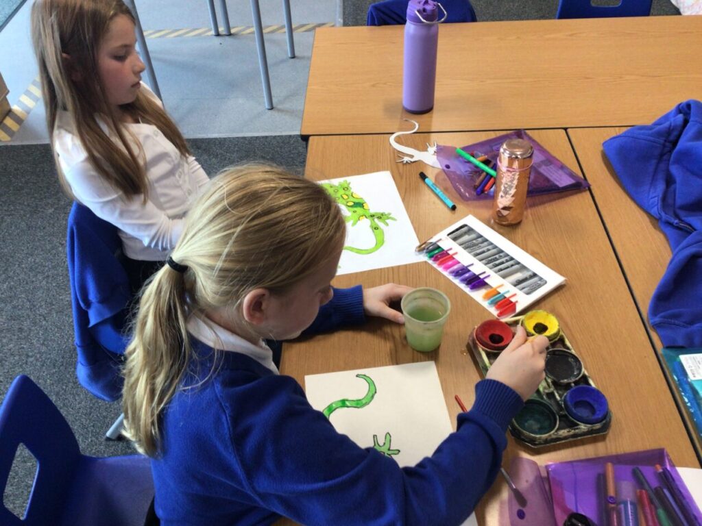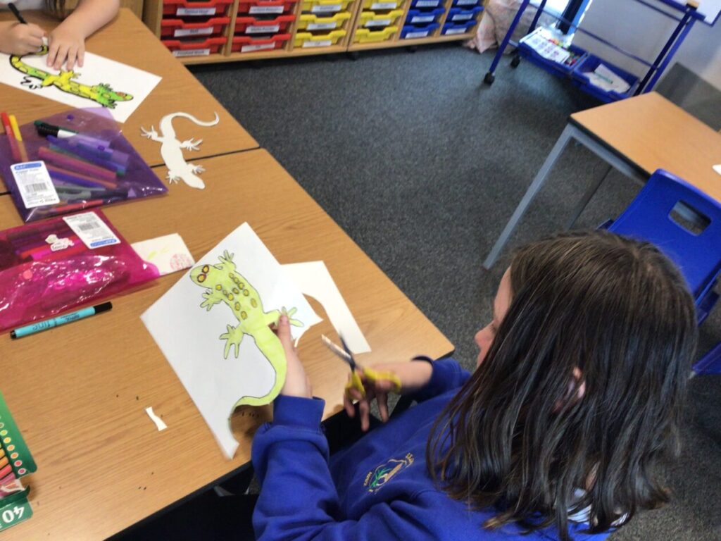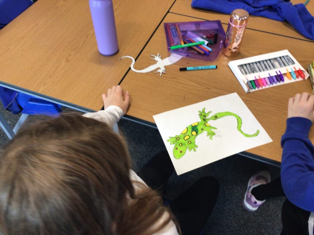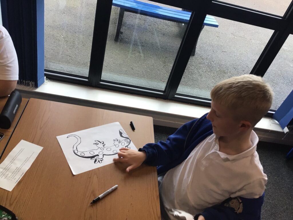 We traced around some lizards and we coloured them in. They are the Yellow Spotted Lizard. – Jenny