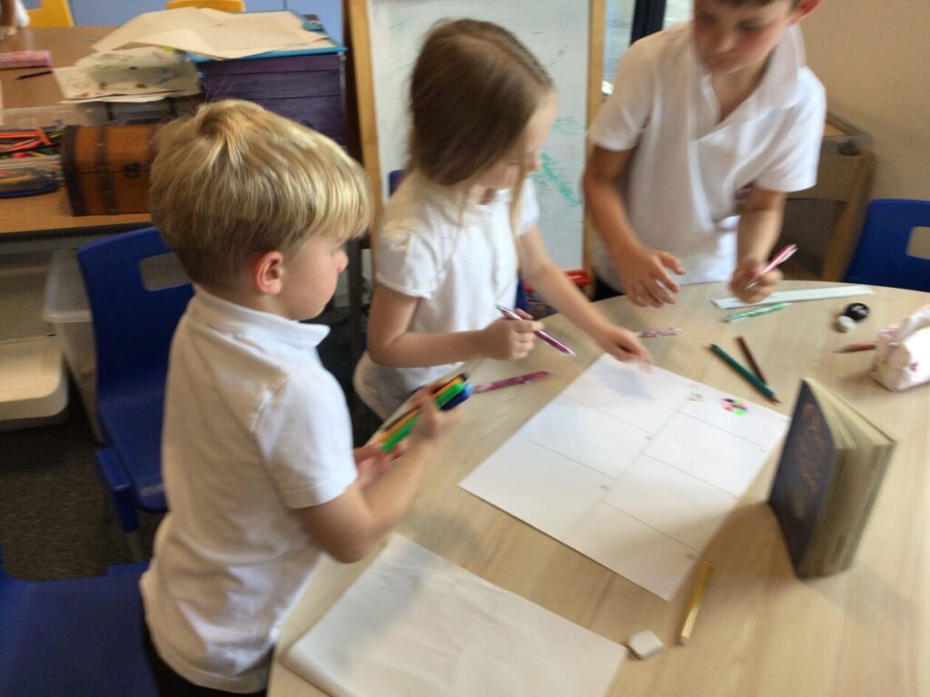 We split the paper into 7 bits because there are 7 chapters in the book. We then drew what happened in each chapter. – Alexander