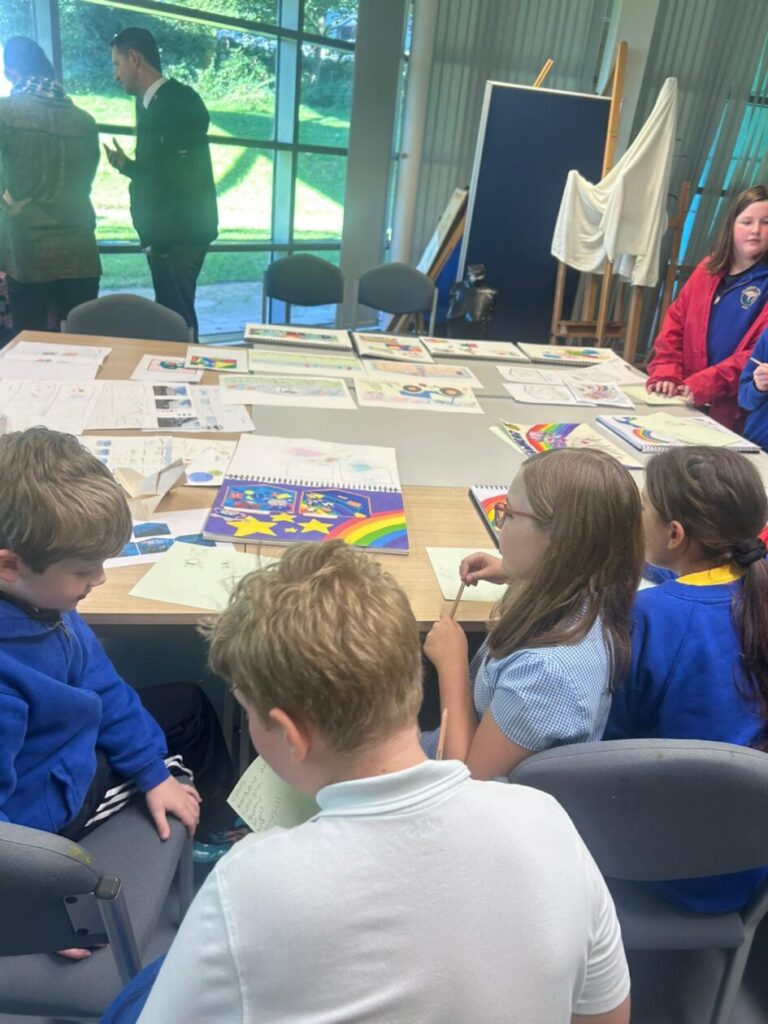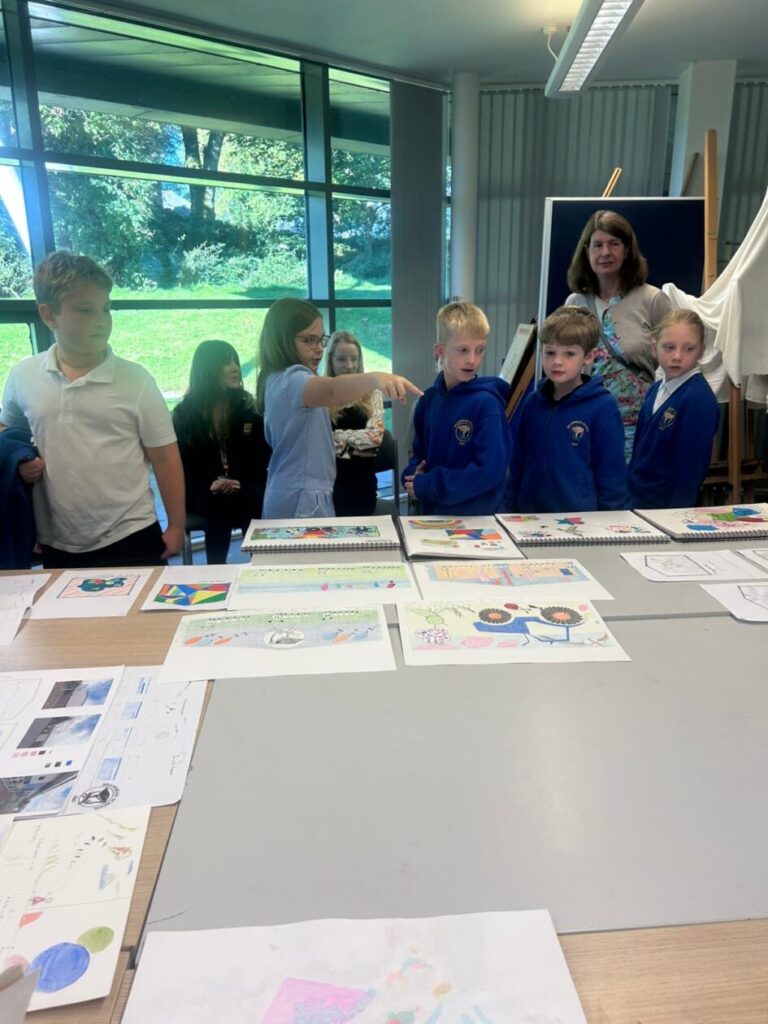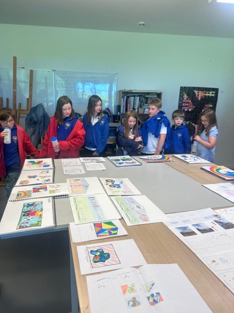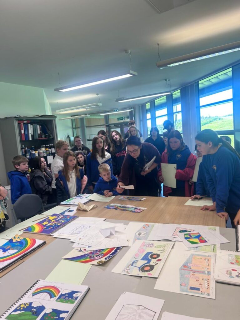 The P4-7’s went to the college to see what the students have designed for our shed mural. We wrote down what ones we liked the best! My favourite was the one where the animals were going down a rainbow slide to school. – Jenny