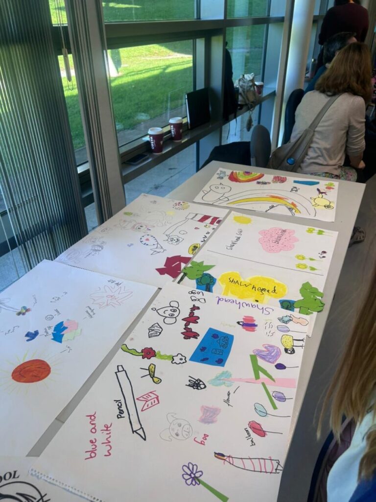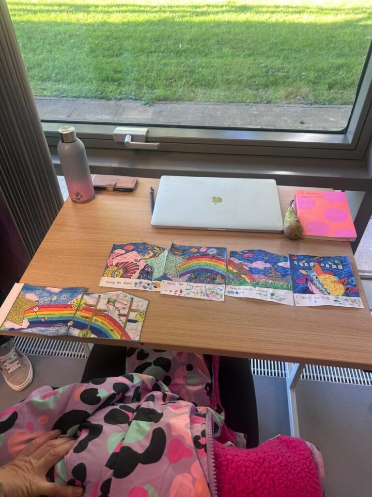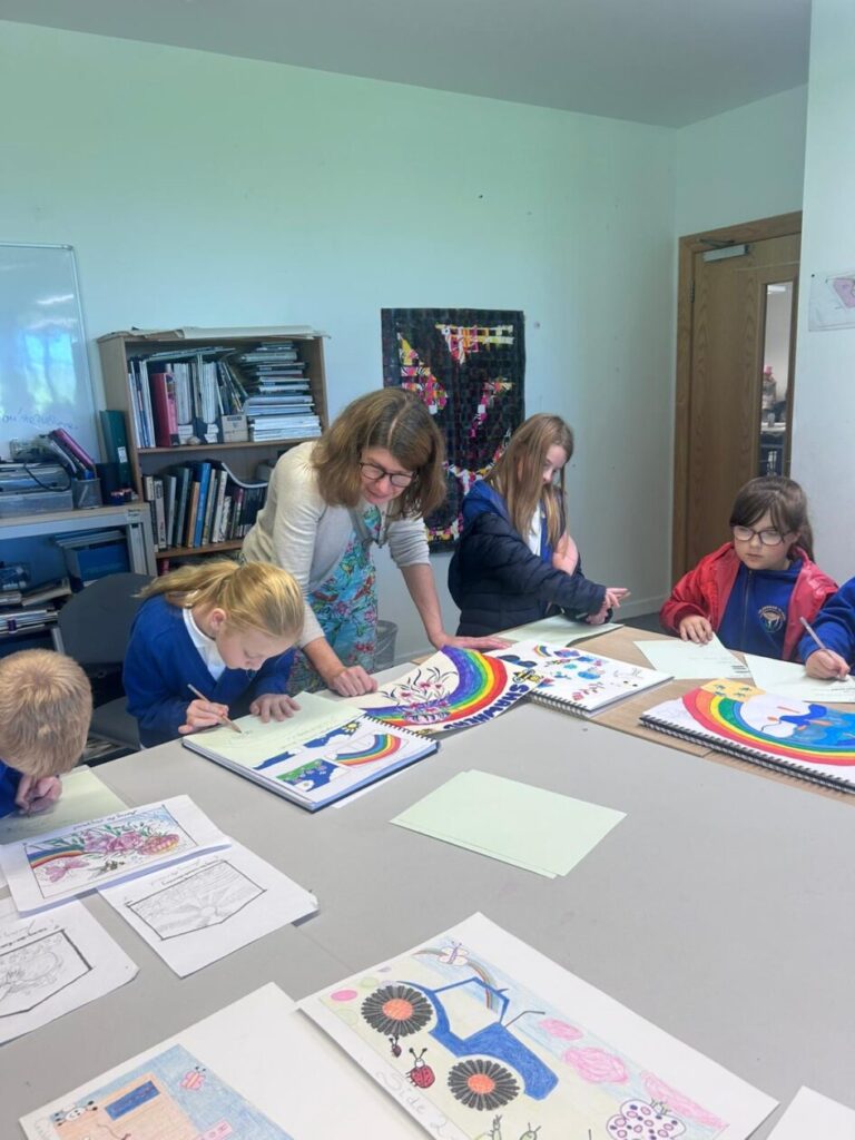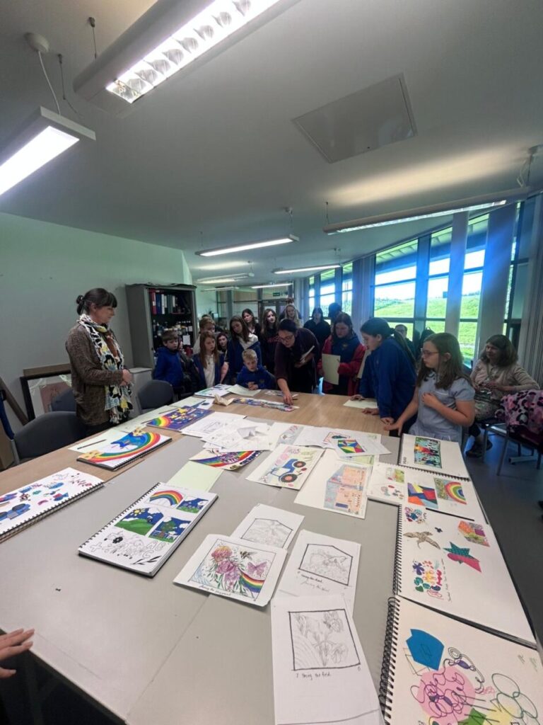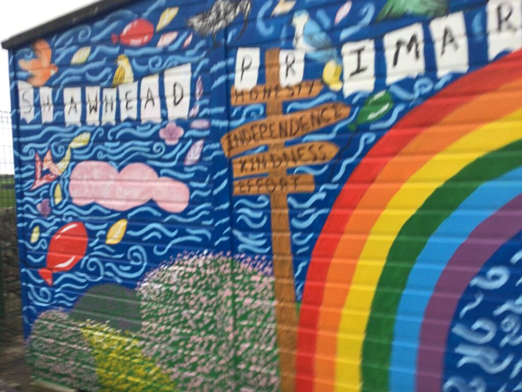 The P4-7’s went to the college to see what the students have designed for our shed mural. We wrote down what ones we liked the best! My favourite was the one where the animals were going down a rainbow slide to school. – Jenny