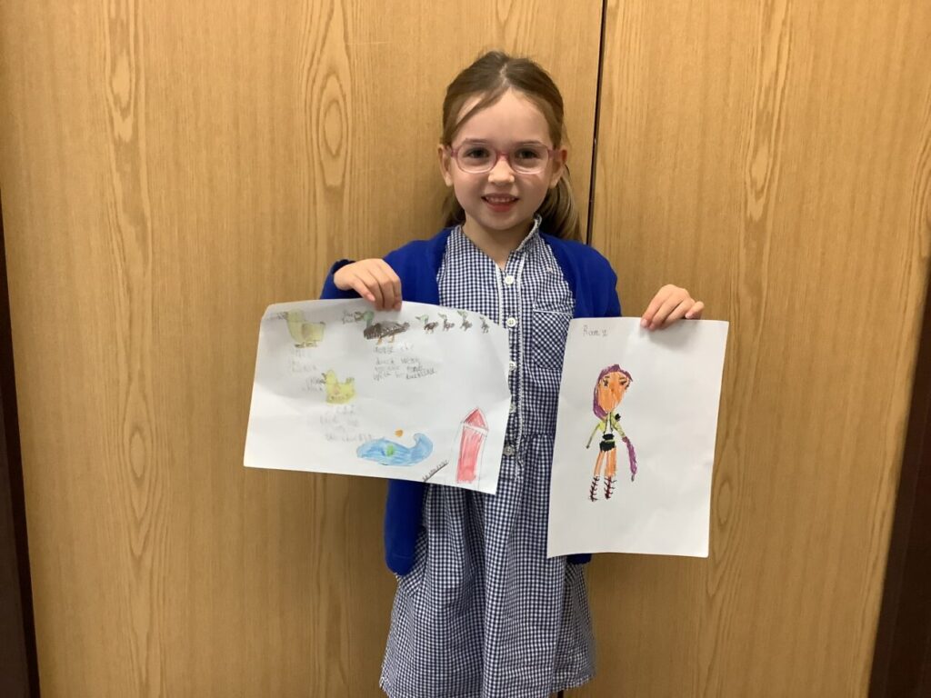 I made a picture of Remi from ‘Kpop Demon Hunters’. I also made a farm picture with chickens and ducks. – Zara