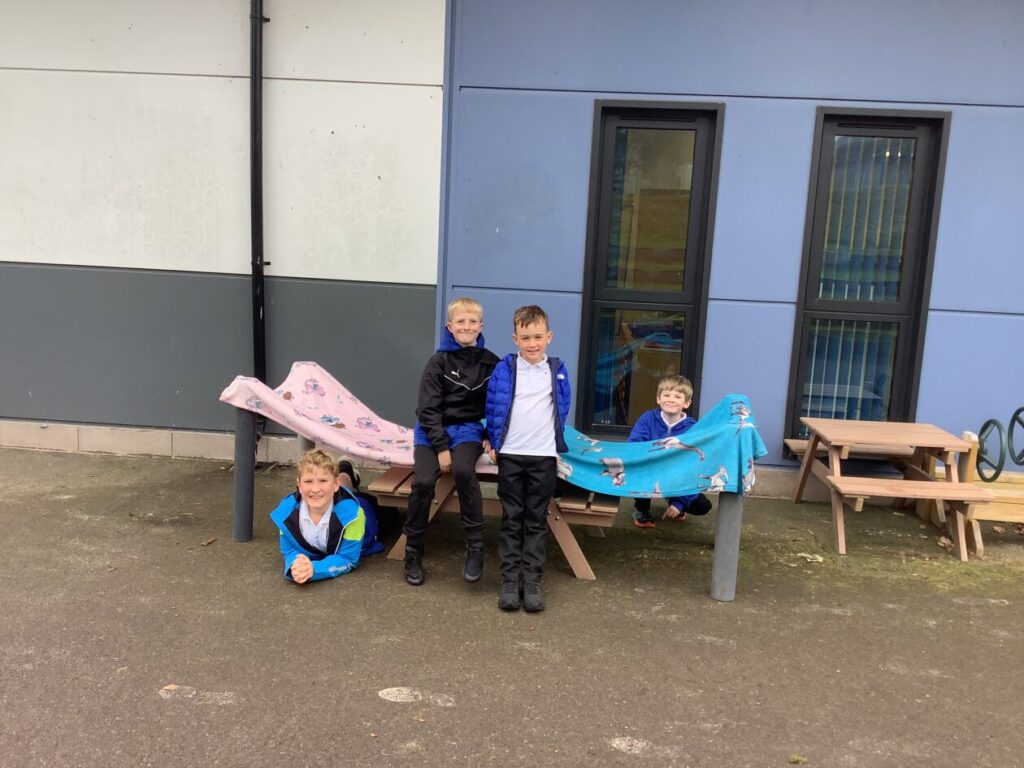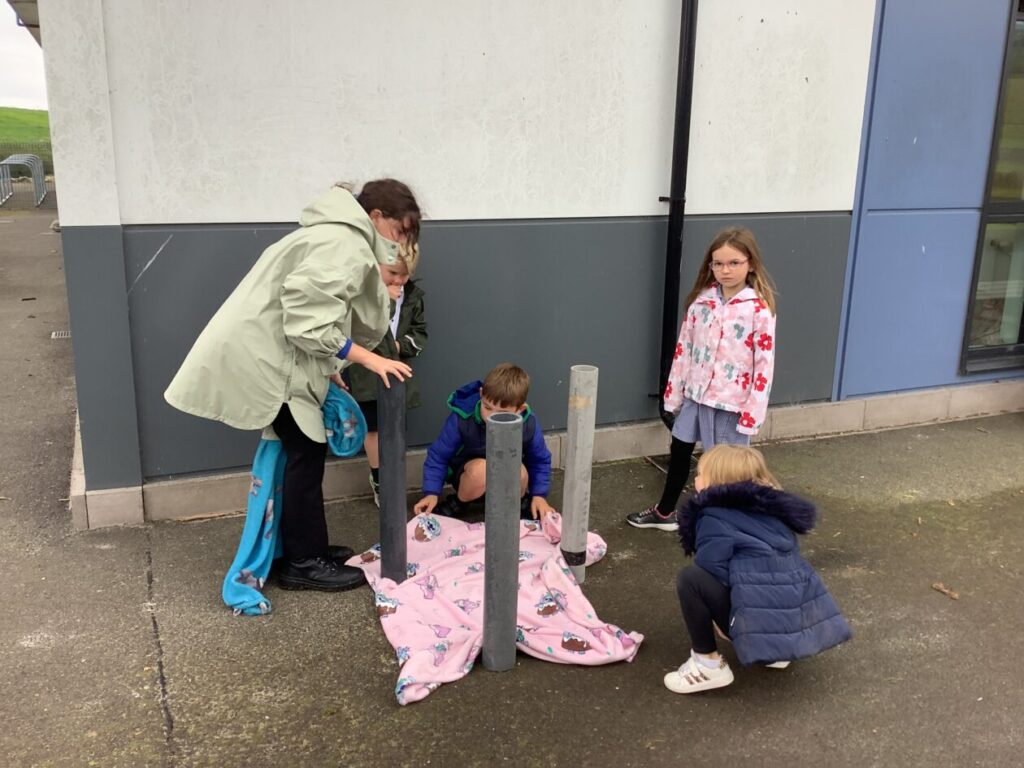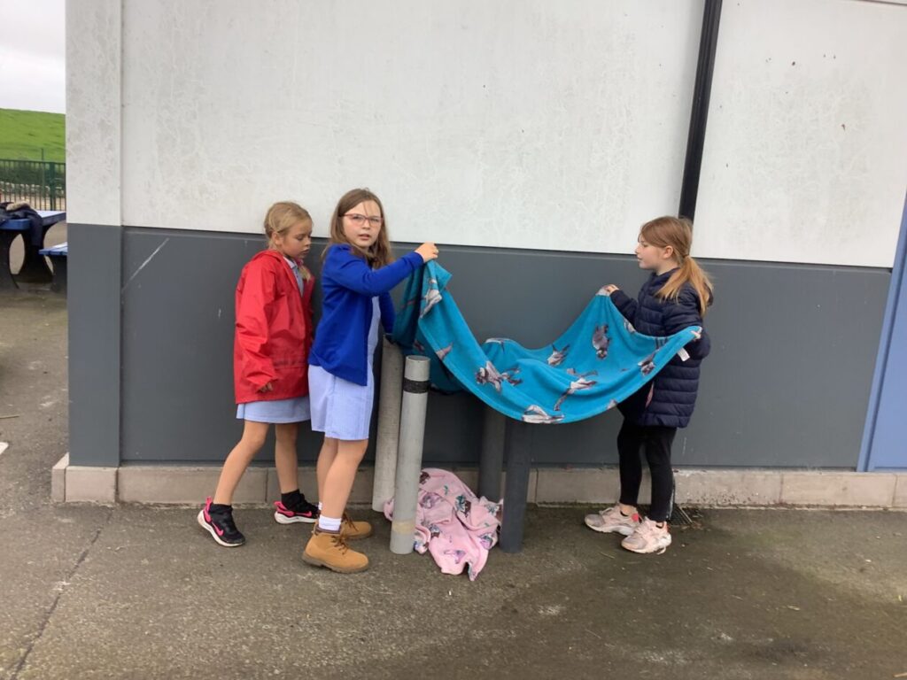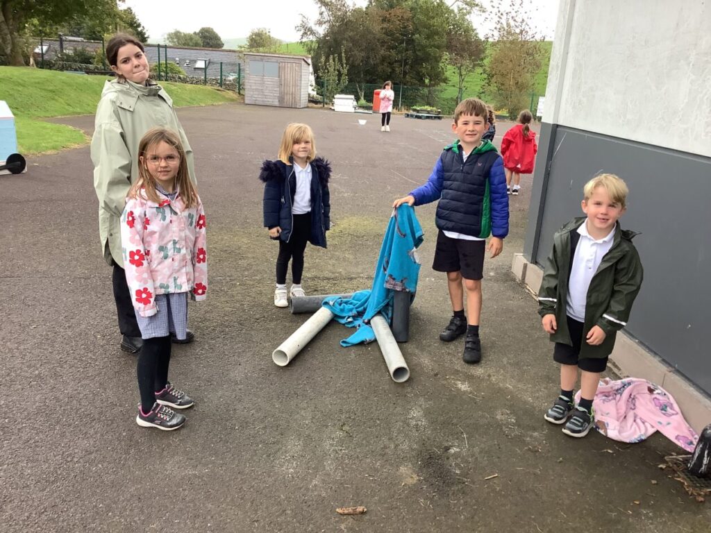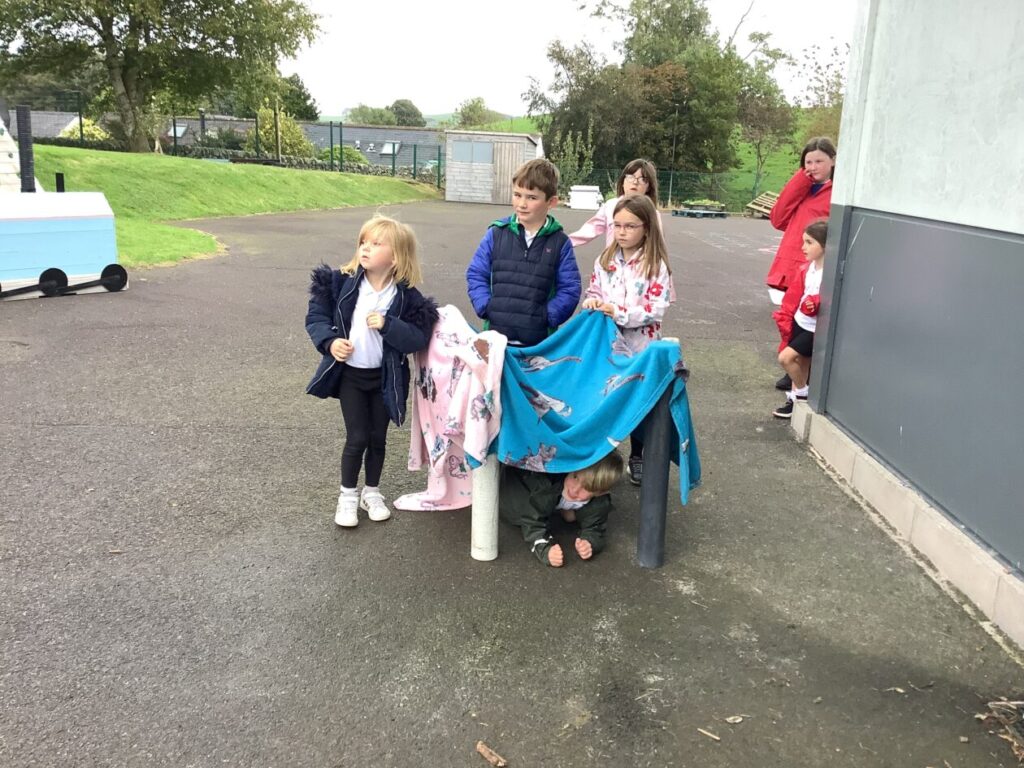 We were making dens for Plop the owl from the story ‘The Owl Who Was Afraid of the Dark’, the yellow class are reading that story just now. Our den kept falling down but we were being resilient and not giving up. He had 2 secret rooms, a toilet and 3 bedrooms. – Lola