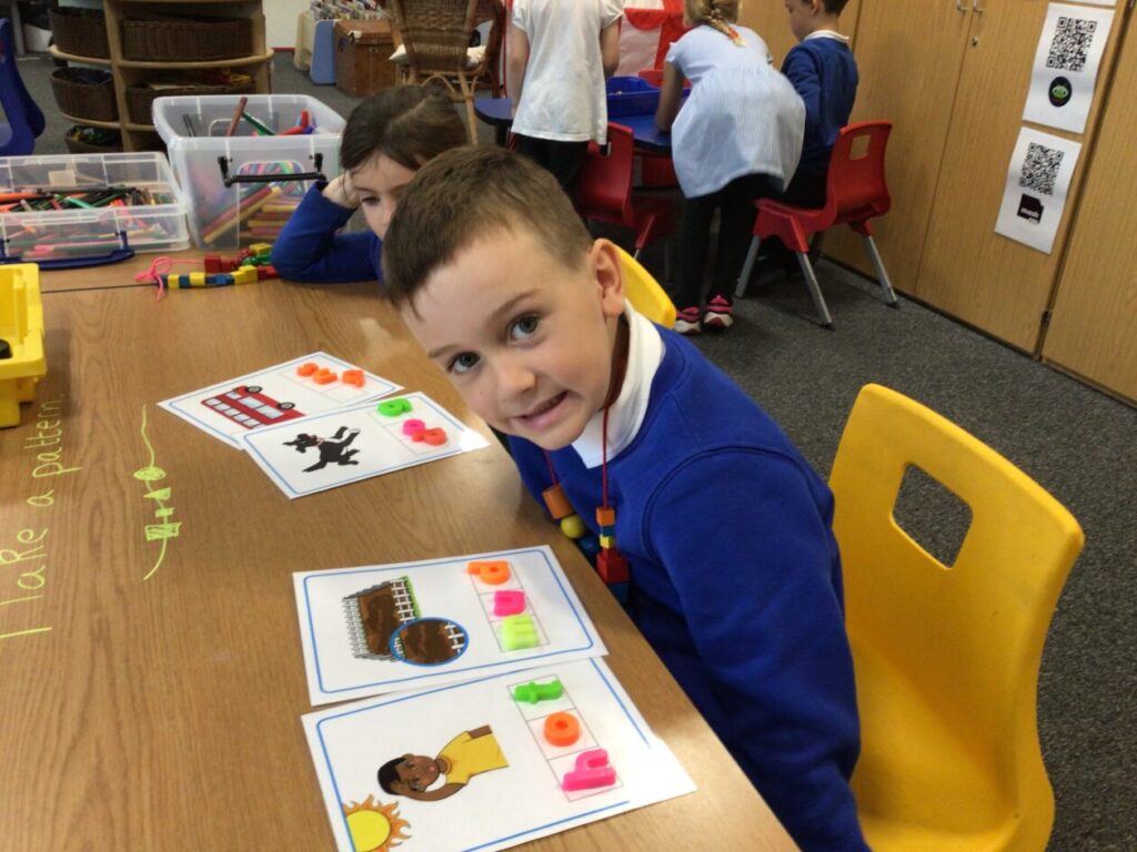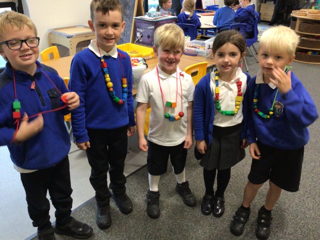 The P1’s were making necklaces using string and little shapes with holes in them. – Rosie