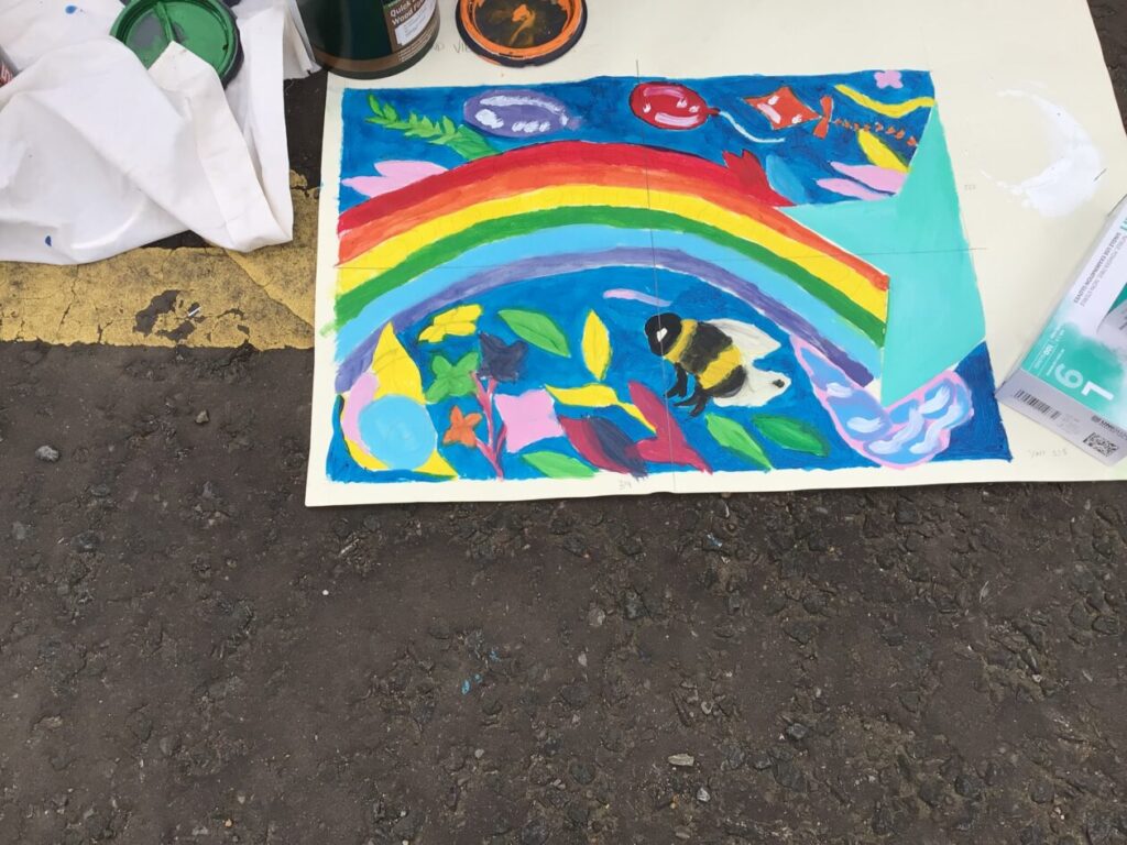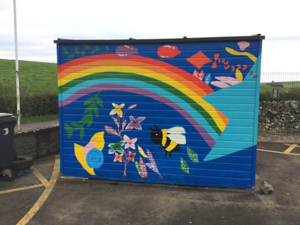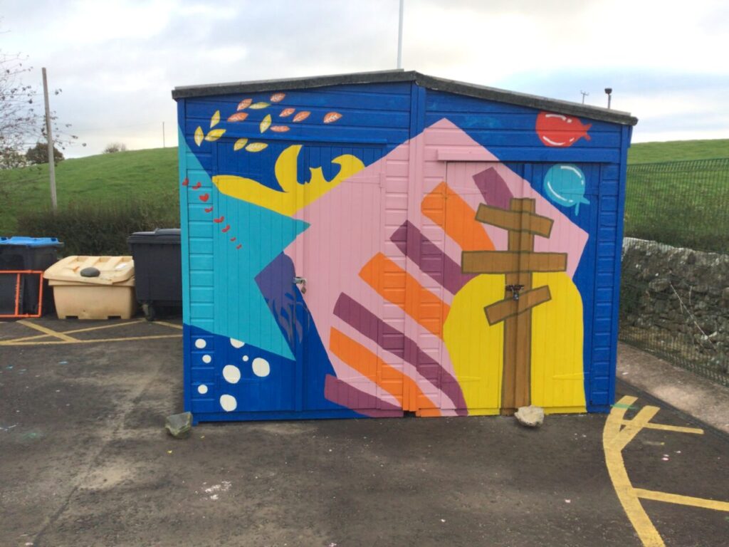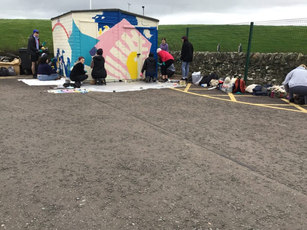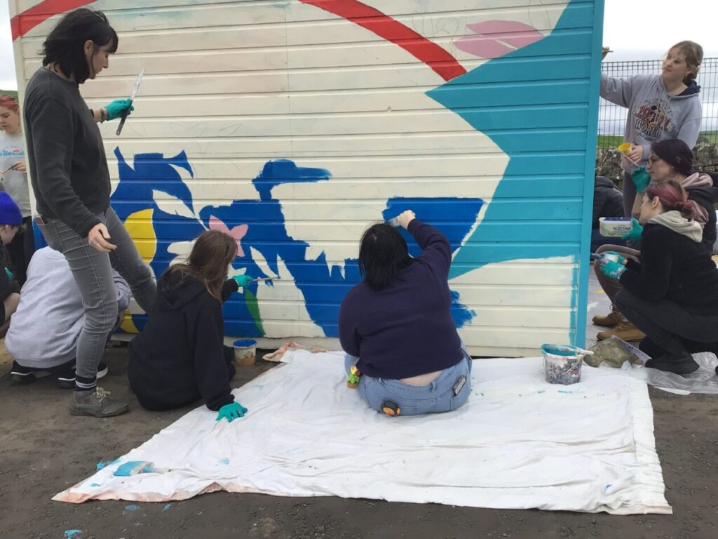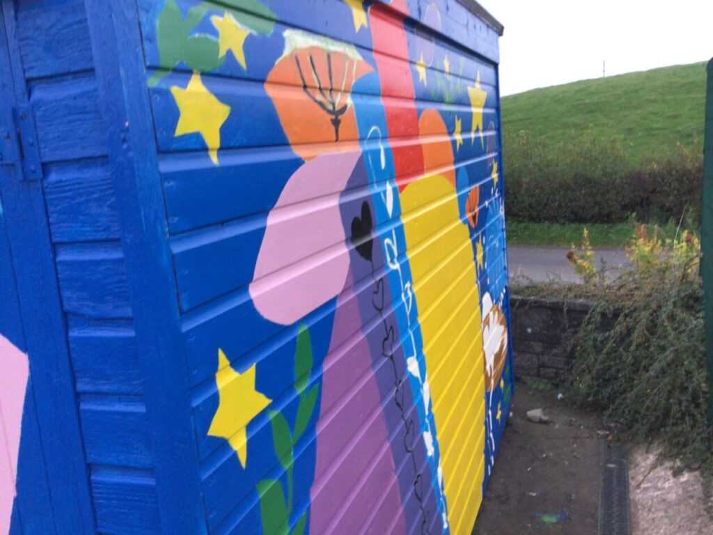 Jesse’s mum and the college students came to paint to shed with our ideas we gave them. I think it looks brilliant! They are coming back after the holidays to do the finishing touches. – Mirren