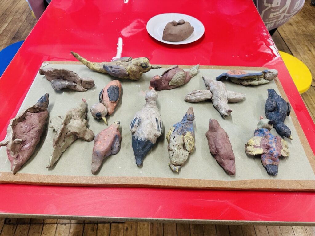 After warming up, pupils moved on to the main project – designing and creating their own individual clay bird. Frances talked them through how to build the bird shape, add wings, tails, beaks and texture, and think carefully about form and detail. Pupils were encouraged to make each bird unique, and the results were amazing – no two were the same!