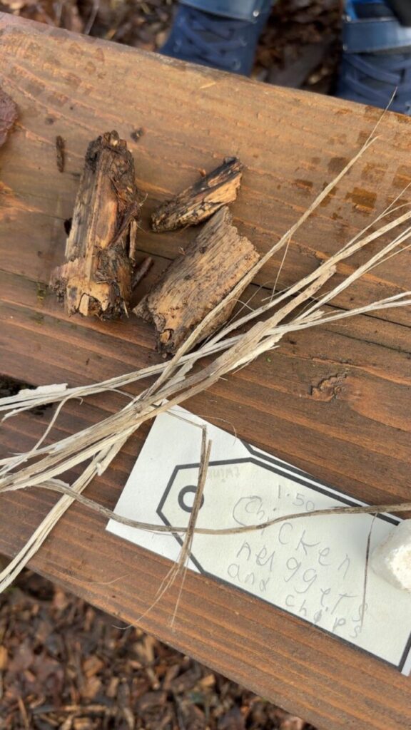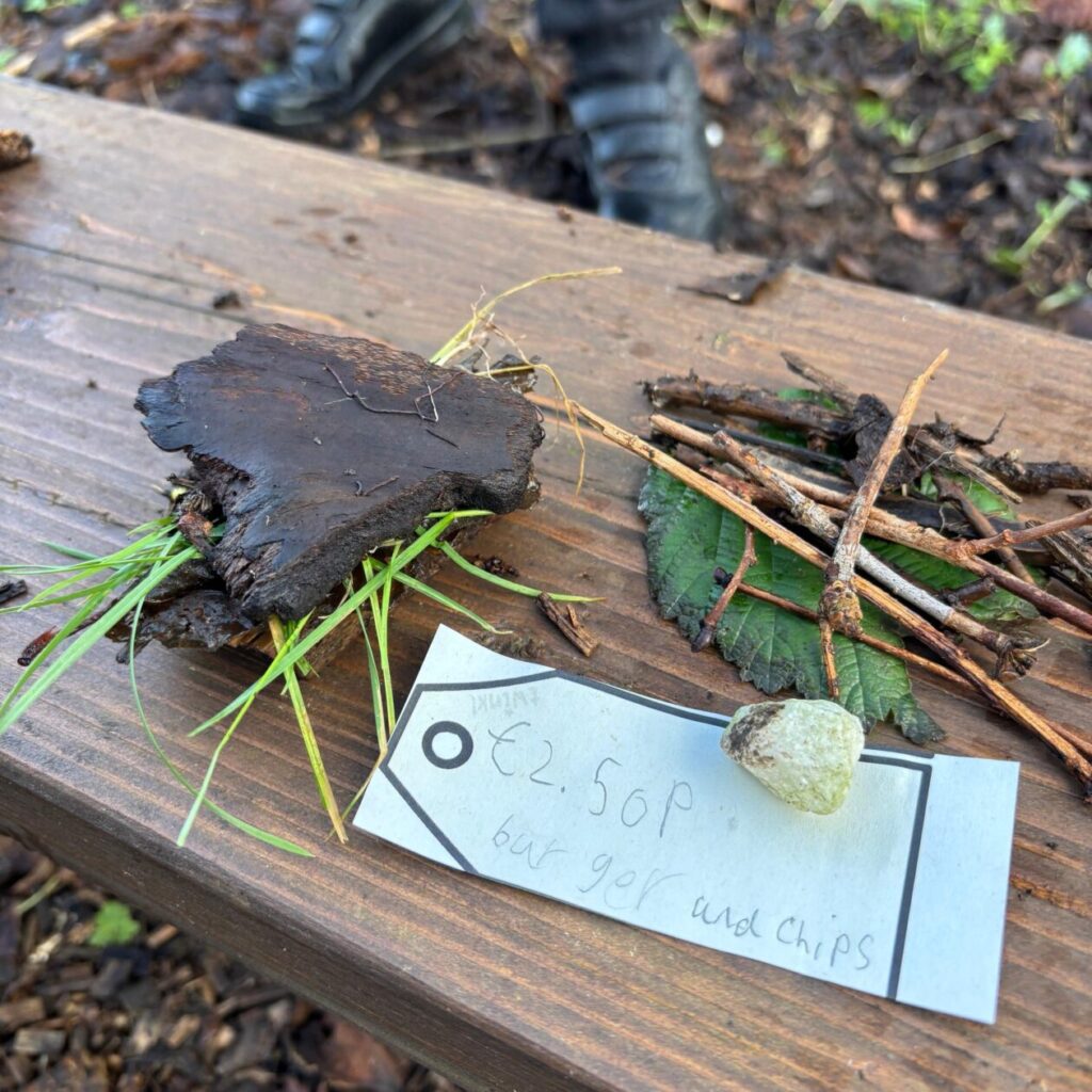 Each group worked together to design their shop, using items such as sticks, stones, leaves and cones as products. Pupils were provided with coins and notes, along with price tags, and were encouraged to decide how much their items should cost. Once their shops were ready, children took turns being shopkeepers and customers, practising key money skills in a fun and meaningful way.