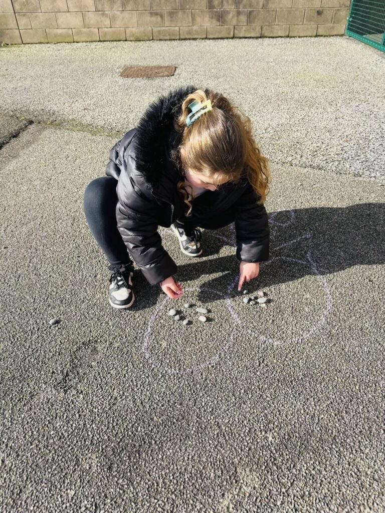 - Division Group: Pupils used stones and chalk to physically share numbers into equal groups. This helped them visualise division and understand how remainders work when numbers cannot be shared exactly.