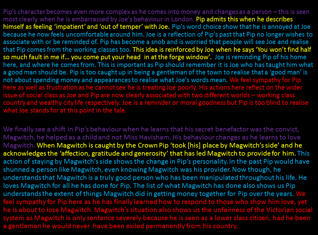 To plan out this essay then we first of all need to think of 5 points from the book that show us Pip is a complex character. There are a lot of points that you could make. Here’s the 5 points we have: