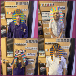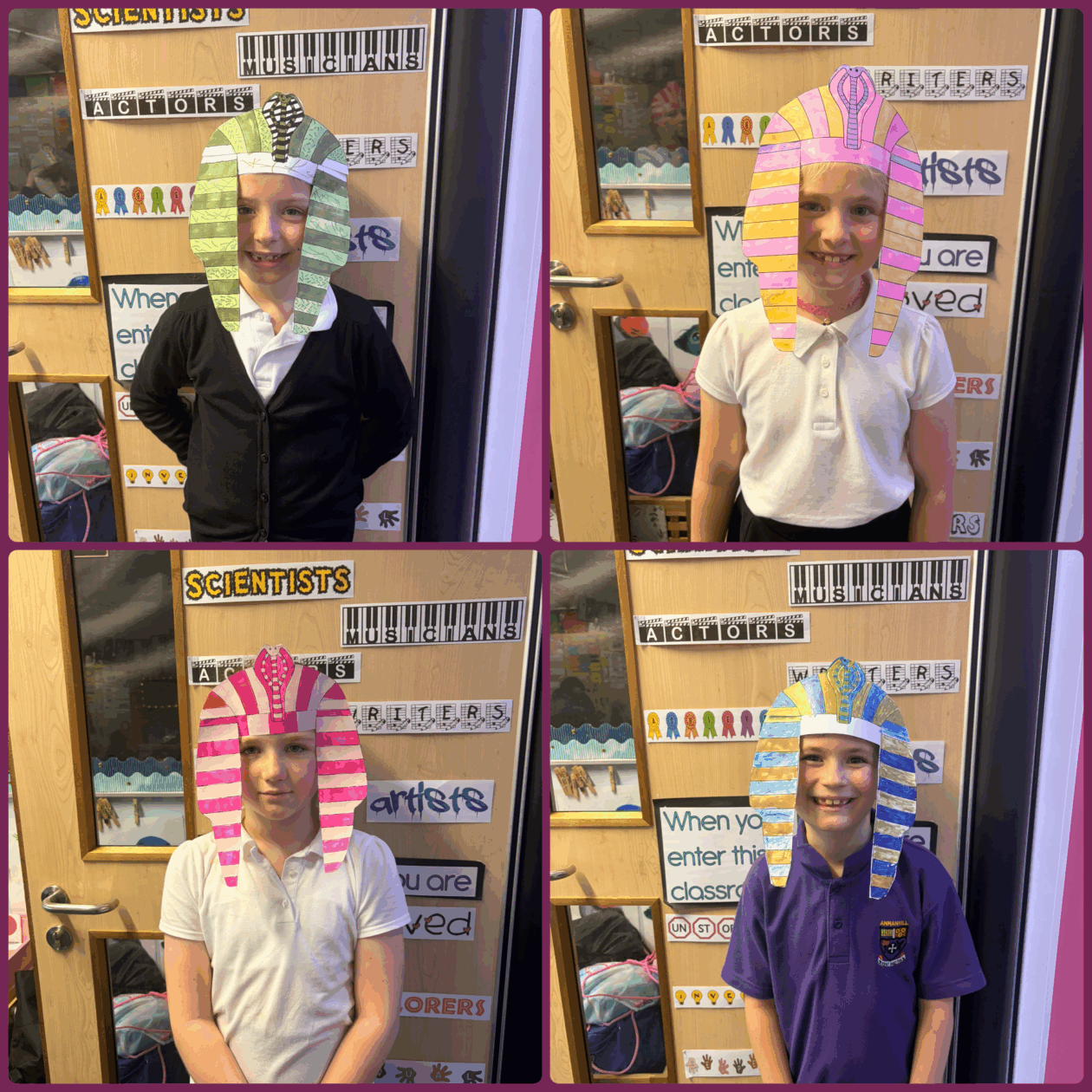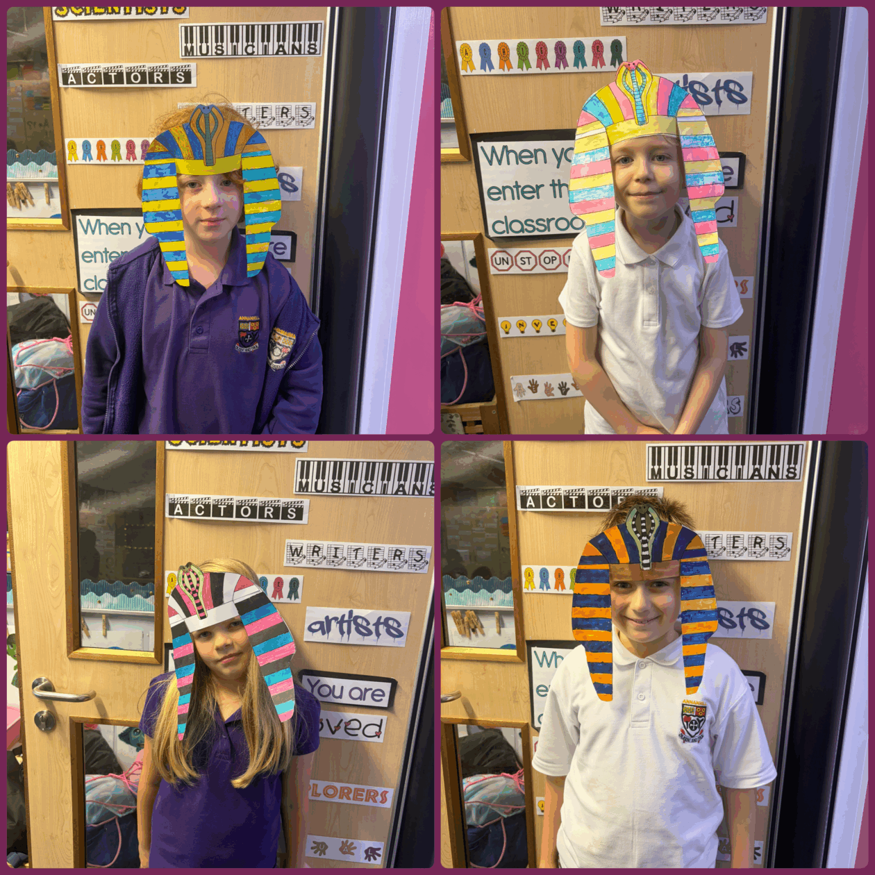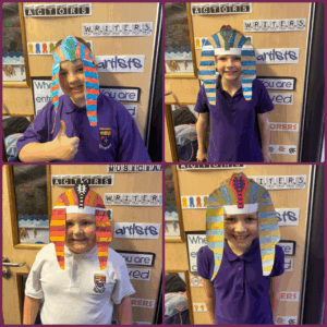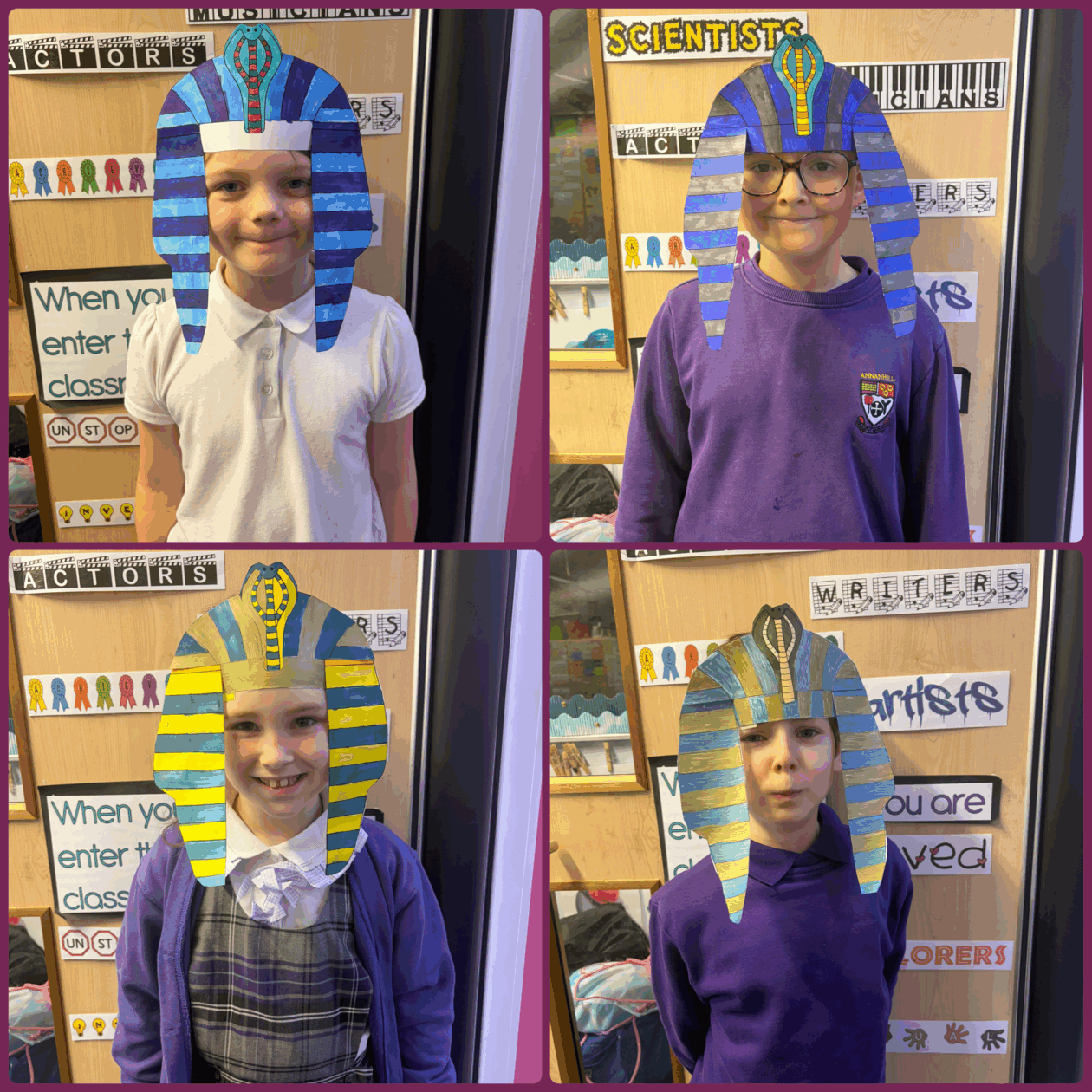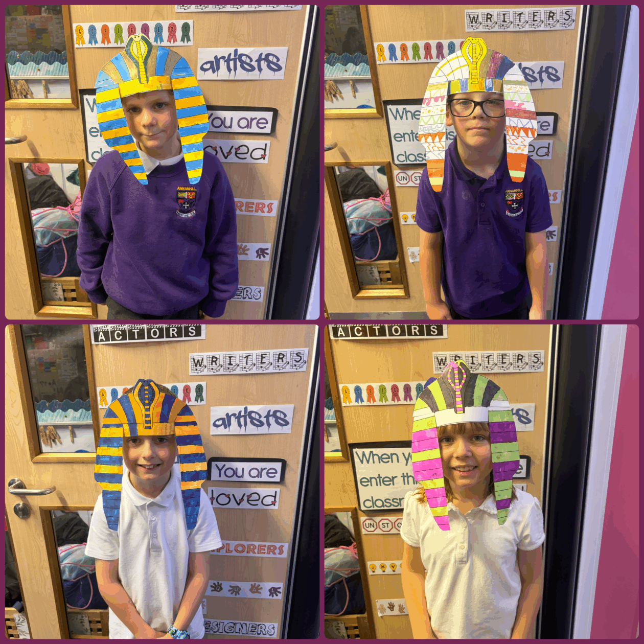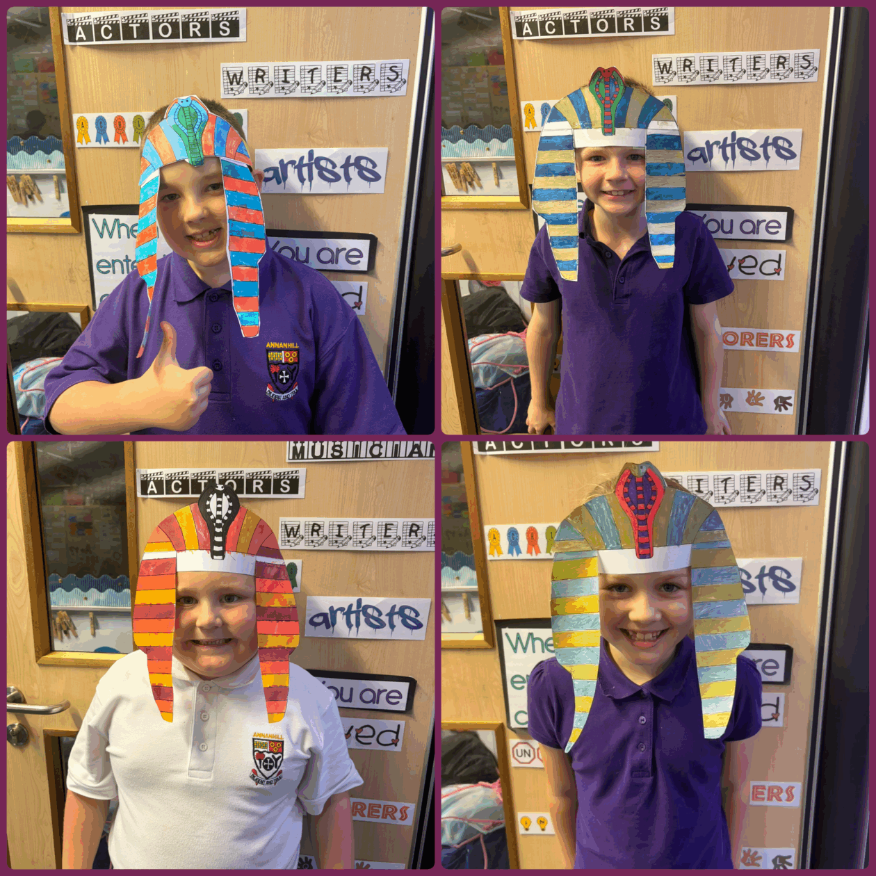 After learning about the Egyptian Pharaohs including Cleopatra and Tutankhamen we created our own headdresses.