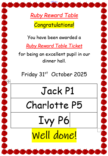 Well done to this week’s winners for being excellent pupils in our dinner hall.