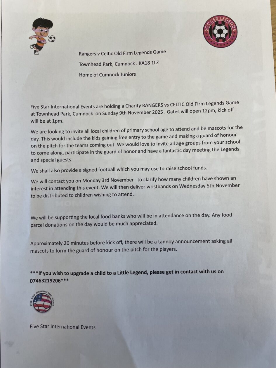 The Parent Council have approached us with an opportunity for pupils to be a football mascot at an upcoming football match.