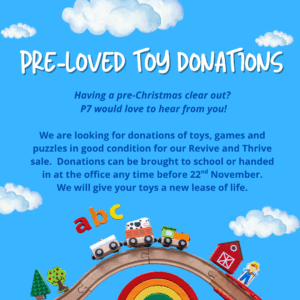 Uncategorized Pre-Loved Toy Donations November 4, 2025 Mrs McCaig Leave a comment Share this: Click to email a link to a friend (Opens in new window) Email Click to share on X (Opens in new window) X Click to print (Opens in new window) Print