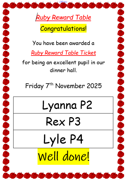 Uncategorized Ruby Reward Table 07.11.2025 November 7, 2025 Mrs Robertson Leave a comment Well done to this week’s winners of the Ruby Reward Table, for their excellent behaviour in our dinner hall. Share this: Click to email a link to a friend (Opens in new window) Email Click to share on X (Opens in new window) X Click to print (Opens in new window) Print