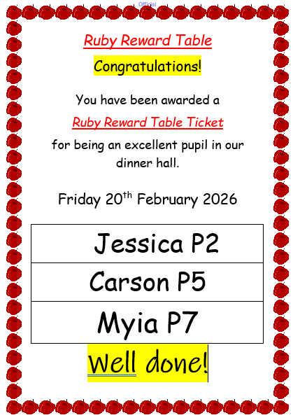 Uncategorized Ruby Reward Table 20.02.26 February 20, 2026 Mrs Robertson Leave a comment Well done to this week’s winners for their excellent behaviour in our dinner hall. Share this: Click to email a link to a friend (Opens in new window) Email Click to share on X (Opens in new window) X Click to print (Opens in new window) Print