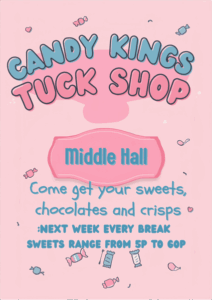The Candy Kings are holding a tuck shop next week from Monday-Thursday. We will be set up in the middle hall area where the P3&4s line up. We will be selling chocolates, sweets and crisps from 5p to 60p. Please bring small change. Come and enjoy our tasty treats.