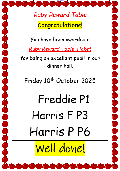 Well done to this week’s winners, for being excellent pupils in our dinner hall.
