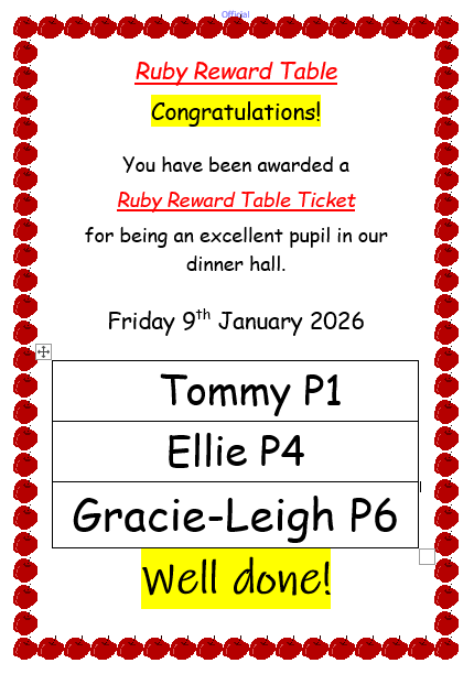 Well done to this week’s winners of the Ruby Reward Table, for being excellent pupils in our dinner hall.