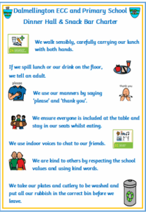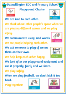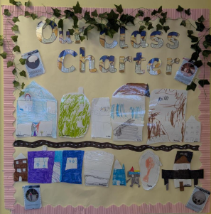 All classes discuss and agree a Class Charter at the beginning of every school year which is displayed in the classroom. Pupils have created Playground and Dinner Hall & Snack Bar Charters to ensure all rights are respected around our school.