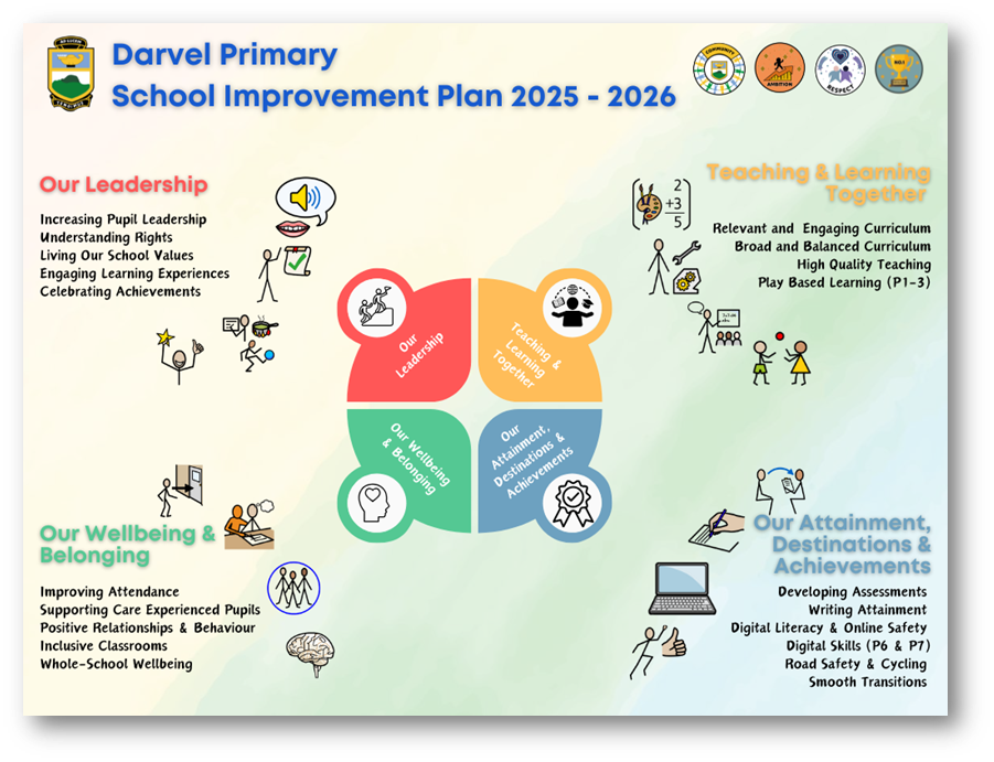 A more detailed version can be found here: Darvel Primary School – School Improvement Plan 2025-2026 (Final)