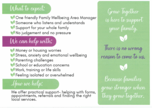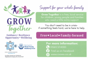 Grow Together is a free, family focussed service in East Ayrshire, designed to support children, young people and families who may need extra help, even if they are not in crisis.  The service emphasises listening, understanding and providing practical support without judgement or pressure, helping families grow stronger together.