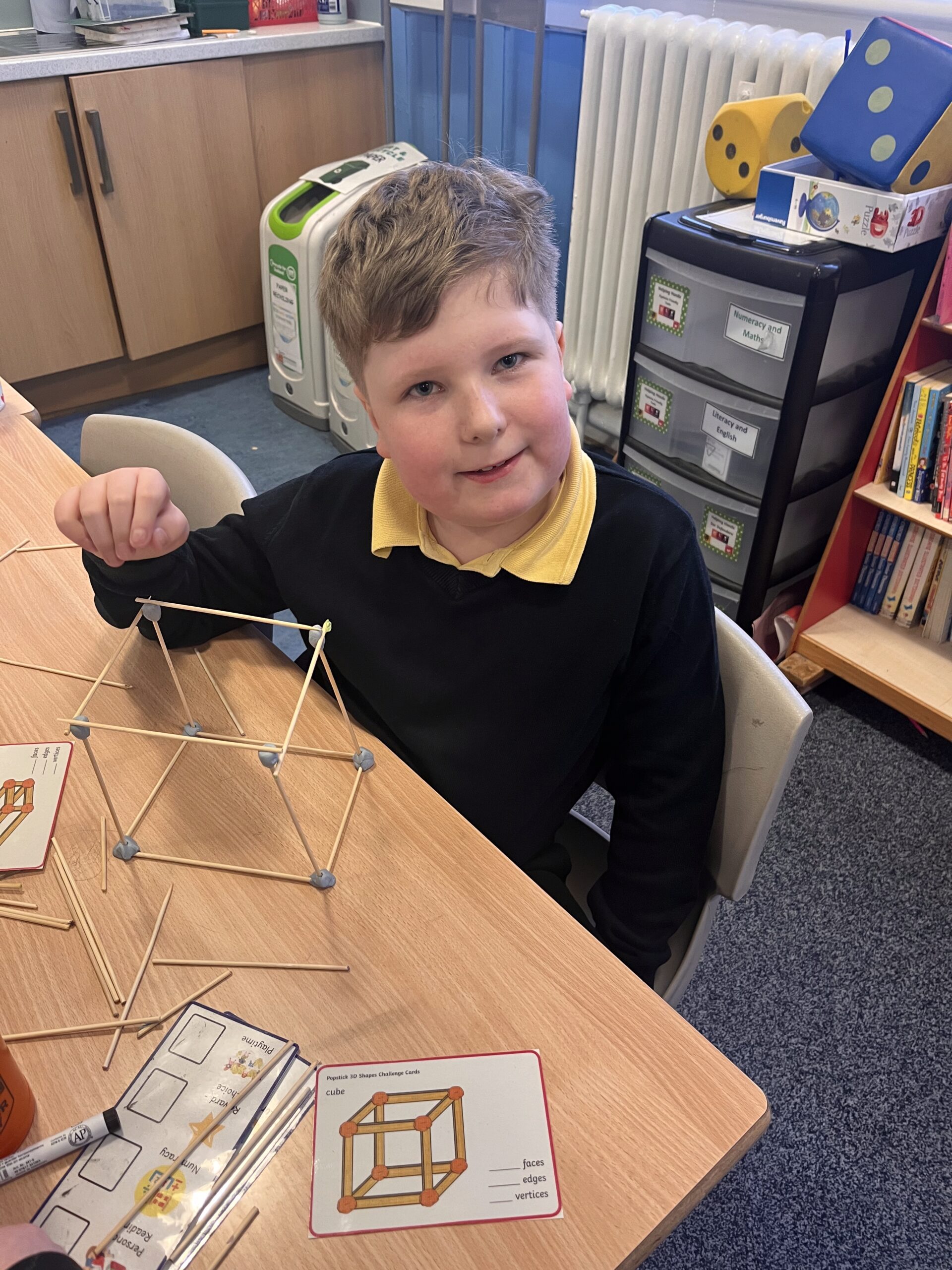 We had great fun using the knowledge we had learnt to create models of 3D shapes.  It was tricky at times getting the sticks together, but everyone showed patience and perseverance.  Well done!