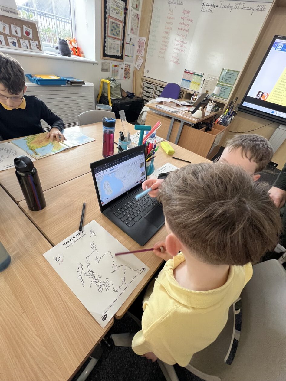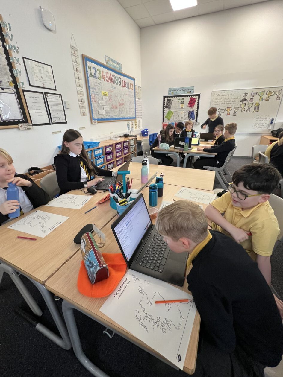 During our topic “150 Years of the Scottish Cup”, the boys and girls in P5/6 developed their mapping skills by locating the football teams involved in the Scottish Cup on a map of Scotland. The children used digital technology, including an online map and an atlas, to find each team and then pinpoint their locations on a blank map.